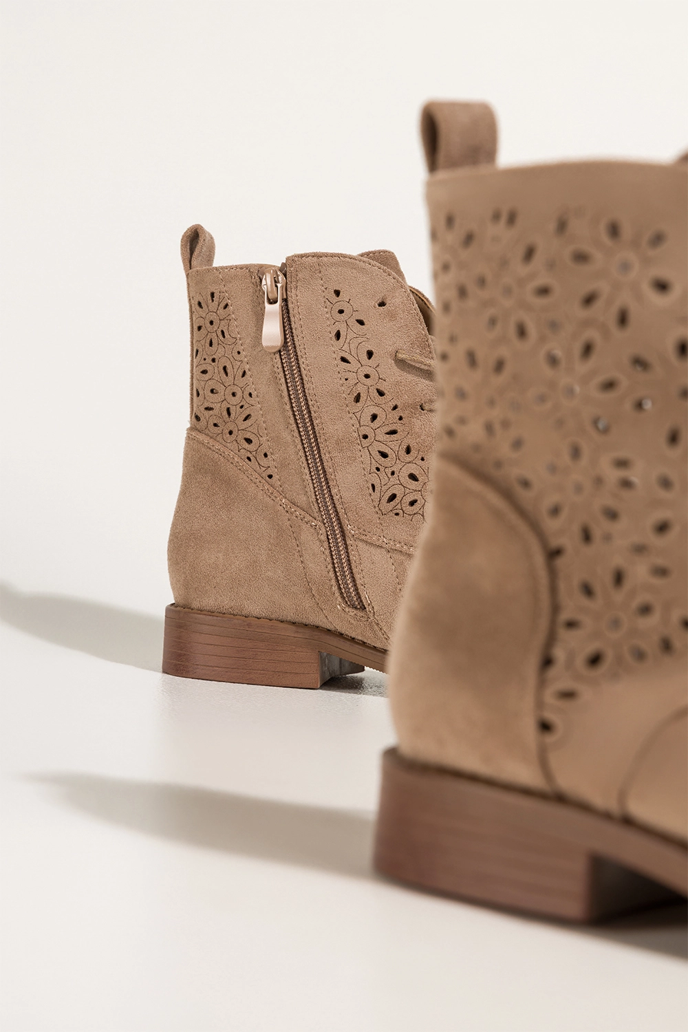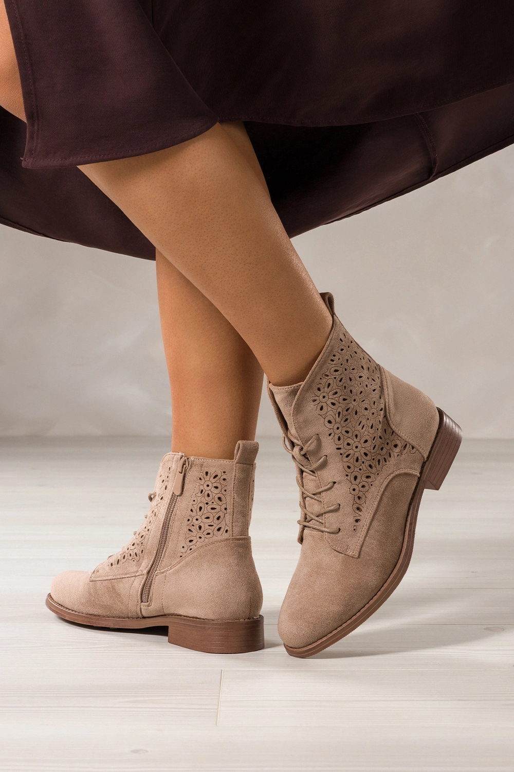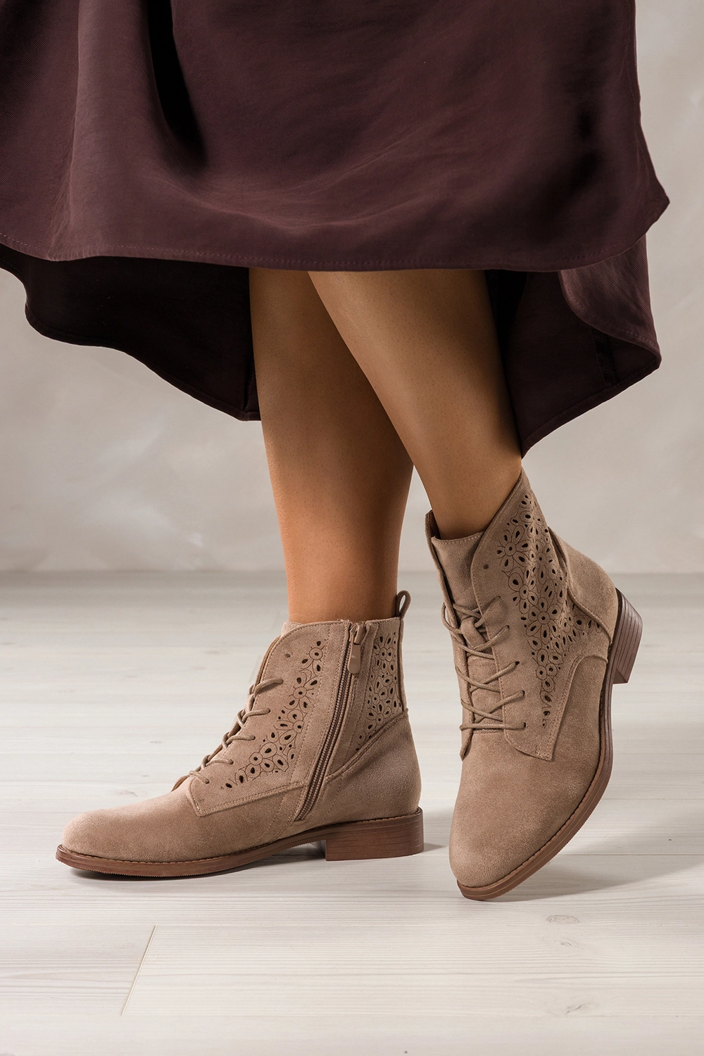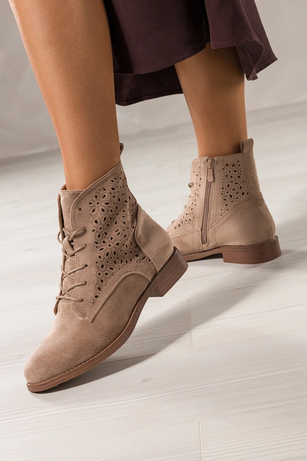 Beżowe botki damskie ażurowe płaskie sznurowane Carla model S7680-7 to propozycja, która zachwyca zarówno subtelnością designu, jak i praktycznością użytkowania. Te niezwykle kobiece buty, wykonane z wysokogatunkowego zamszu ekologicznego, doskonale wpisują się w najnowsze trendy mody, jednocześnie gwarantując komfort i wygodę na co dzień. Dzięki ażurowej cholewce, botki nie tylko pięknie wyglądają na nodze, ale także zapewniają idealną cyrkulację powietrza, co czyni je znakomitym wyborem na wiosenne i letnie dni. Ich uniwersalny, beżowy kolor sprawia, że z łatwością dopasujesz je do każdej stylizacji – od miejskich zestawów z jeansami, po romantyczne sukienki w stylu boho.
