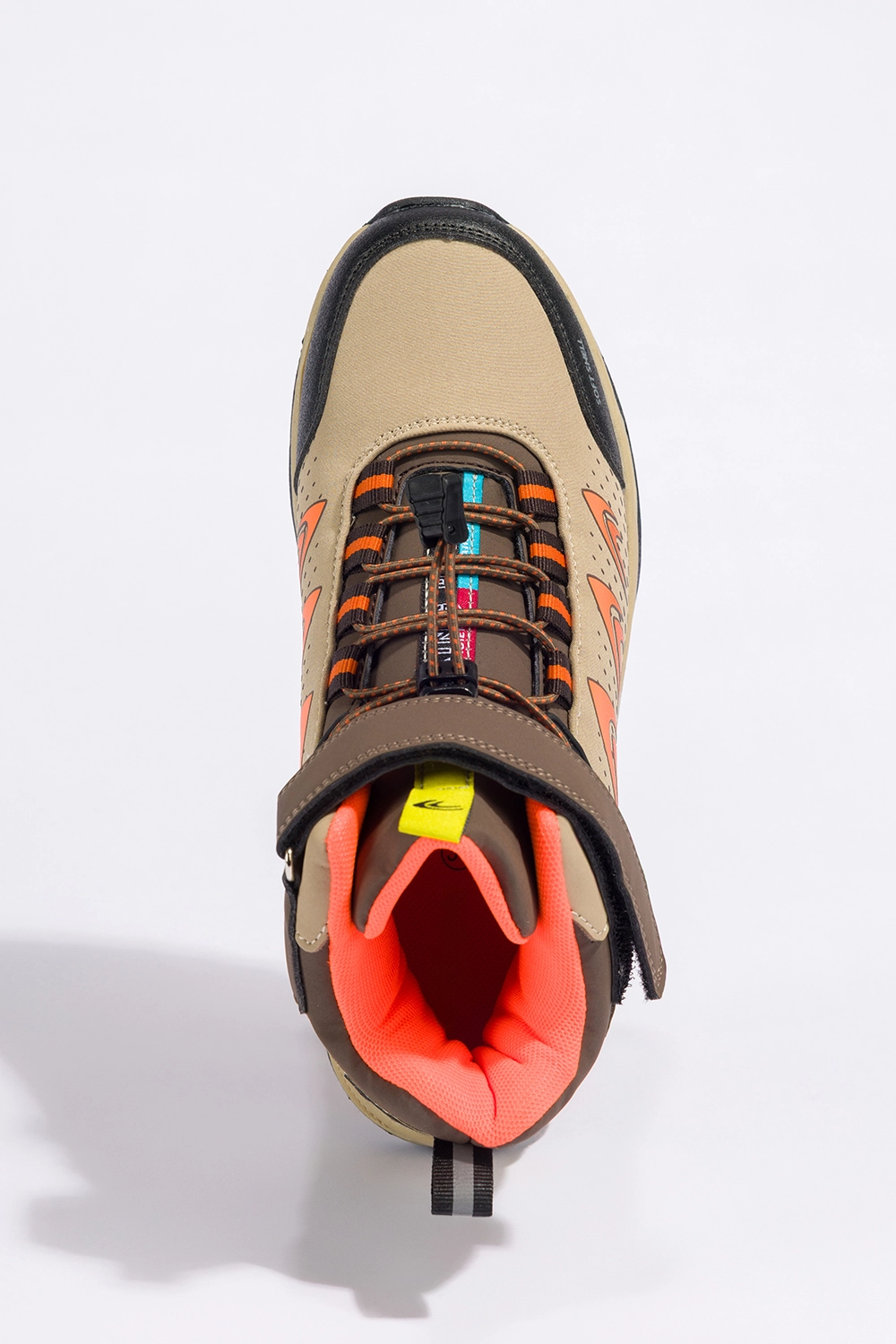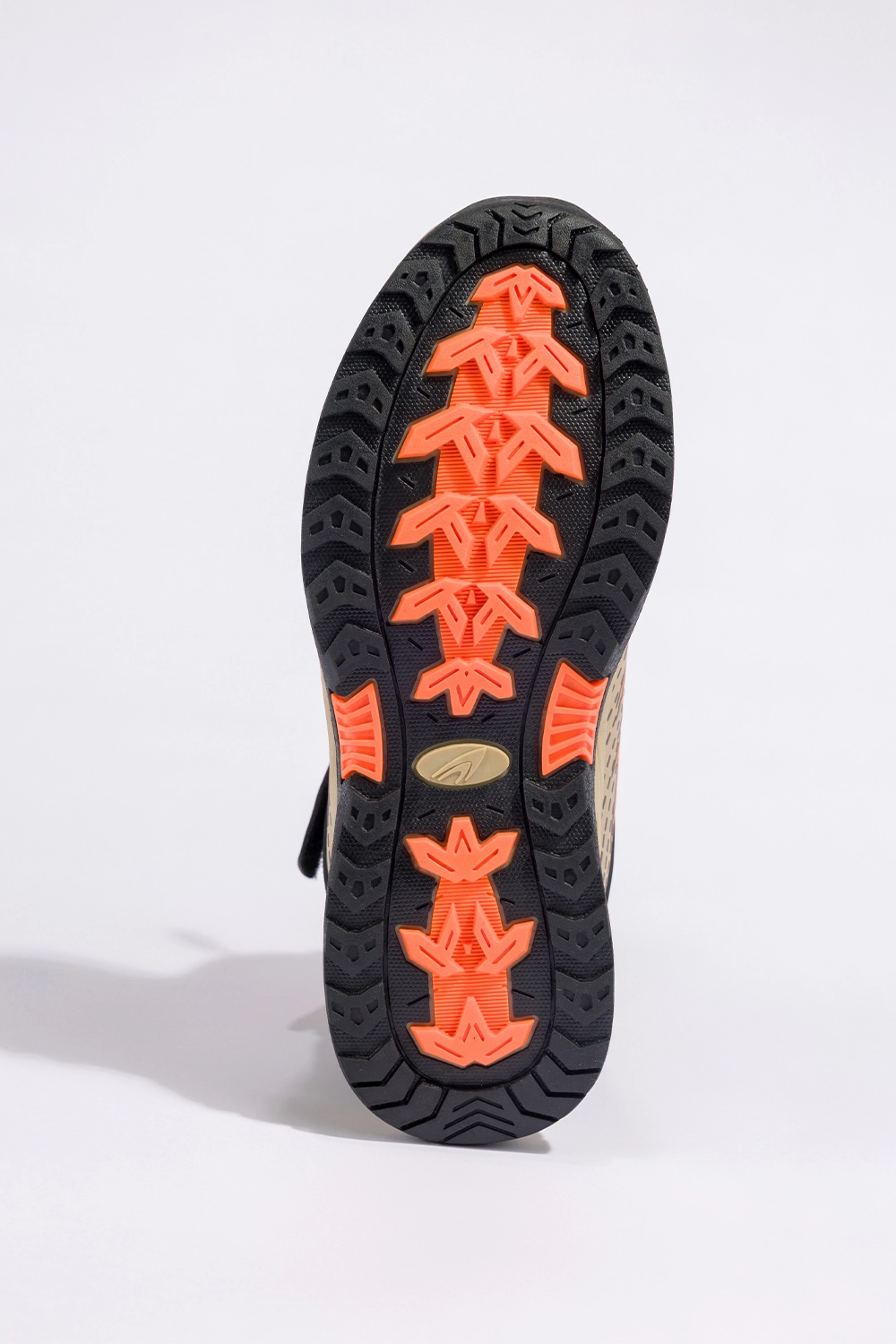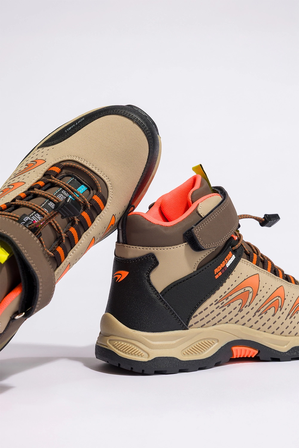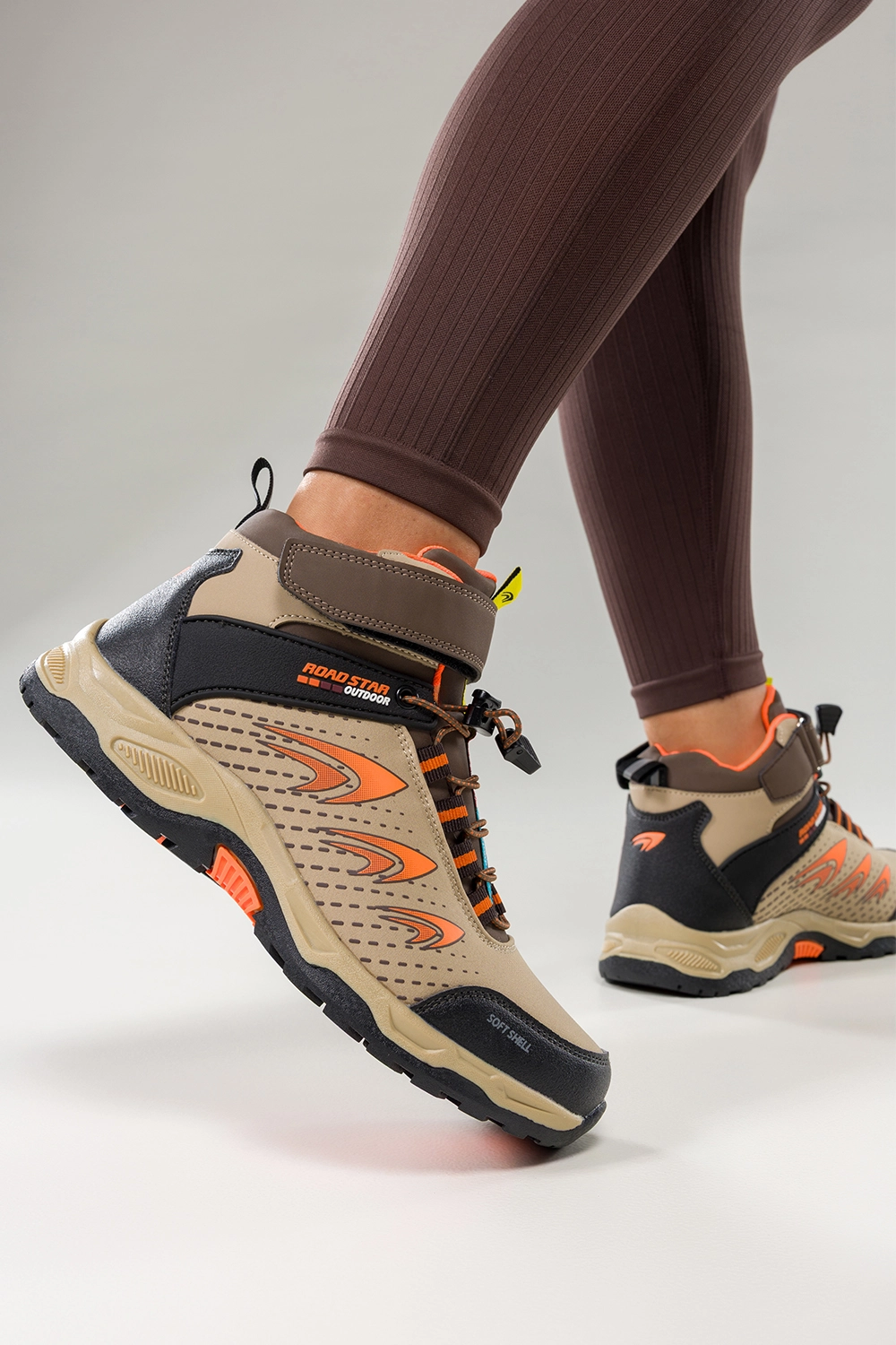 Buty trekkingowe model 2310-8W łączą w sobie klasyczny beż z energetycznymi pomarańczowymi wstawkami, które nadają im dynamicznego i nowoczesnego charakteru. Takie zestawienie kolorystyczne wyróżnia się na tle standardowych, stonowanych modeli, jednocześnie zachowując wszechstronność. Pasują zarówno do sportowych legginsów, jak i casualowych jeansów czy outdoorowej kurtki. Dodatkowe brązowe sznurówki z pomarańczowymi detalami umożliwiają personalizację wyglądu, co pozwala dostosować styl obuwia do własnych upodobań. Zaokrąglony nosek i funkcjonalny pasek na rzep w górnej części cholewki nie tylko zwiększają komfort noszenia, ale również nadają butom modnego, dopracowanego wyglądu. To idealne rozwiązanie dla kobiet, które cenią zarówno estetykę, jak i praktyczność.