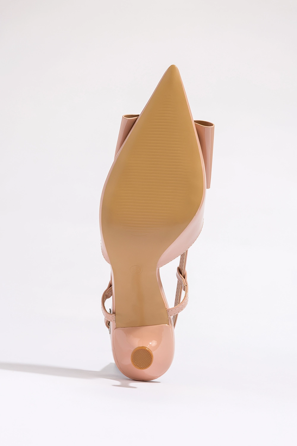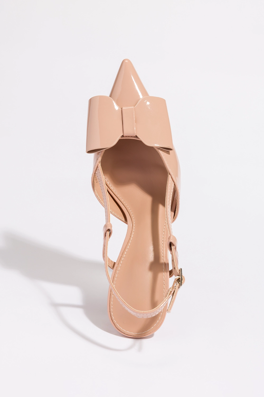 Beżowe czółenka damskie lakierowane z kokardą odkryta pięta obcas kieliszek Carla HD53-7