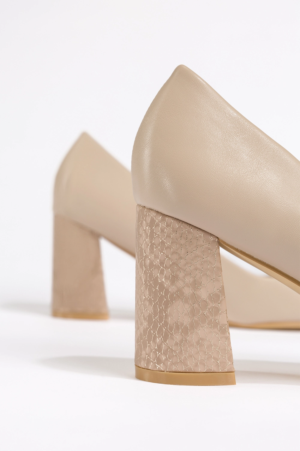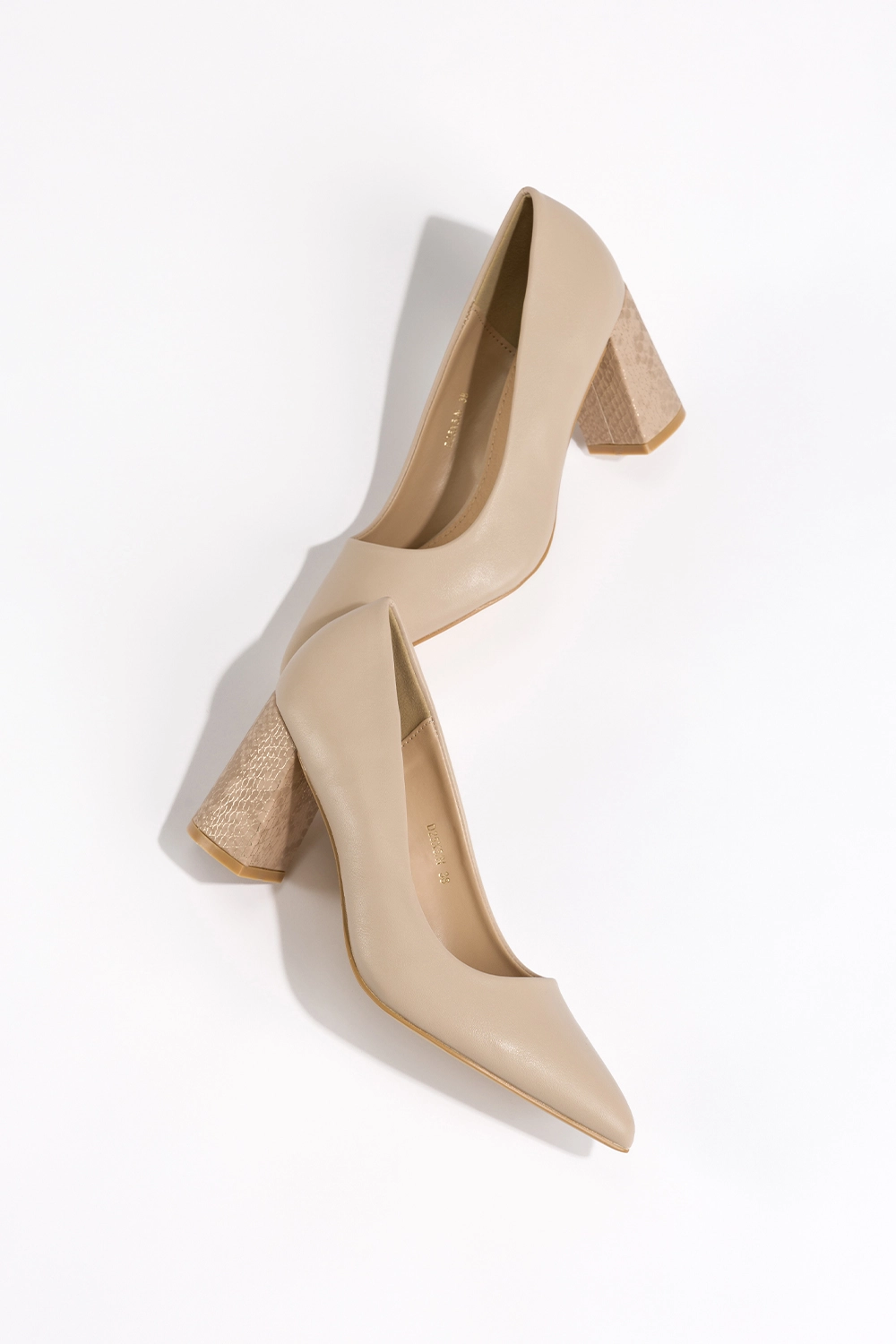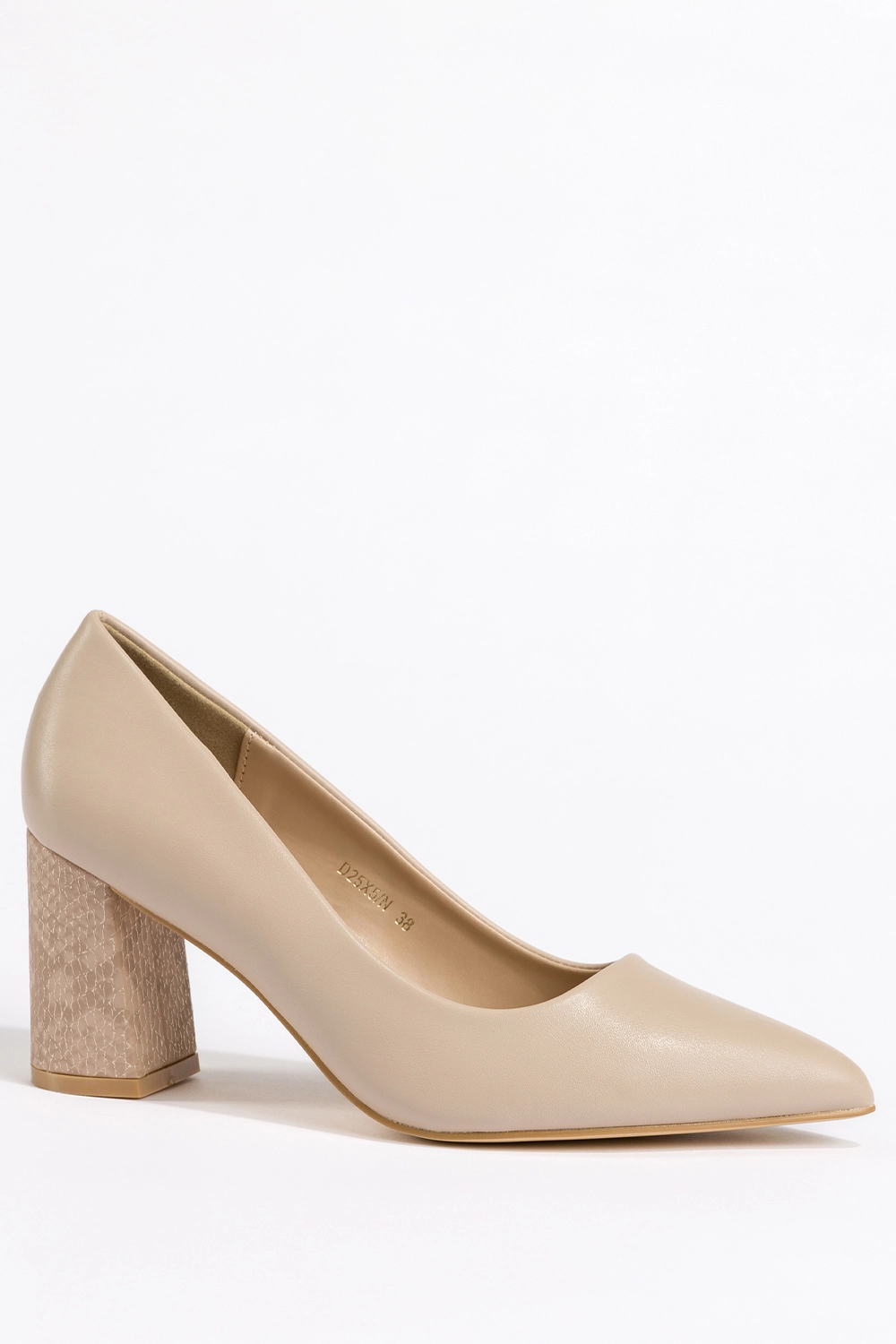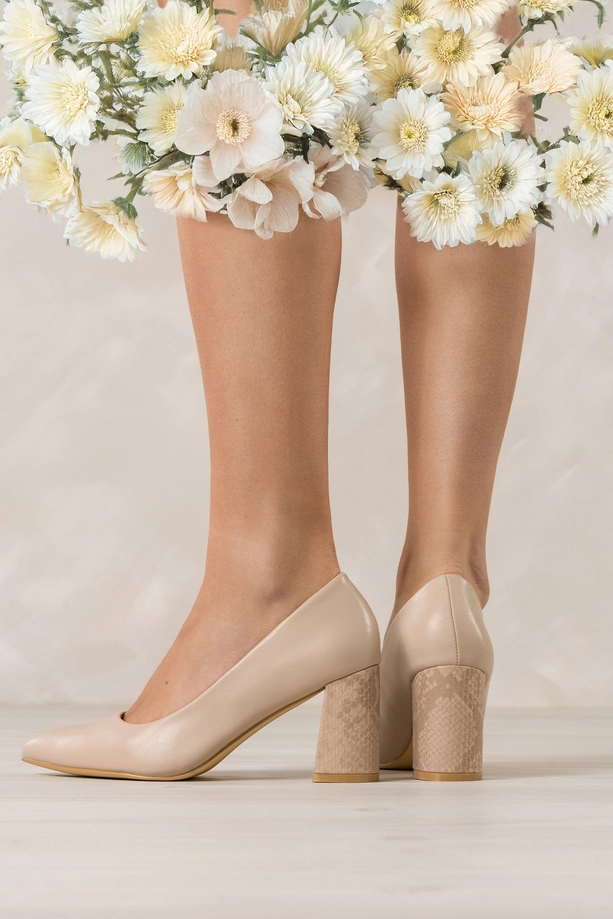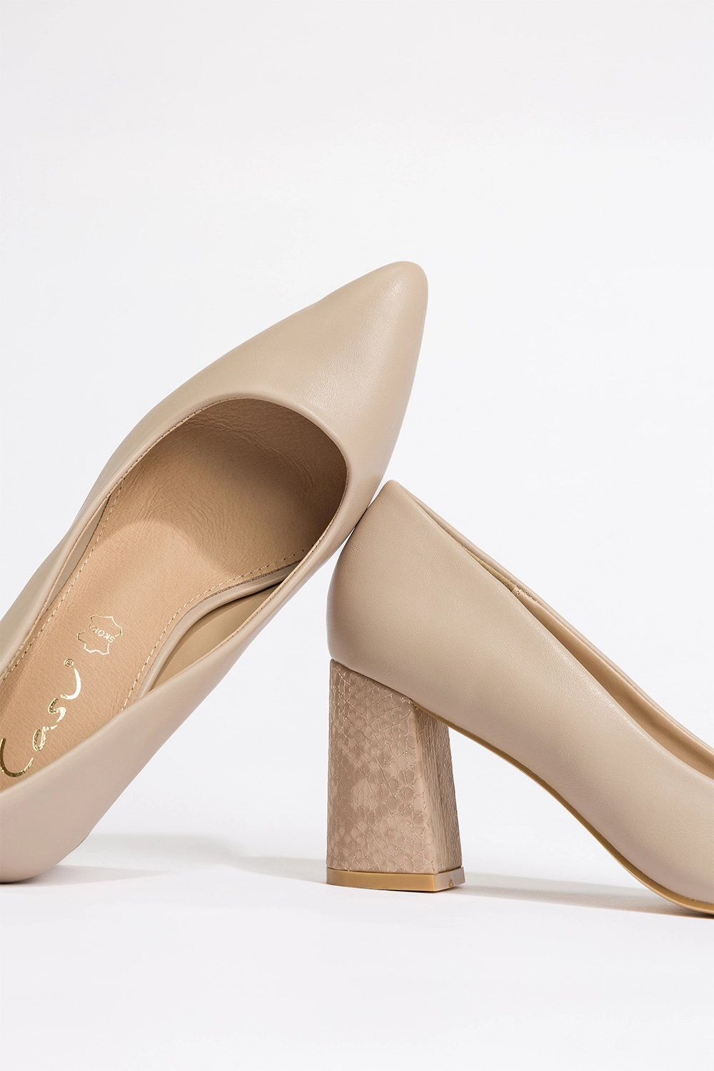 Beżowe czółenka damskie na ozdobnym słupku z błyszczącym wzorem wężowym skórzana wkładka Casu model D25X5-N to wyjątkowa propozycja dla kobiet, które cenią sobie elegancję, komfort oraz oryginalny design. Wyróżniają się perfekcyjnym wykonaniem z wysokogatunkowej skóry ekologicznej, co zapewnia nie tylko trwałość, ale także znakomite dopasowanie do stopy. Ich subtelny odcień beżu sprawia, że są niezwykle uniwersalne, a błyszczący wzór wężowy na obcasie dodaje im unikalnego charakteru. To idealne obuwie dla kobiet poszukujących wyrafinowanego stylu na co dzień i na wyjątkowe okazje.