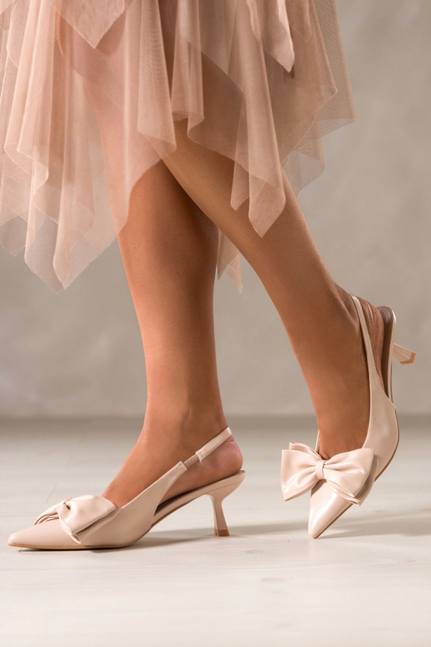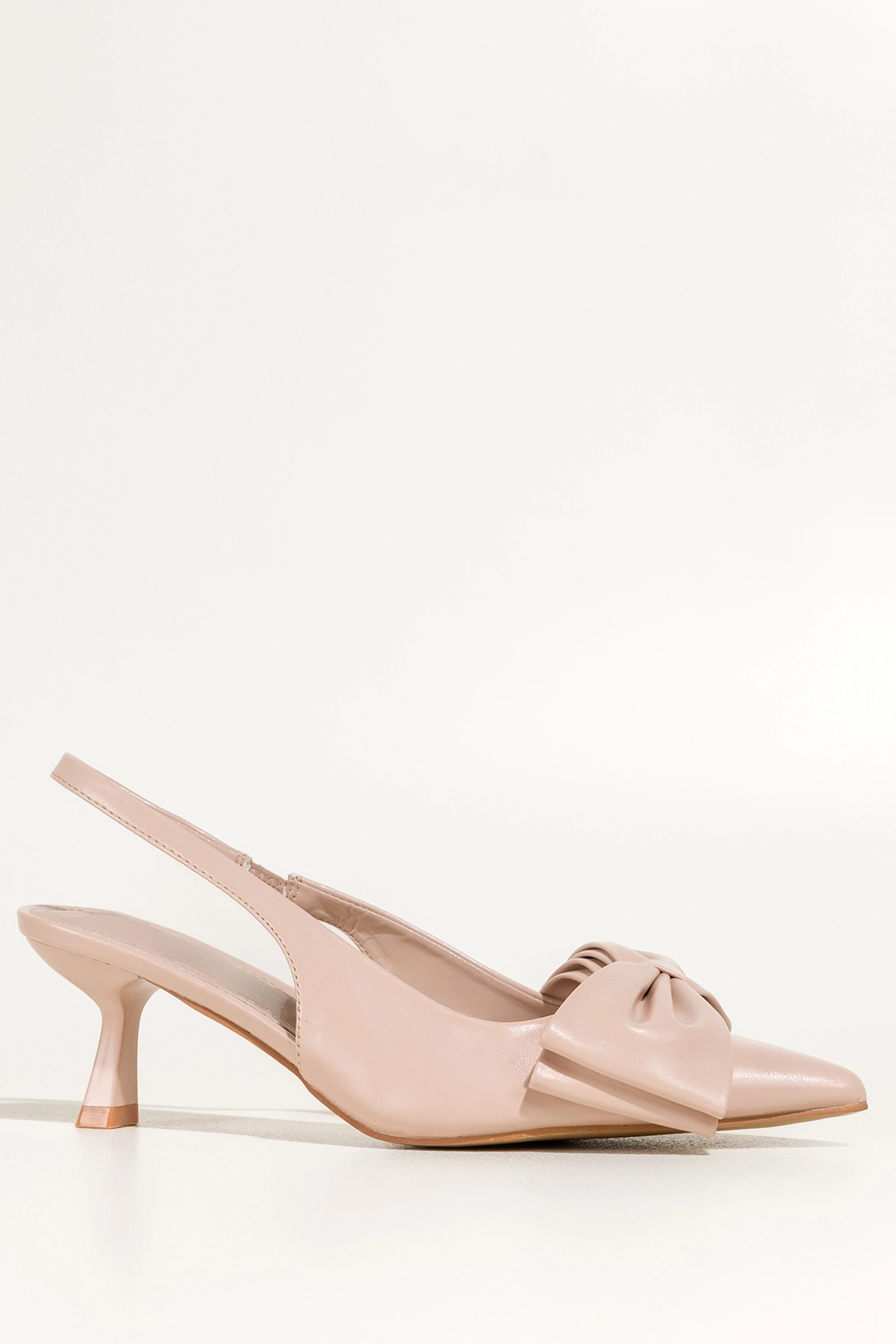 Beżowe czółenka damskie z kokardą obcas kieliszek odkryta pięta elastyczna guma w pasku Carla N892