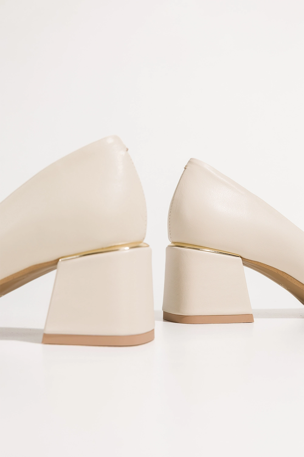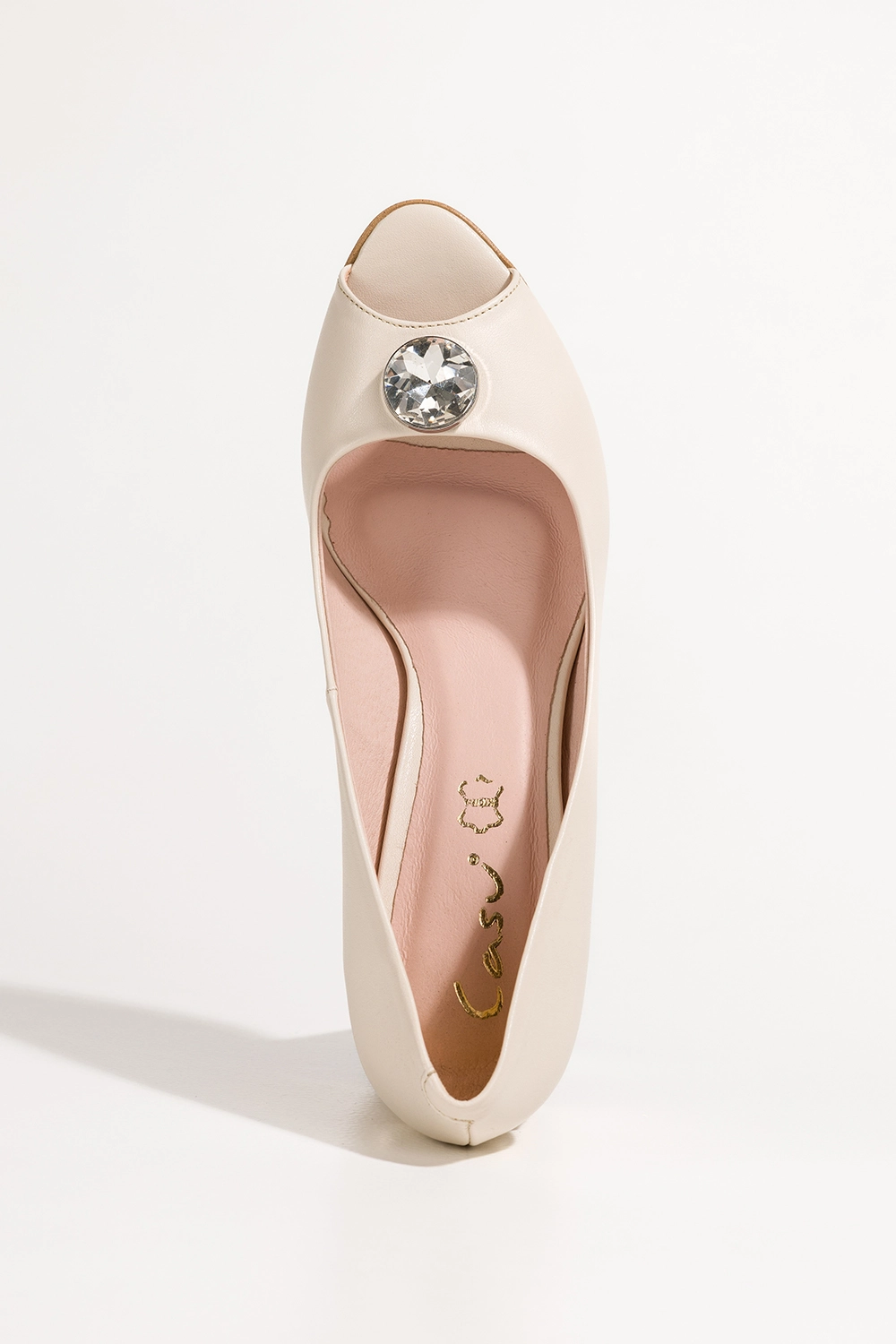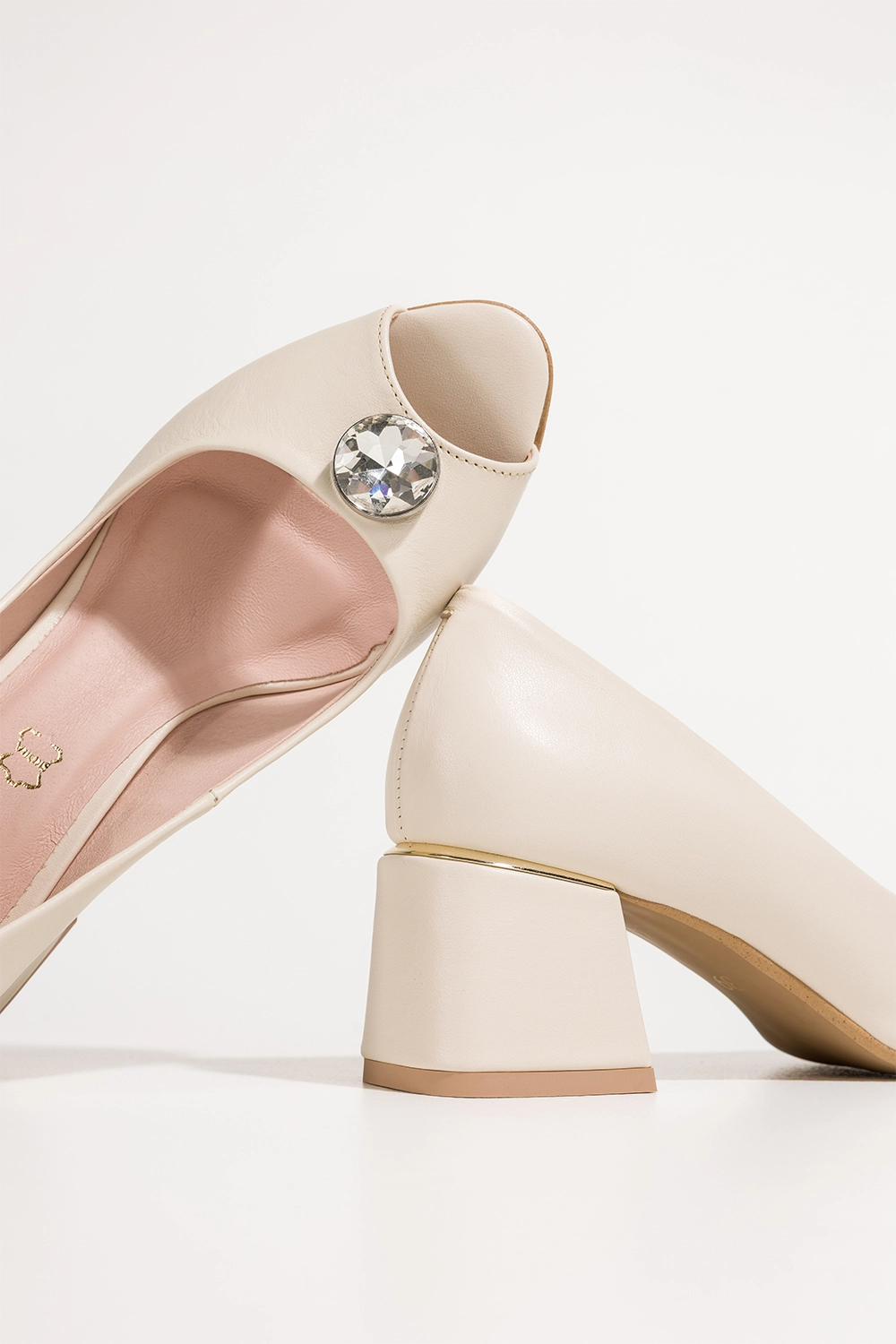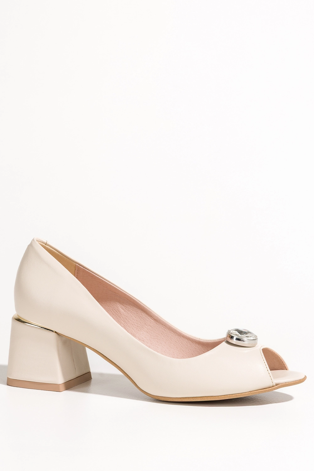 Beżowe czółenka skórzane damskie peep toe z perłową powłoką na ozdobnym klocku ozdoba z kryształkiem PRODUKT POLSKI Casu 3771