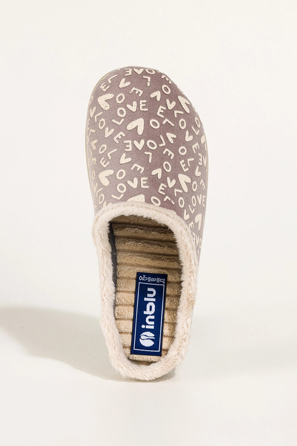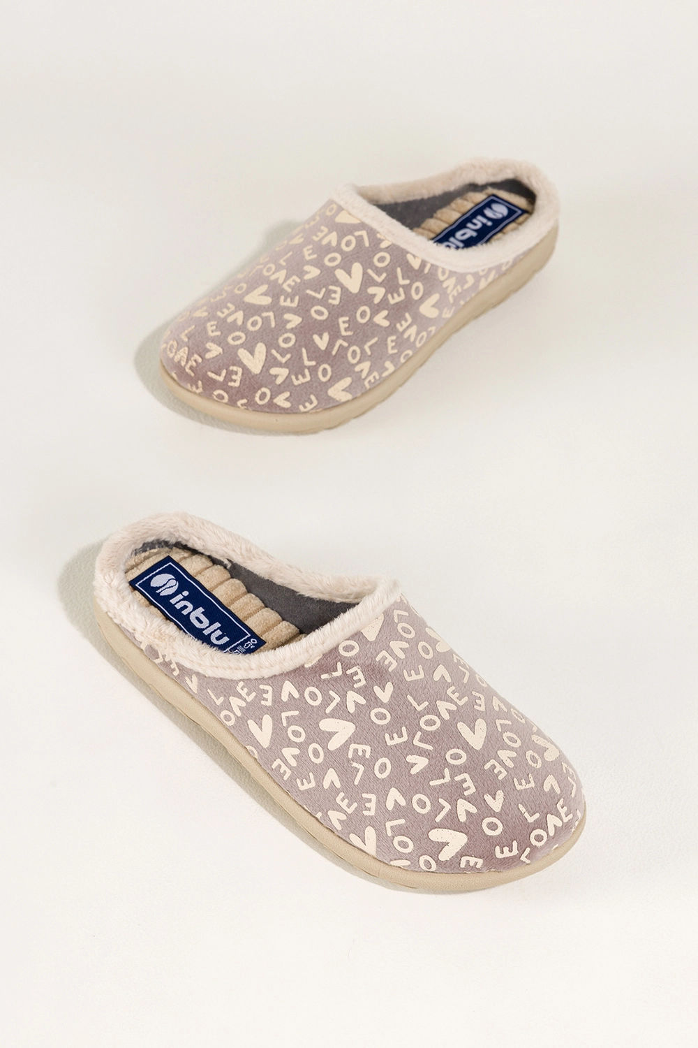 Beżowe kapcie damskie Inblu obuwie domowe ozdobione napisami Love VG999967, połączenie elegancji i wygody, które pokochasz od pierwszego kroku. Wykonane z wysokogatunkowego materiału, zapewniają trwałość i miękkość, a delikatna wkładka z tkaniny dba o komfort stóp przez cały dzień. Zaokrąglony nosek i płaska podeszwa sprawiają, że to idealny wybór do codziennego użytku w domowym zaciszu.