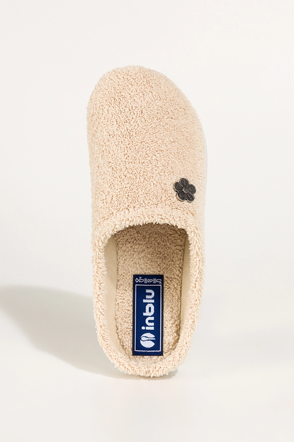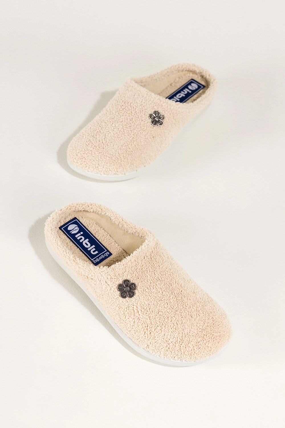 Beżowe kapcie damskie Inblu obuwie domowe ozdobny stalowy kwiatek model VX689899, połączenie elegancji i funkcjonalności. Wykonane z wysokogatunkowego materiału, zapewniają miękkość i trwałość, a delikatna, materiałowa wkładka gwarantuje wygodę przy każdym kroku. Zaokrąglony nosek oraz wsuwana konstrukcja ułatwiają szybkie zakładanie i idealne dopasowanie do stopy.