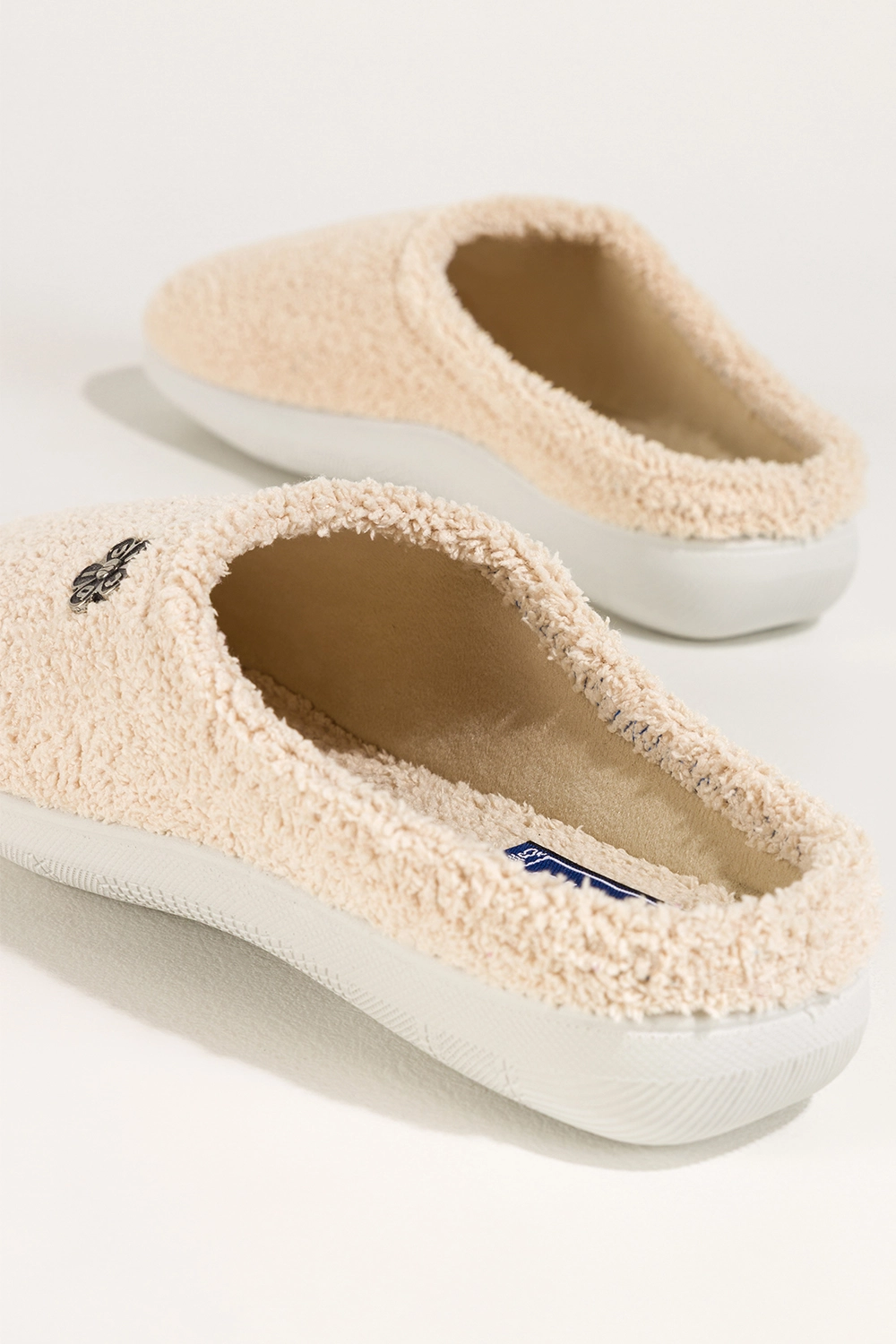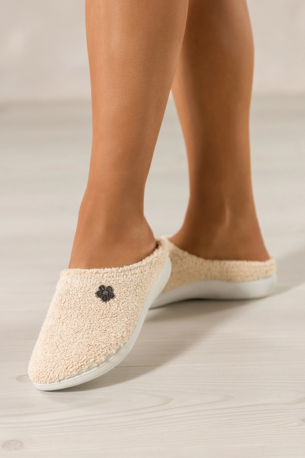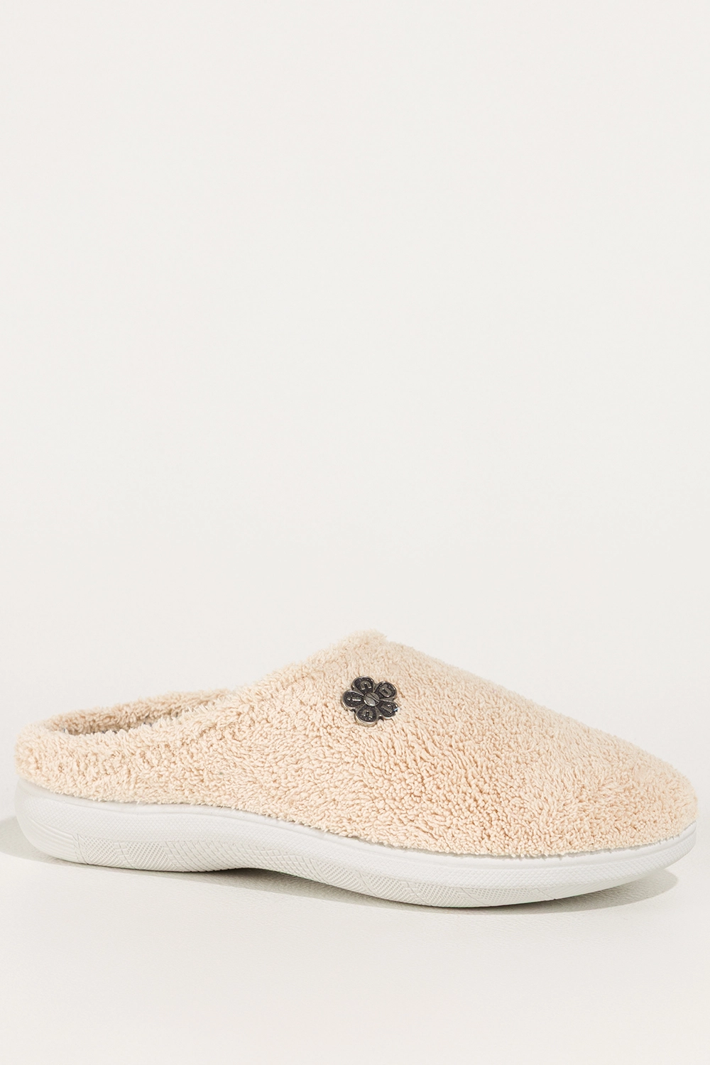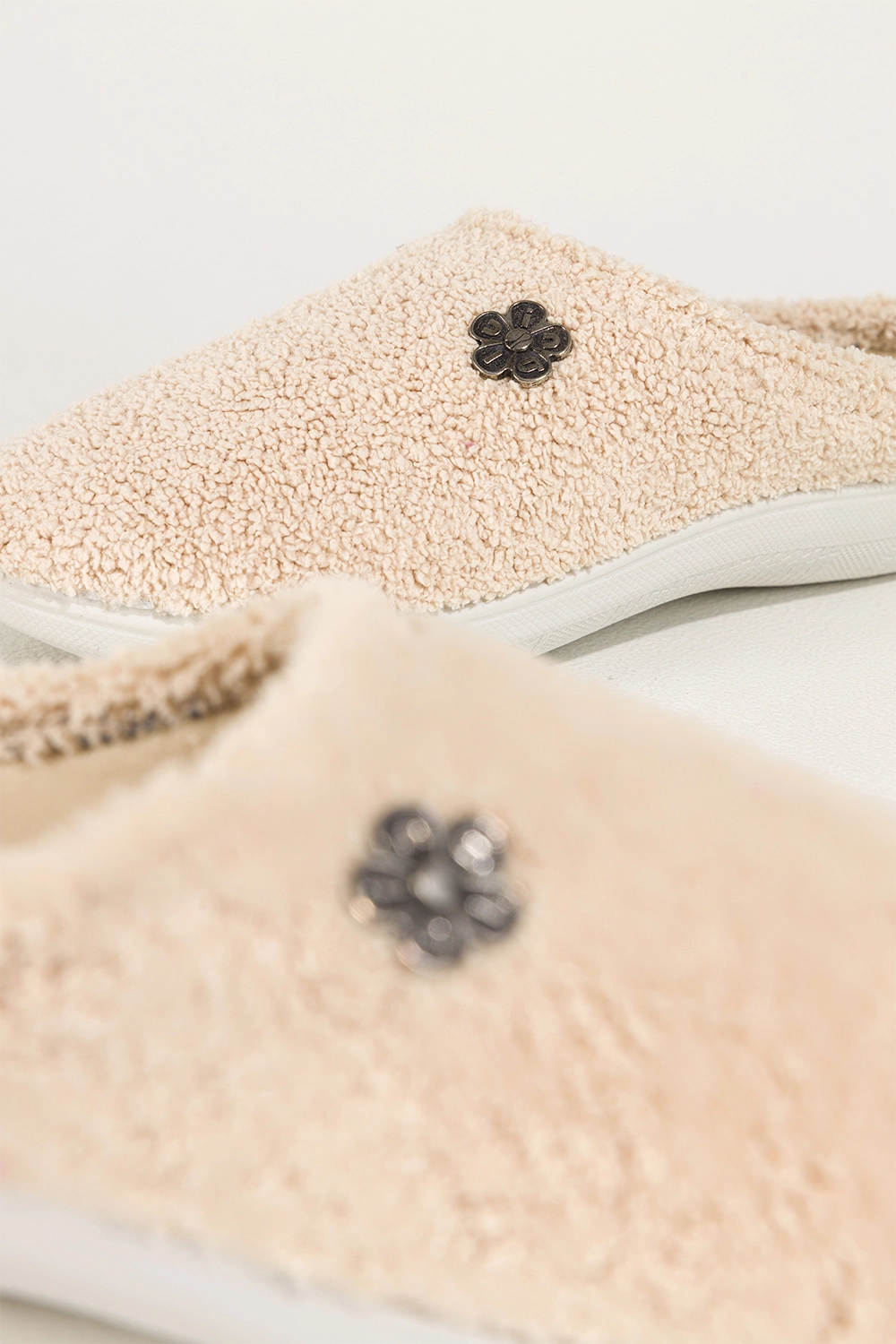 Cholewkę zdobi subtelny stalowy kwiatek, który dodaje obuwiu kobiecego uroku i oryginalnego charakteru. Beżowy kolor jest ponadczasowy i doskonale komponuje się z różnymi elementami domowej garderoby, nadając codziennym chwilom odrobinę luksusu.