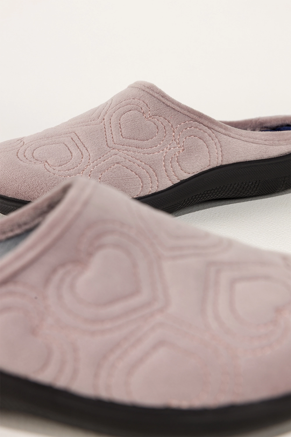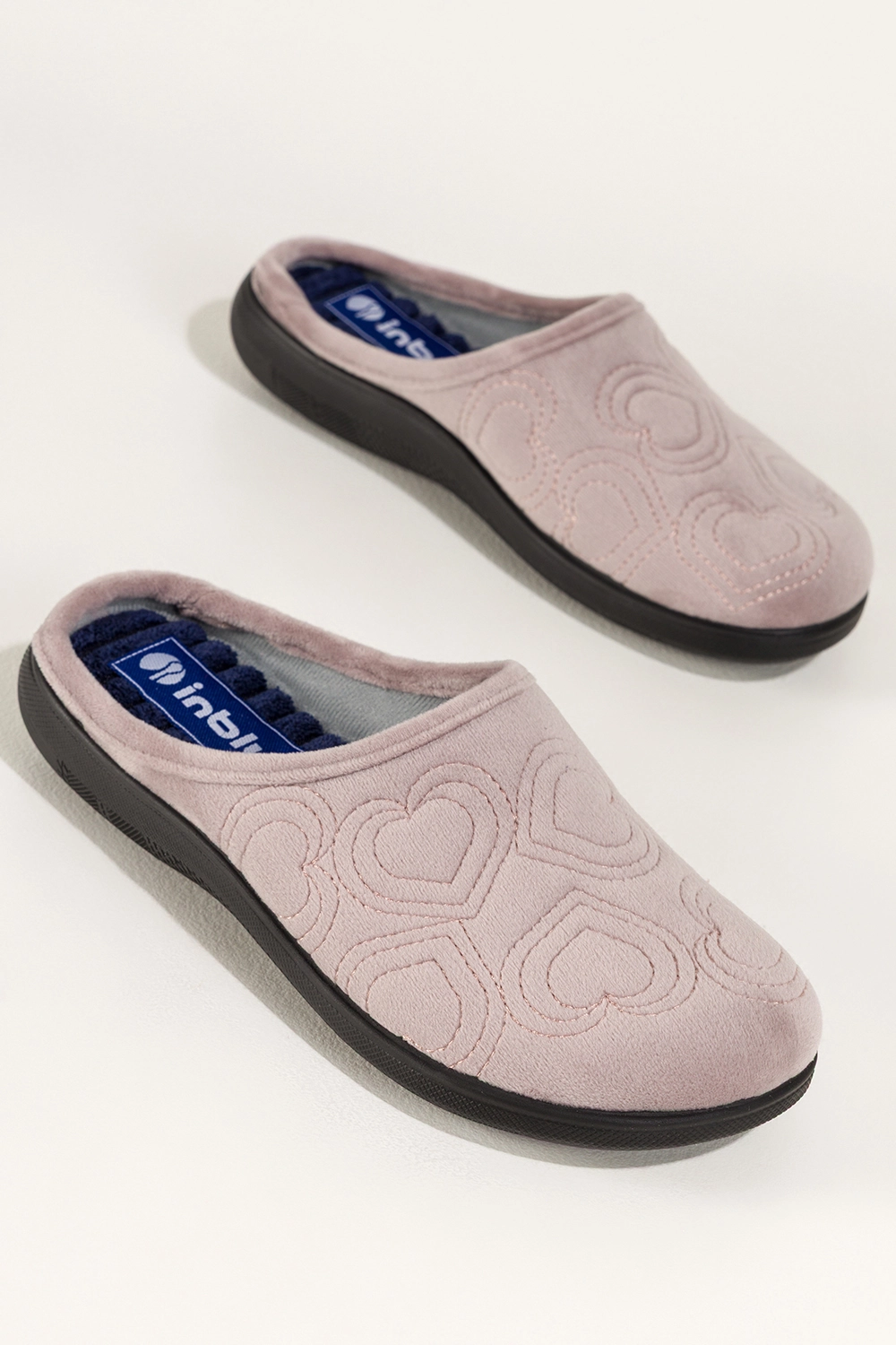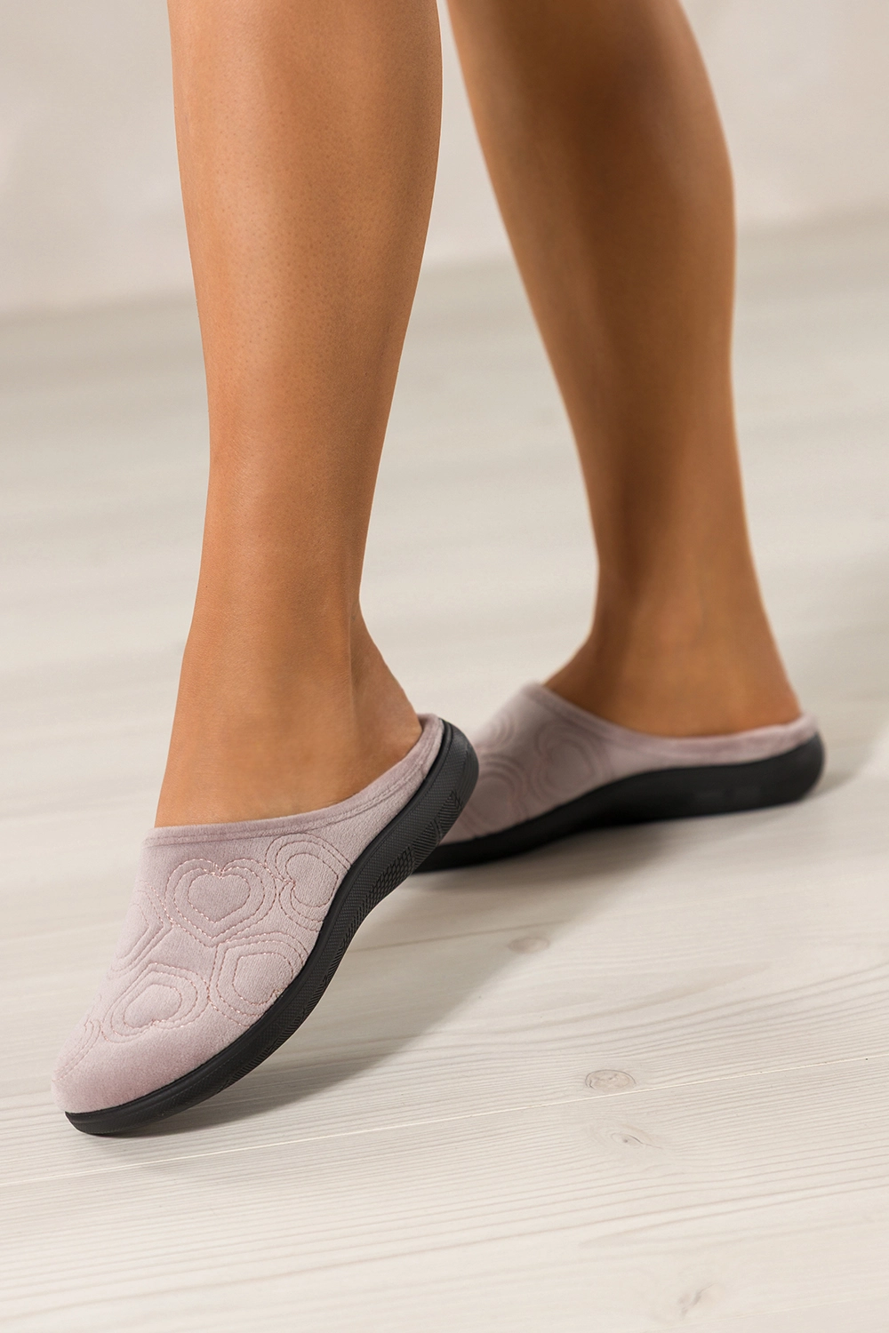 Subtelny beżowy kolor w połączeniu z haftowanymi sercami na cholewce dodaje kapciom romantycznego charakteru. Wsuwana konstrukcja sprawia, że zakładanie jest szybkie i wygodne, a płaska podeszwa stabilizuje krok, chroniąc przed poślizgiem.