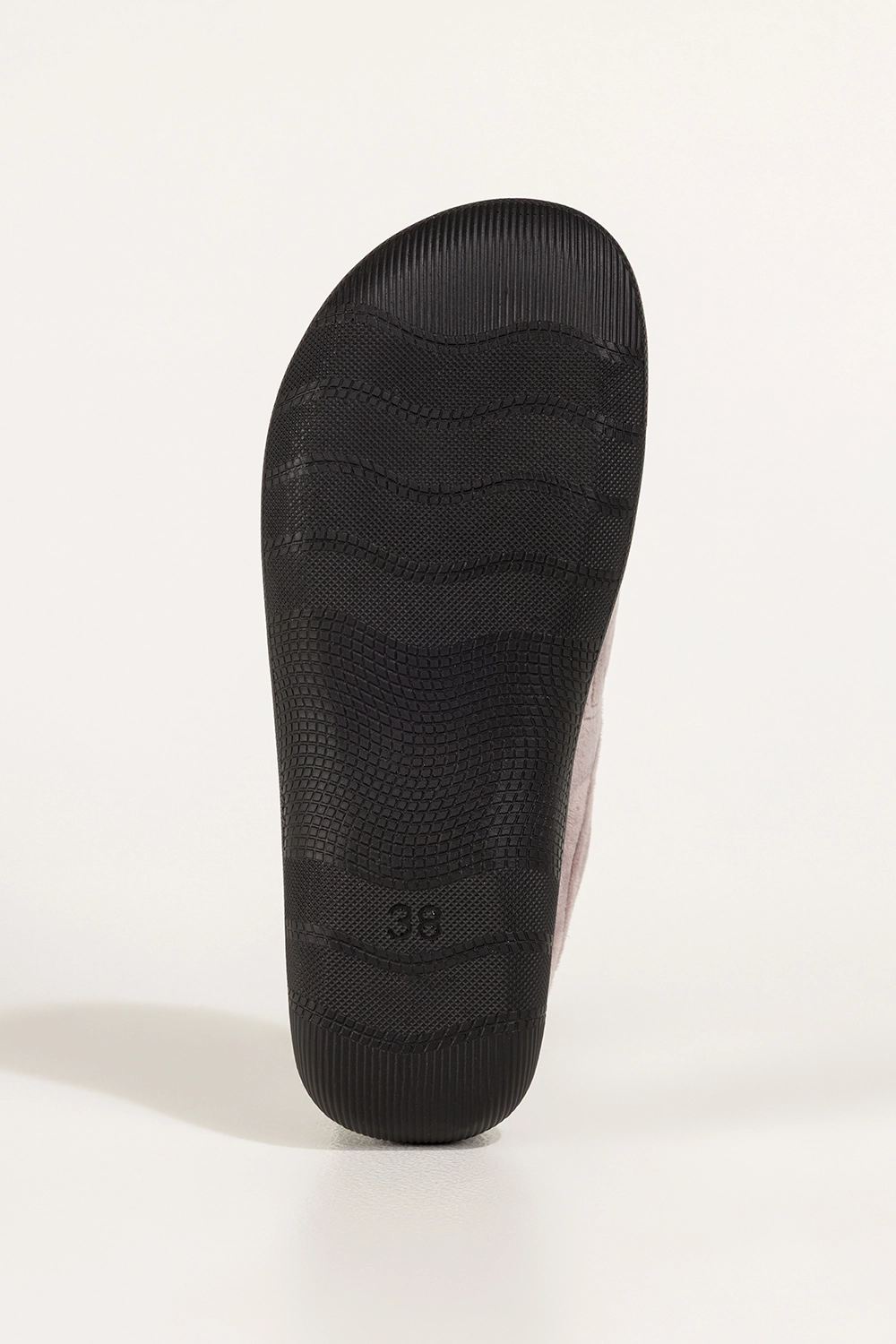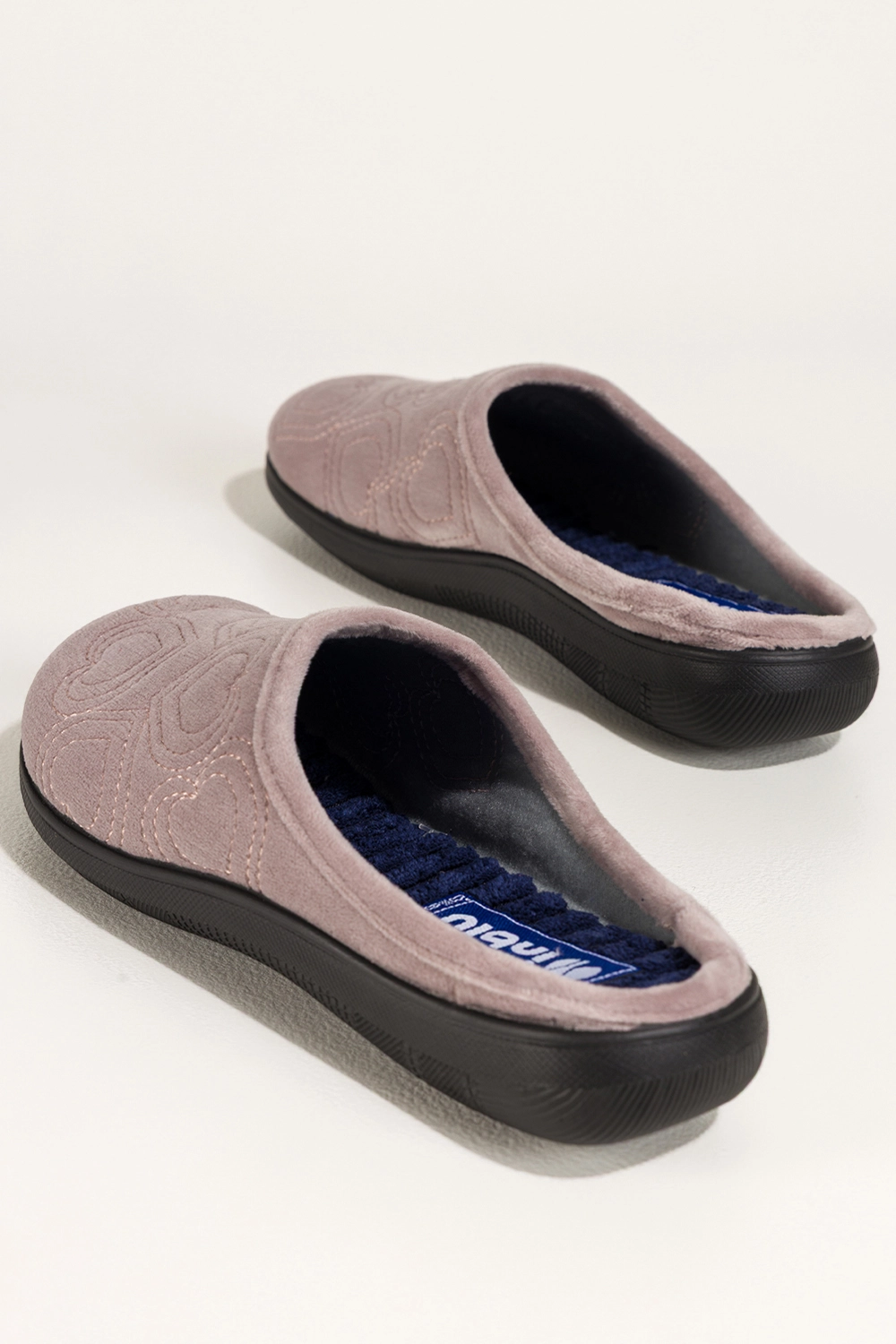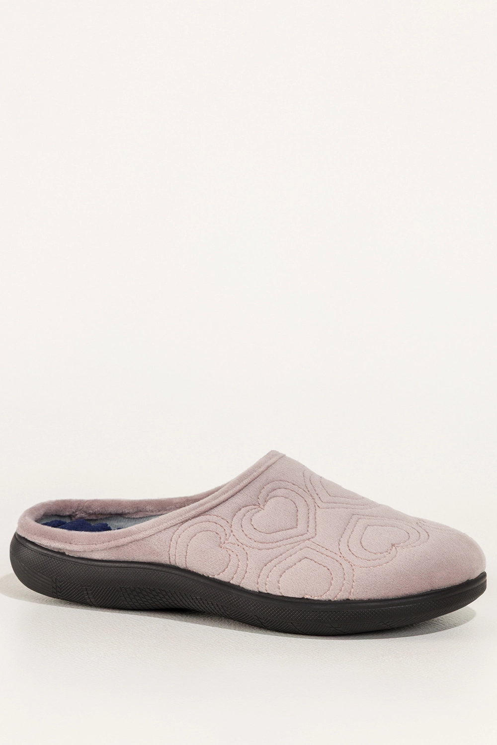 Subtelny beżowy kolor w połączeniu z haftowanymi sercami na cholewce dodaje kapciom romantycznego charakteru. Wsuwana konstrukcja sprawia, że zakładanie jest szybkie i wygodne, a płaska podeszwa stabilizuje krok, chroniąc przed poślizgiem.
