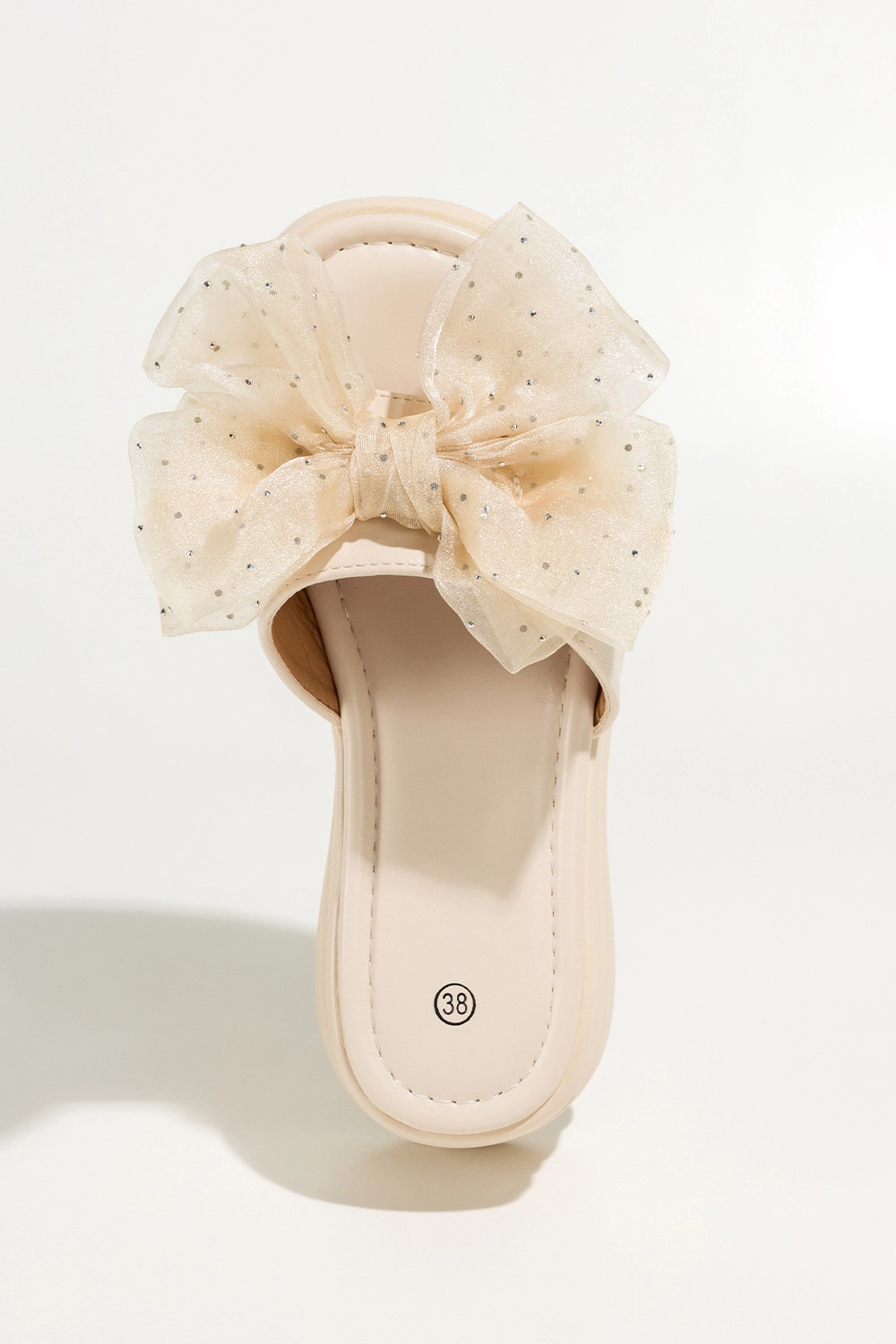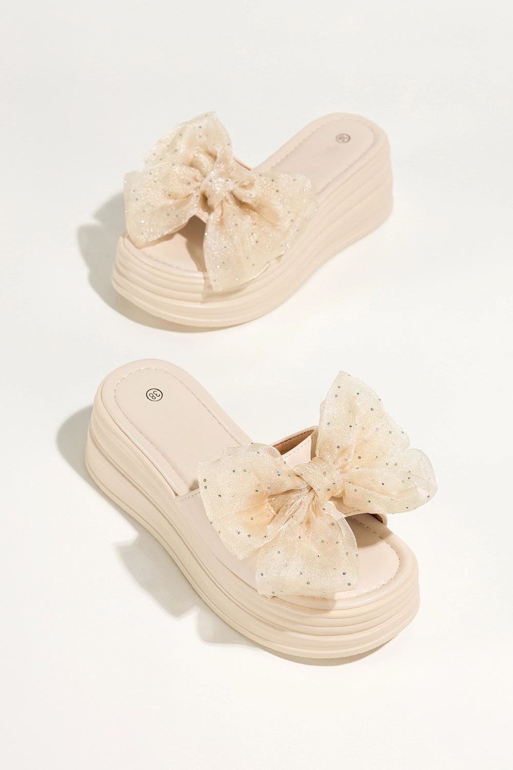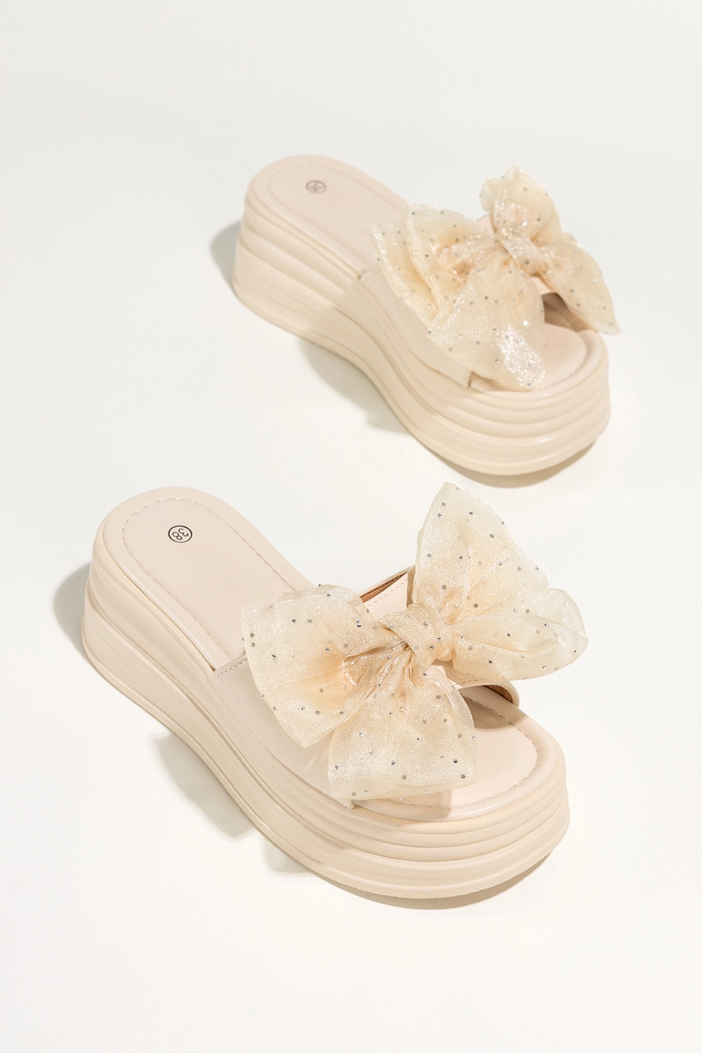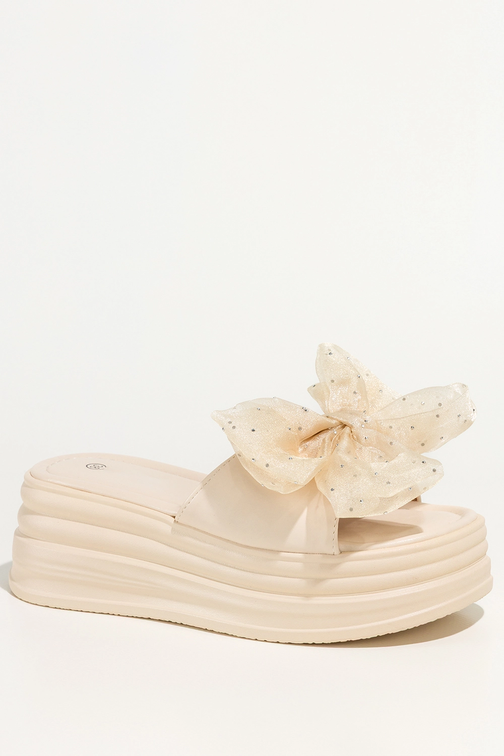 Beżowe klapki damskie na platformie materiałowa kokarda z cyrkoniami Carla BG220P