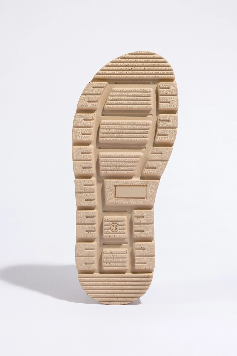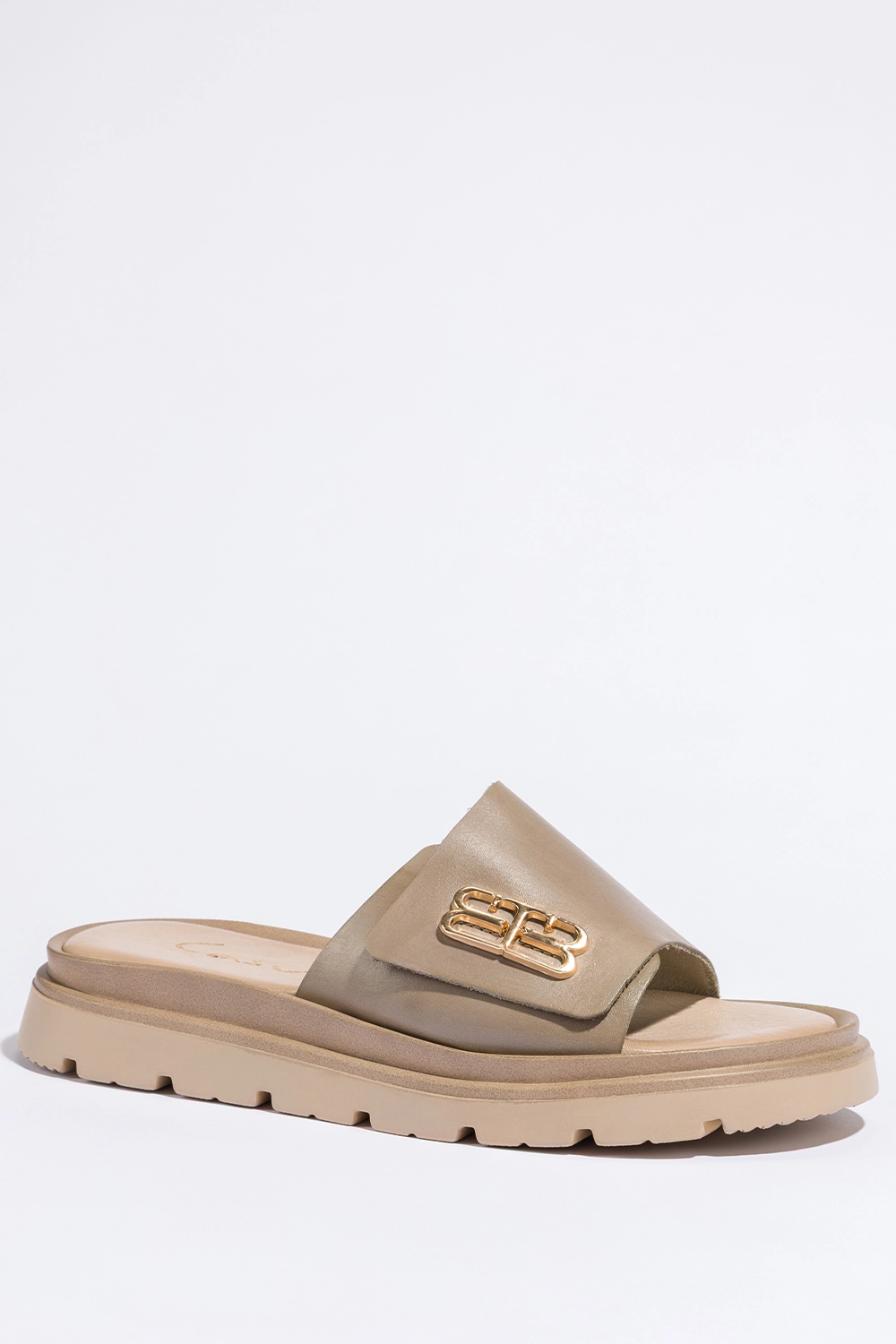 Beżowe klapki to nie tylko modny dodatek, ale też przemyślana konstrukcja, której bieżnikowana platforma zapewnia stabilność Odkryty nosek i lekko podwyższona podeszwa optycznie wysmuklają nogi, a przy tym gwarantują odpowiednią wentylację w cieplejsze dni. Złota ozdoba umieszczona na szerokim pasku dodaje całości luksusowego charakteru, dzięki czemu model 40442 prezentuje się niezwykle efektownie i przyciąga spojrzenia. To idealne połączenie elegancji z wygodą użytkowania.