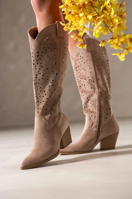 Beżowe kowbojki zachwycają swoją wszechstronnością - pasują zarówno do jasnych, jak i ciemniejszych stylizacji, dzięki czemu bez trudu wkomponujesz je w swoją szafę. Ten odcień nadaje im lekkości i sprawia, że nawet wyrazisty model prezentuje się subtelnie i elegancko. jasne kowbojki beżowe doskonale sprawdzają się wiosną i latem, ale równie pięknie uzupełniają jesienne zestawy z dzianinami i płaszczami. To kolor, który wizualnie wysmukla nogi i dodaje stylizacji harmonii.