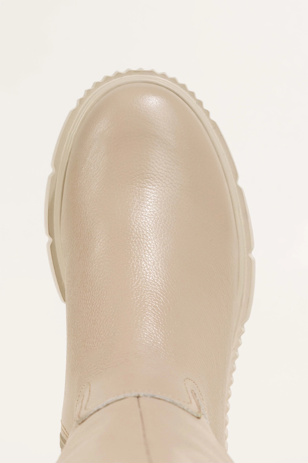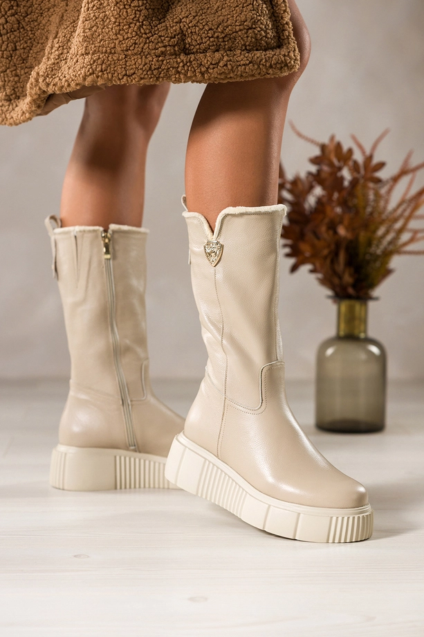 Beżowe kozaki skórzane damskie przed kolano na żłobionej platformie wycięta cholewka złota ozdoba PRODUKT POLSKI Casu 29878. Wykonane z wysokogatunkowej, naturalnej skóry, zapewniają nie tylko luksusowy wygląd, ale i trwałość na lata. Wnętrze ocieplone delikatnym kożuszkiem gwarantuje komfort nawet w najbardziej mroźne dni, a staranne szycie i wykończenia świadczą o polskiej precyzji i pasji do rzemiosła obuwniczego.