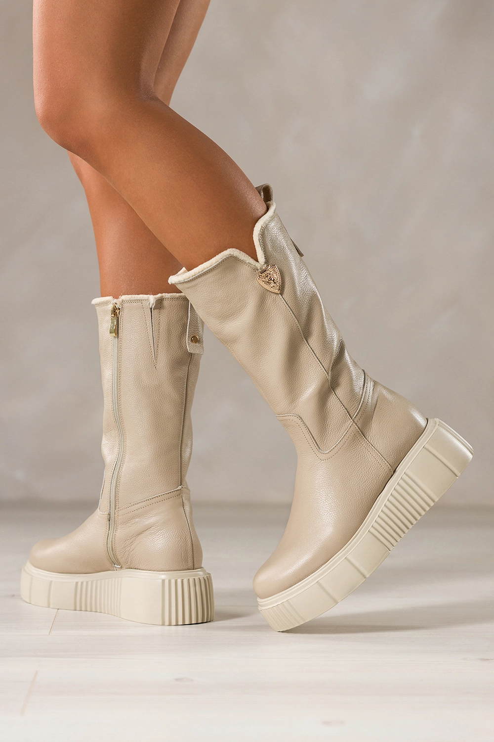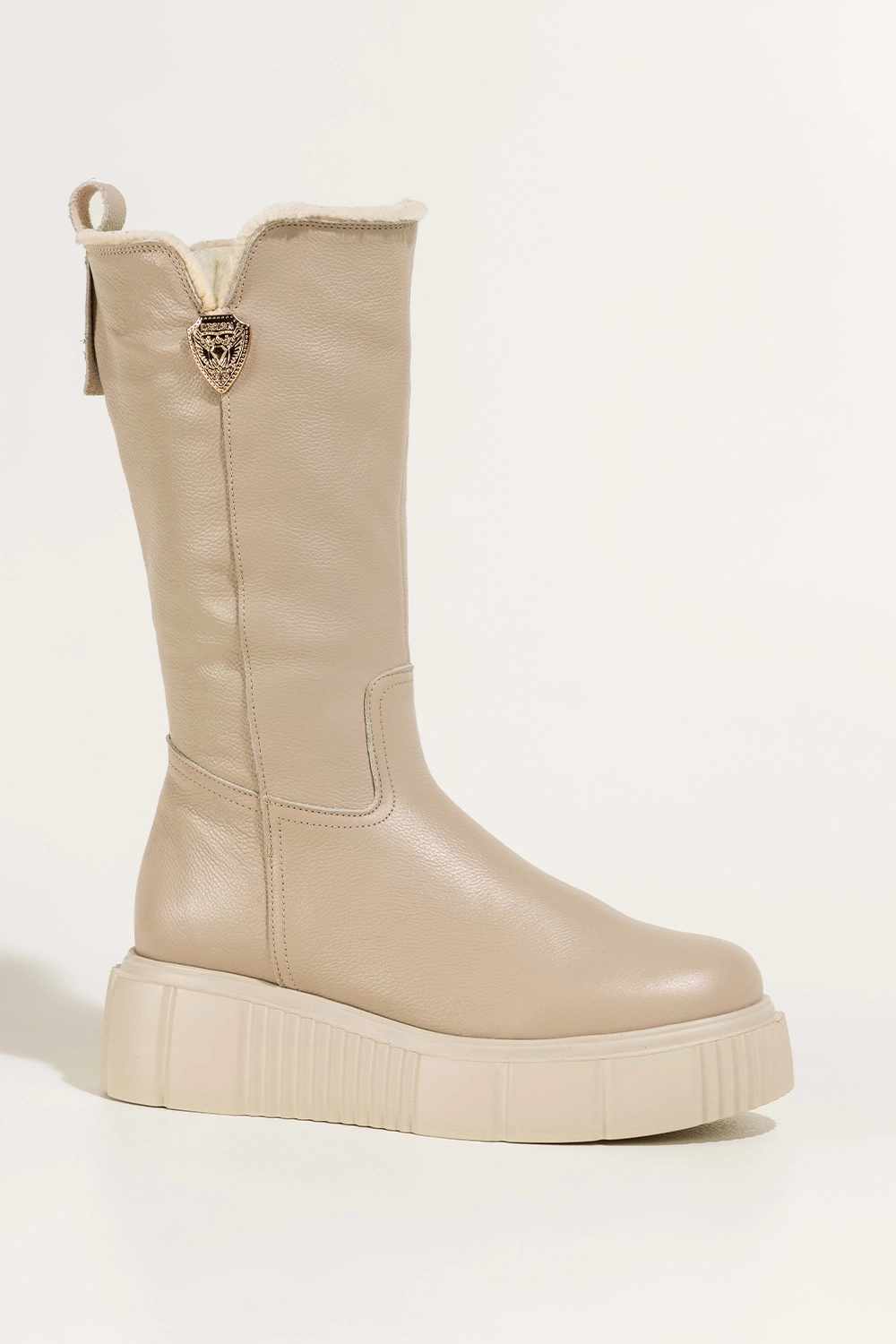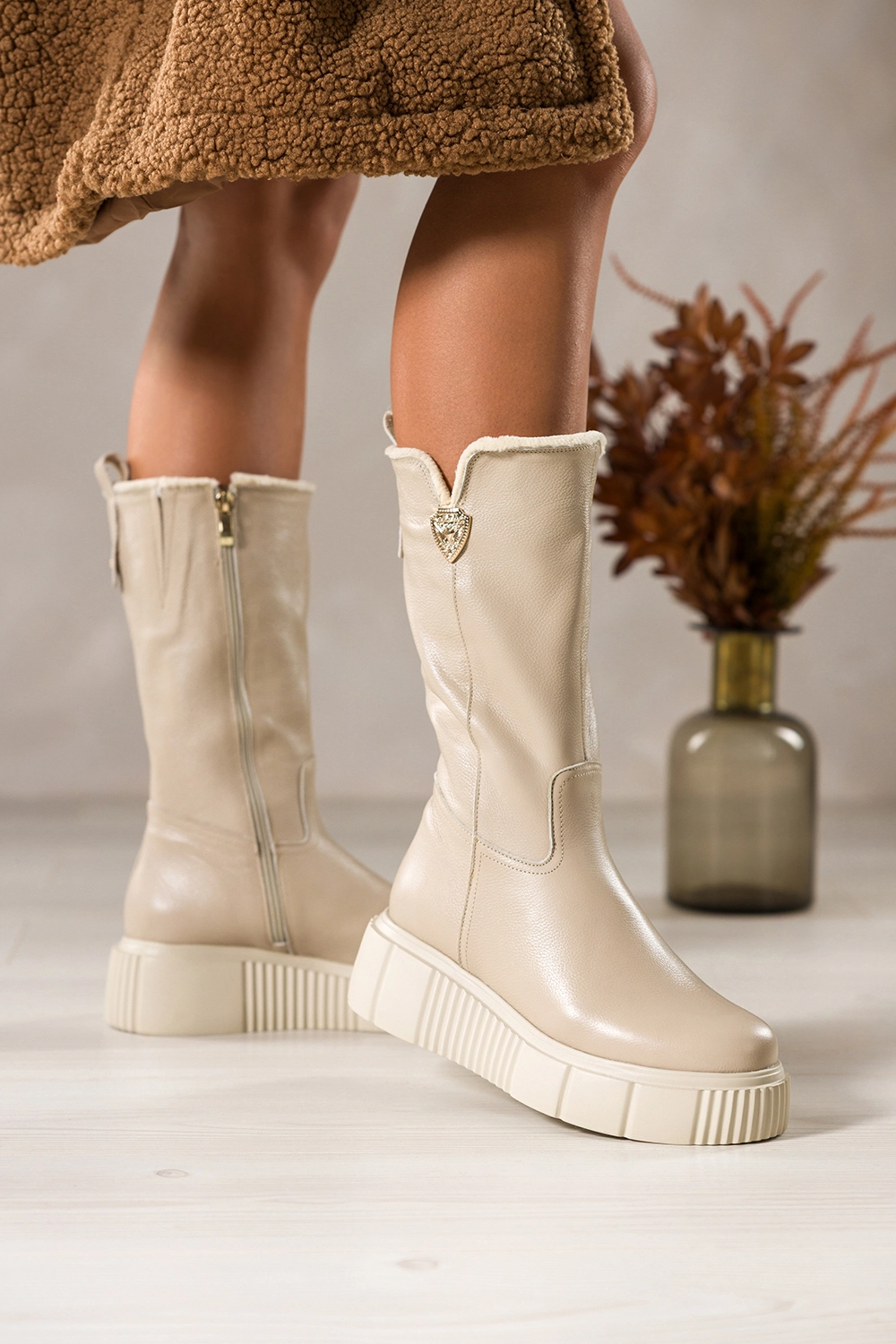 Wycięta cholewka wykończona kożuszkiem oraz subtelna złota ozdoba nadają kozakom elegancki, a jednocześnie nowoczesny charakter. Ich beżowy odcień idealnie współgra zarówno z jasnymi, jak i ciemnymi stylizacjami, co czyni je doskonałym wyborem do pracy, na spotkanie z przyjaciółmi czy zimowy spacer. Zaokrąglony nosek oraz żłobiona platforma nadają całości modowy sznyt, jednocześnie zwiększając stabilność kroku.