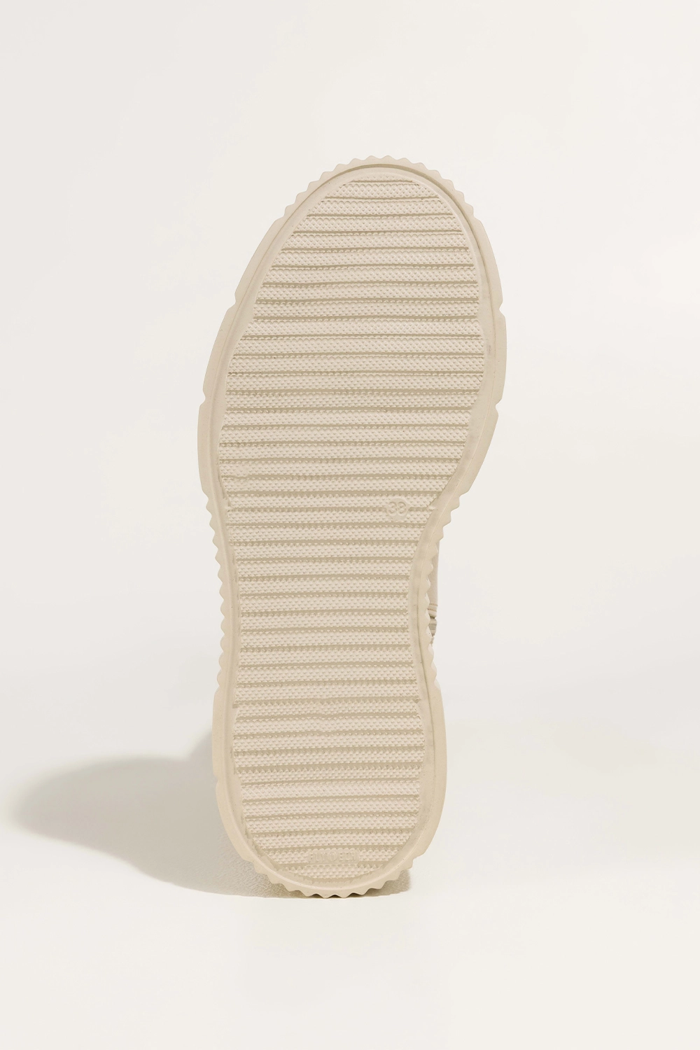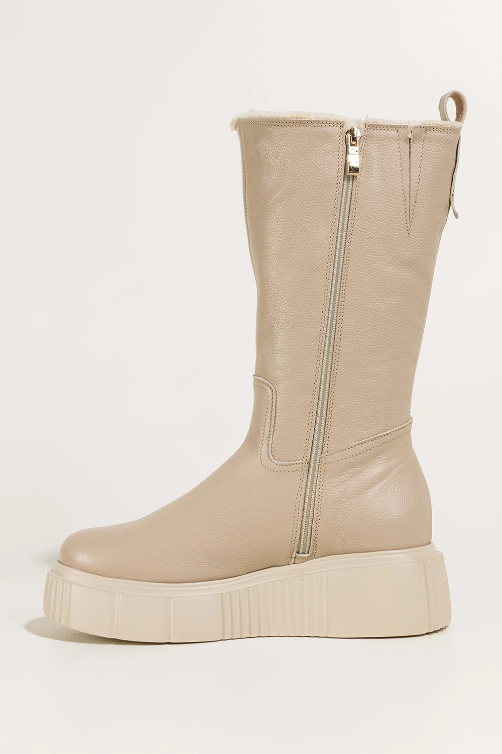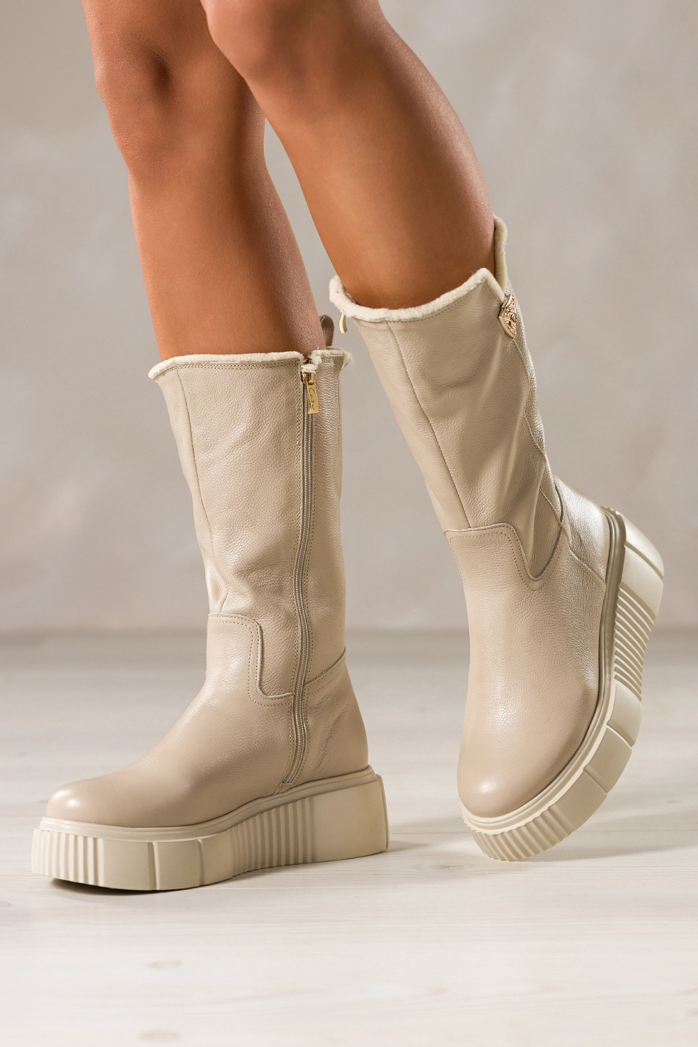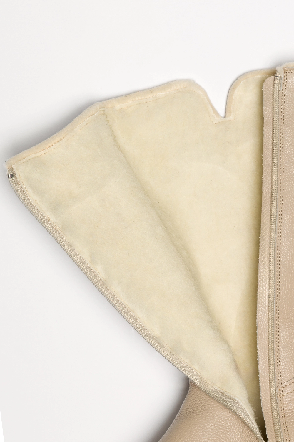 Wycięta cholewka wykończona kożuszkiem oraz subtelna złota ozdoba nadają kozakom elegancki, a jednocześnie nowoczesny charakter. Ich beżowy odcień idealnie współgra zarówno z jasnymi, jak i ciemnymi stylizacjami, co czyni je doskonałym wyborem do pracy, na spotkanie z przyjaciółmi czy zimowy spacer. Zaokrąglony nosek oraz żłobiona platforma nadają całości modowy sznyt, jednocześnie zwiększając stabilność kroku.