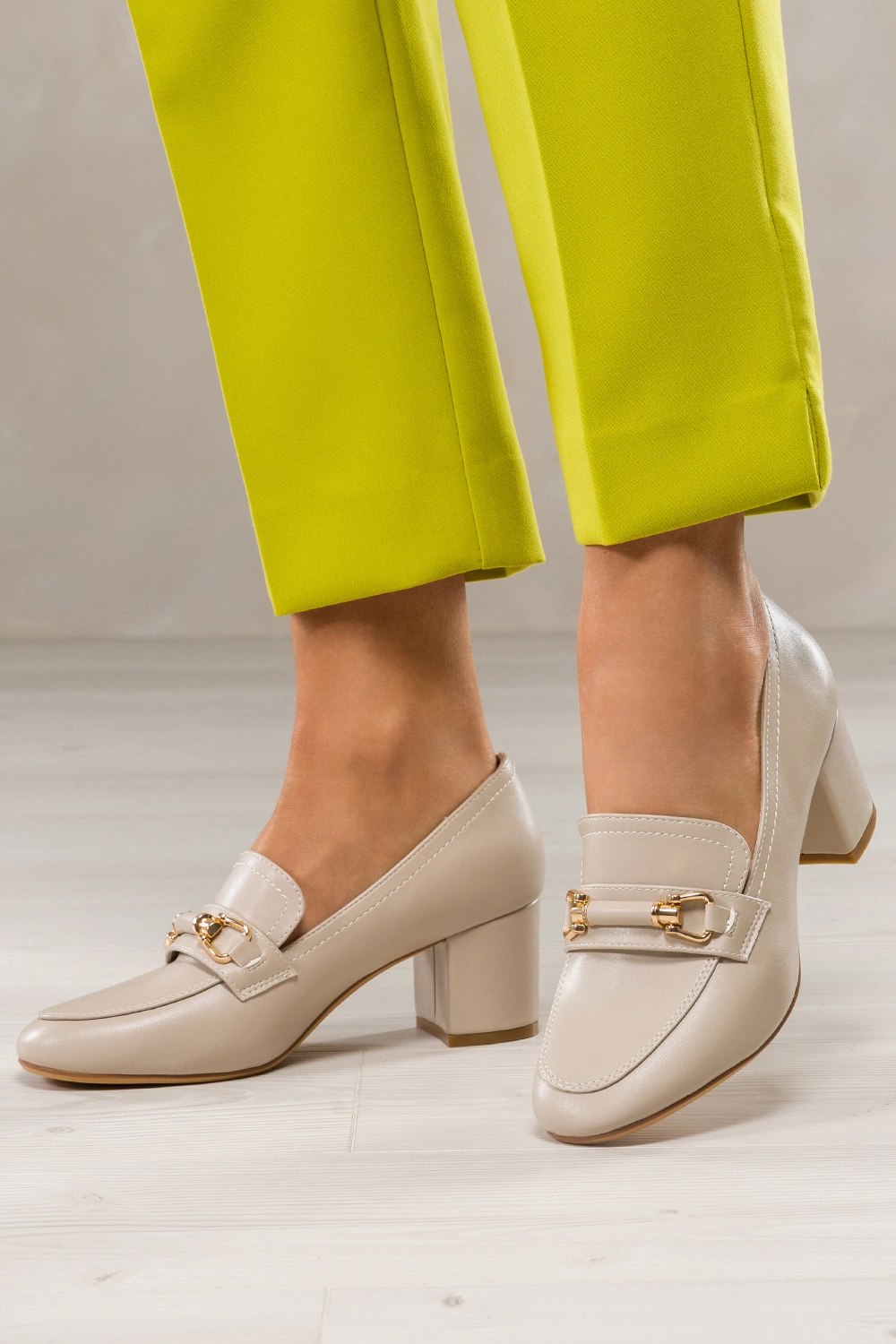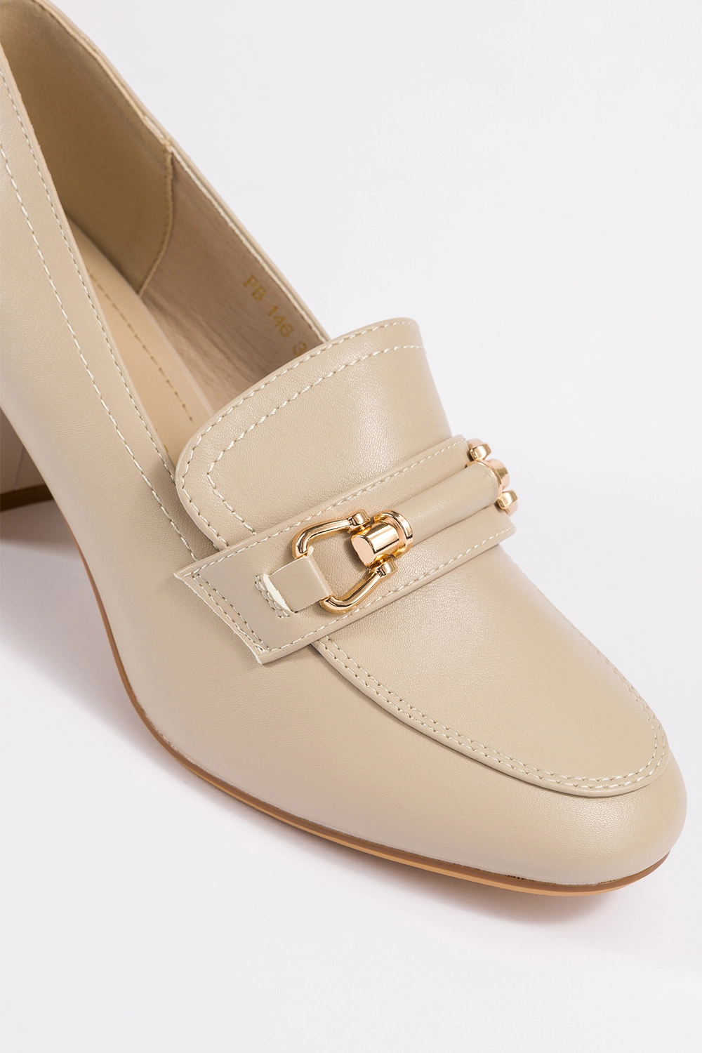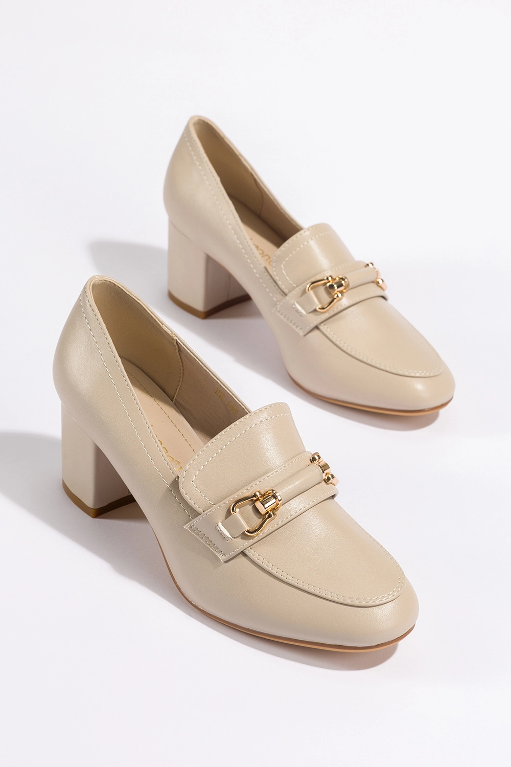 Te wyjątkowe beżowe mokasyny to absolutny must-have w szafie każdej kobiety ceniącej modę i funkcjonalność. Ich klasyczna forma i nowoczesny twist w postaci złotej sprzączki sprawiają, że pasują zarówno do eleganckich garniturów, jak i zwiewnych sukienek czy casualowych jeansów. Beż to kolor neutralny, który świetnie komponuje się z niemal każdą barwą, dzięki czemu mokasyny te można nosić przez cały rok, niezależnie od pory roku i obowiązujących trendów. Obcas w formie szerokiego słupka nie tylko optycznie wysmukla sylwetkę, ale też dodaje stylizacji kobiecego charakteru. To idealne buty na spotkania biznesowe, randki, uroczystości rodzinne czy weekendowe wypady ze znajomymi. Ich subtelna elegancja nigdy nie wyjdzie z mody.