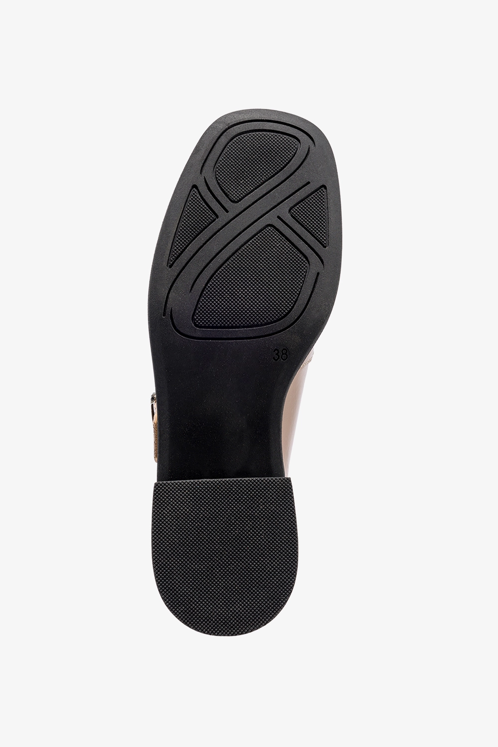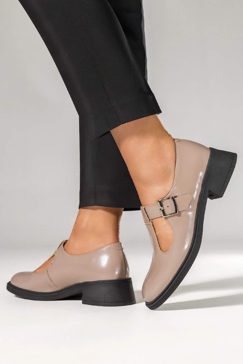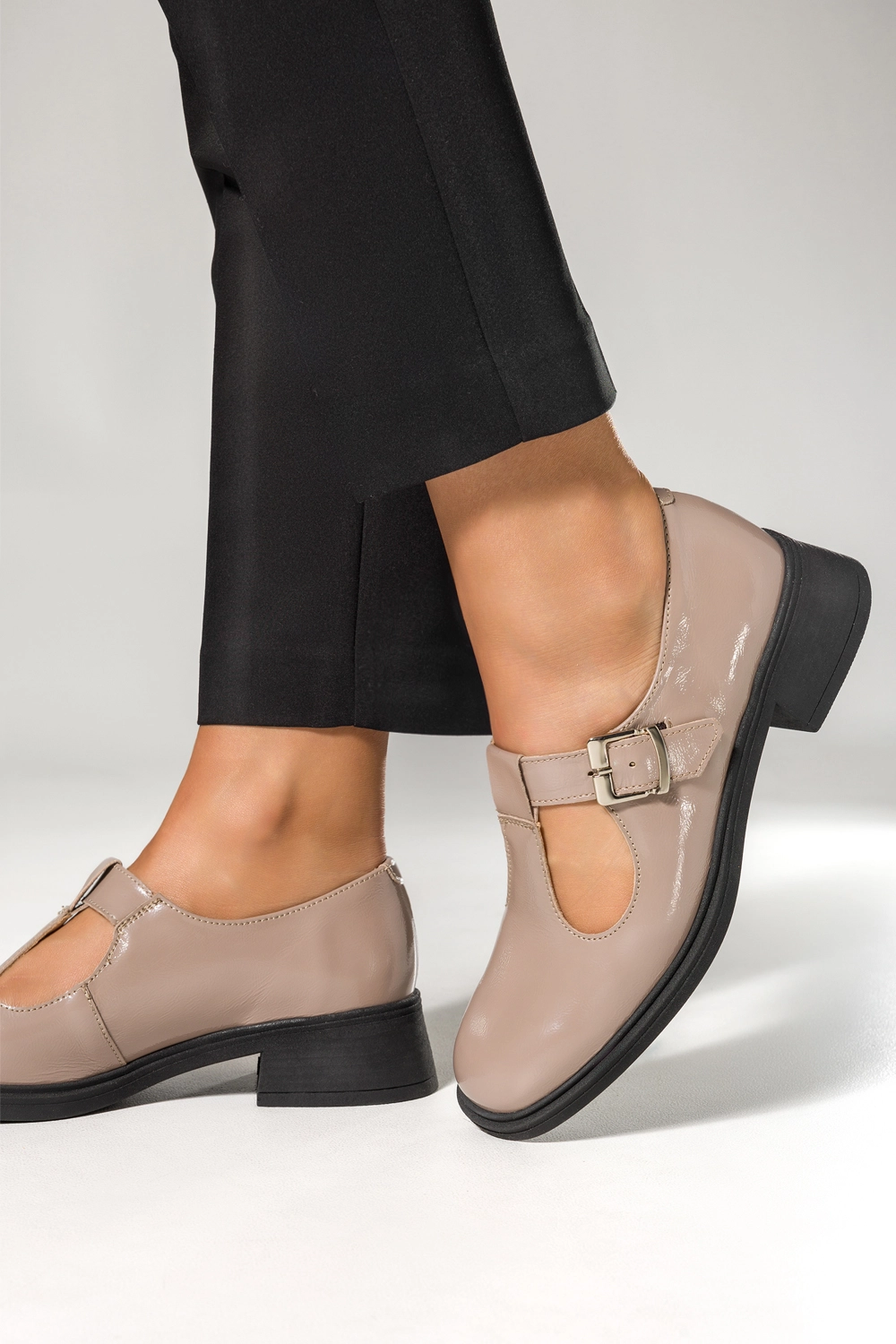 Te beżowe lakierowane półbuty to doskonały wybór dla kobiet, które cenią klasyczny styl w nowoczesnym wydaniu. Subtelny blask lakierowanej skóry podkreśla elegancję butów, a wycięcia w cholewce dodają im lekkości i przewiewności. Kwadratowy nosek w połączeniu z ozdobnym paskiem zapinanym na srebrną klamerkę tworzy harmonijną kompozycję, która sprawdzi się zarówno w biurowych stylizacjach, jak i podczas spotkań towarzyskich. Ciemna podeszwa stanowi stylowy kontrast dla beżowej cholewki, co nadaje butom oryginalnego charakteru.