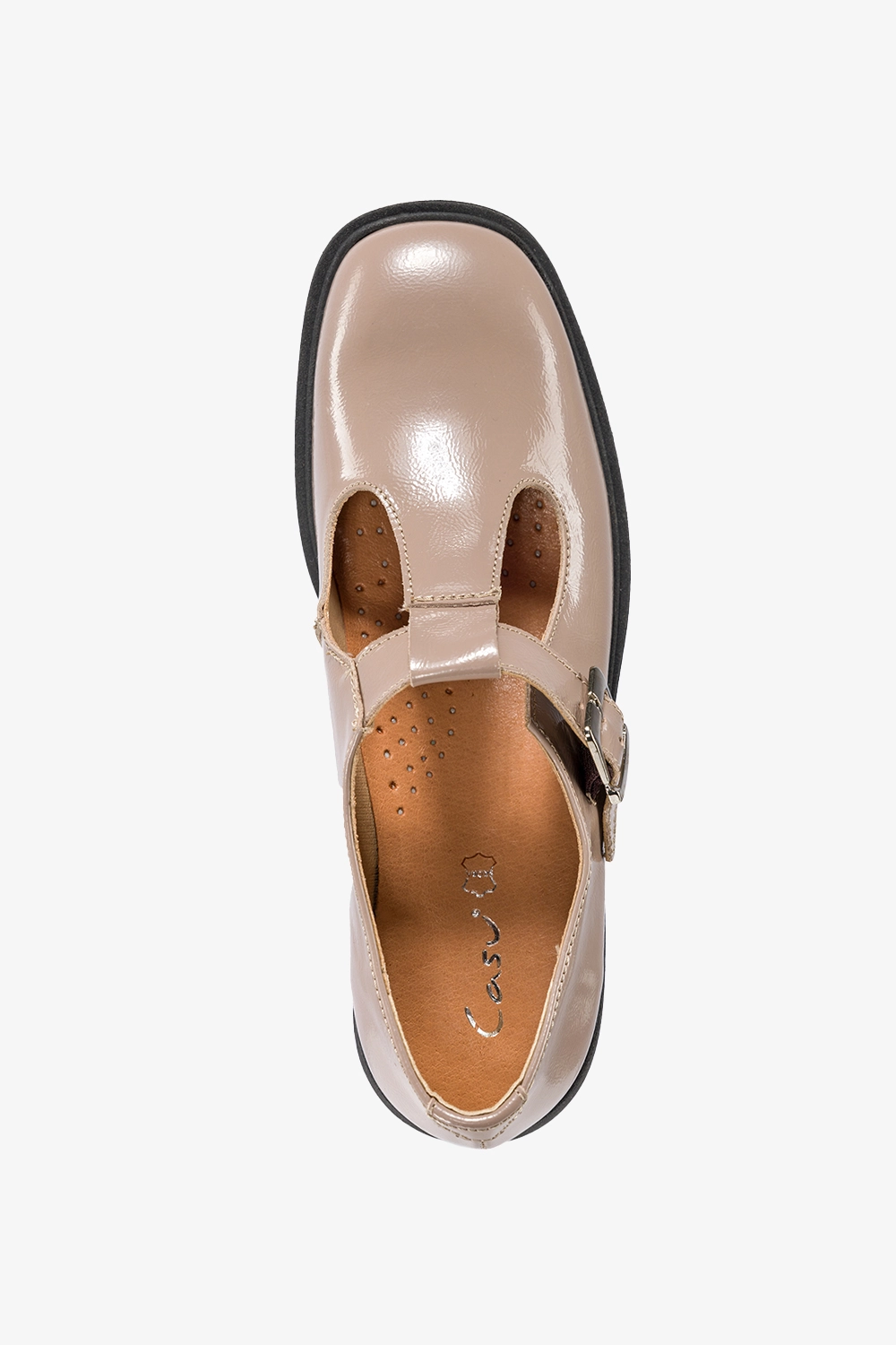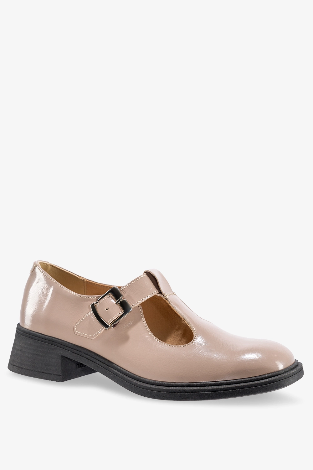 Beżowe półbuty skórzane damskie lakierowane z wycięciami PRODUKT POLSKI Casu model 585 to połączenie klasyki i nowoczesnego designu, które zachwyca eleganckim wykończeniem i wyjątkowym komfortem noszenia. Wykonane z wysokiej jakości lakierowanej skóry naturalnej, doskonale sprawdzą się zarówno w codziennych stylizacjach, jak i podczas wyjątkowych okazji. Miękka, skórzana wkładka oraz stabilny, niski obcas typu klocek gwarantują wygodę przez cały dzień. Unikalne wycięcia w cholewce dodają butom lekkości, a srebrna klamerka w stylu T-bar nadaje im subtelnej finezji. To idealny wybór dla kobiet ceniących połączenie klasy, funkcjonalności i polskiej jakości.