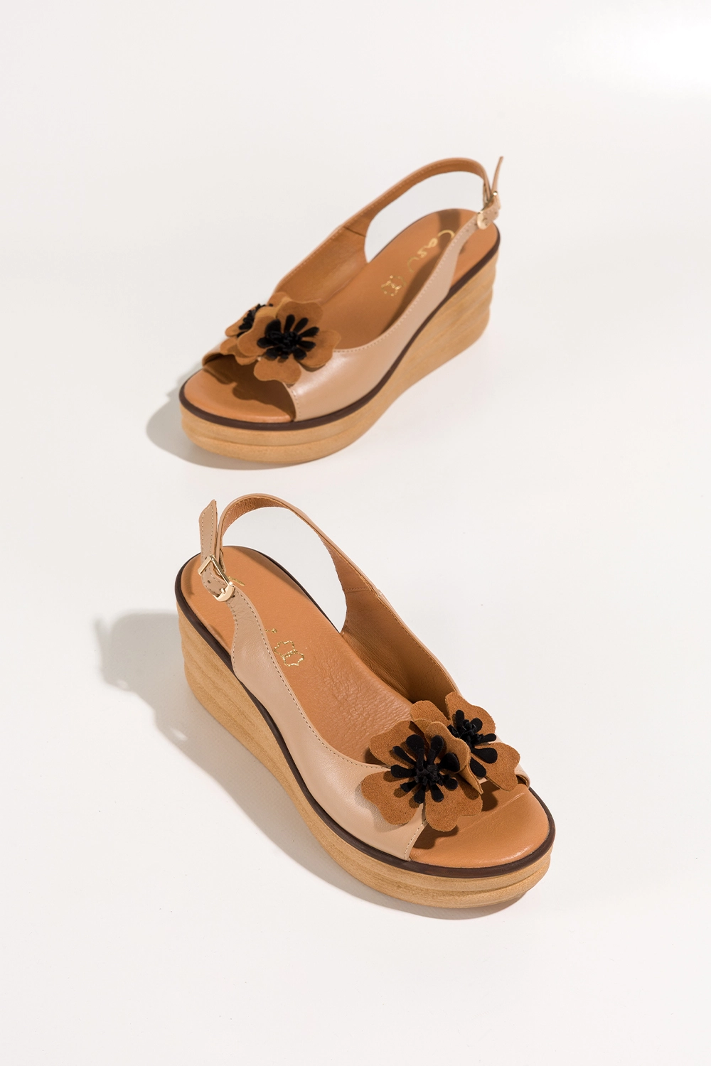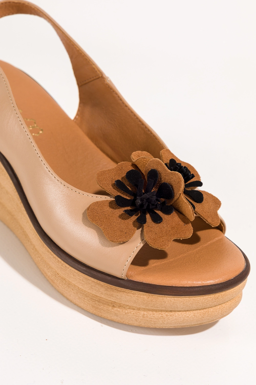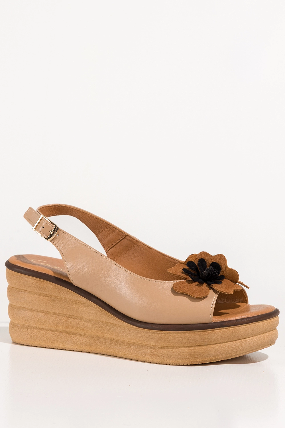 Beżowe sandały skórzane damskie na koturnie brązowe ozdobne kwiaty PRODUKT POLSKI Casu 3014-205