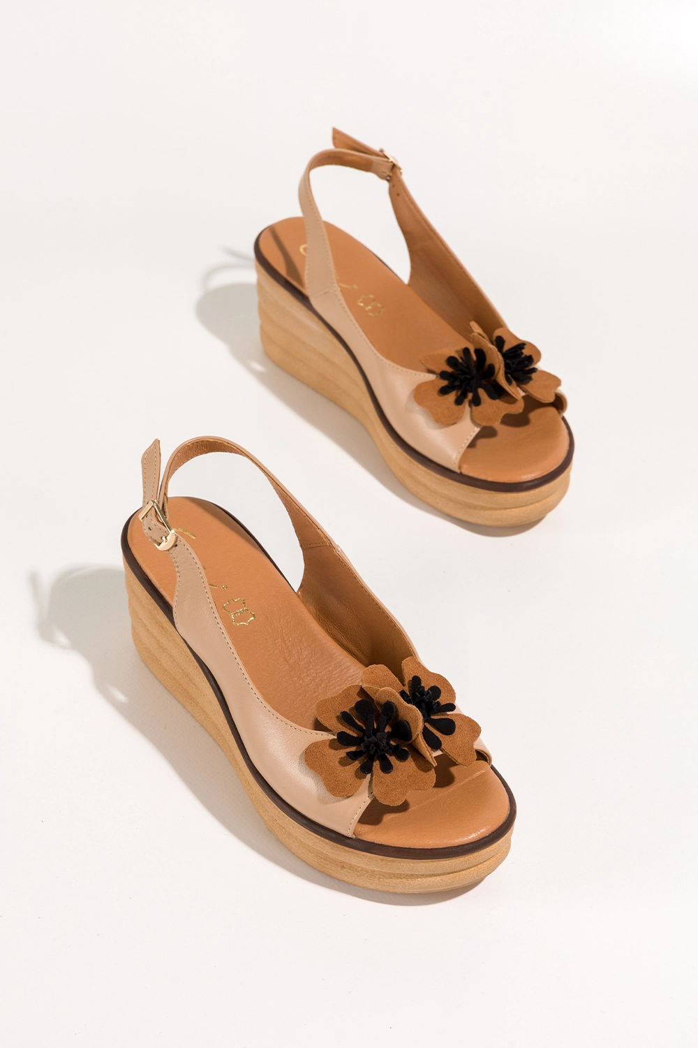 Beżowe sandały skórzane damskie na koturnie brązowe ozdobne kwiaty PRODUKT POLSKI Casu model 3014-205 to doskonały wybór dla kobiet, które poszukują obuwia łączącego w sobie nieprzeciętną estetykę, wygodę i jakość na najwyższym poziomie. Ten niezwykle kobiecy model przyciąga wzrok pięknymi detalami i perfekcyjnym wykonaniem, które widać w każdym milimetrze. Wykonane z wysokogatunkowej skóry, z miękką skórzaną wkładką i subtelnym odkrytym noskiem, sandały oferują komfort przez cały dzień – nawet podczas najdłuższych spacerów. Stylowa cholewka zdobiona zamszowymi kwiatami w odcieniach brązu dodaje charakteru i romantycznego wdzięku, który doskonale komponuje się z letnimi stylizacjami. Koturn z ozdobnym żłobieniem nie tylko pięknie wygląda, ale także gwarantuje stabilność i elegancki krok, a pasek zapinany na złotą klamerkę zapewnia idealne dopasowanie do stopy.