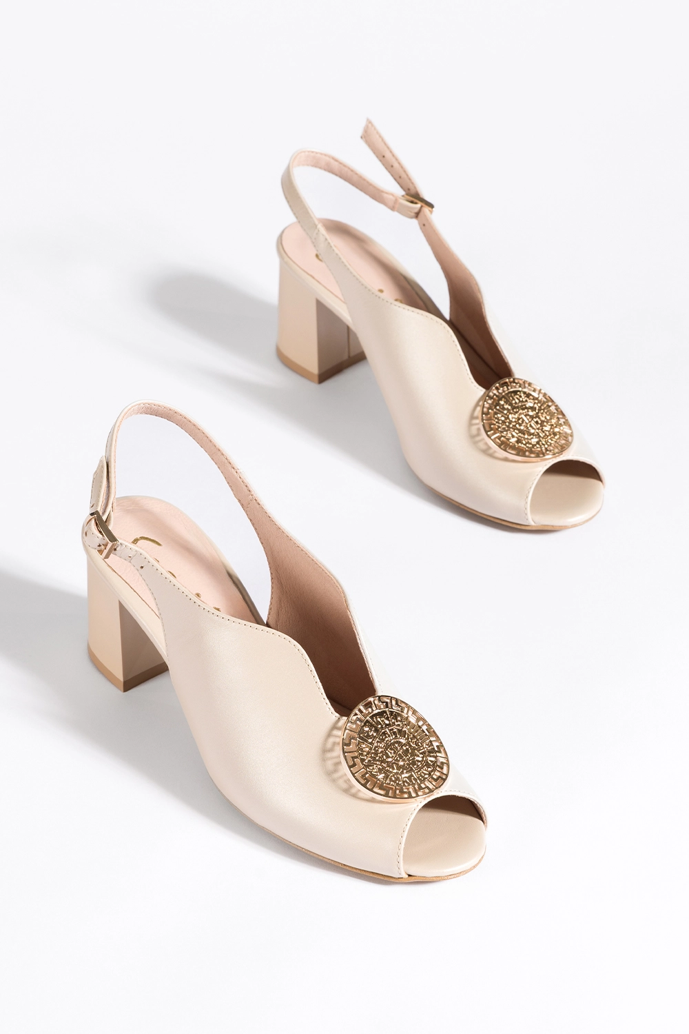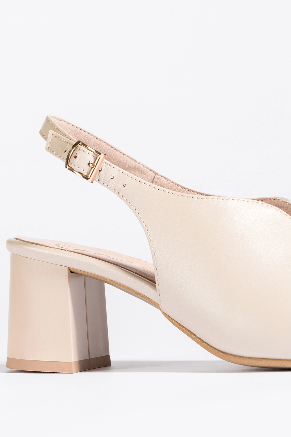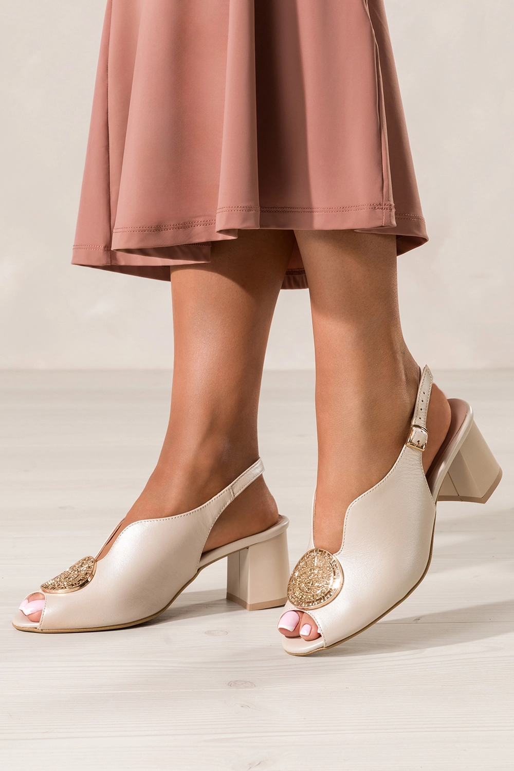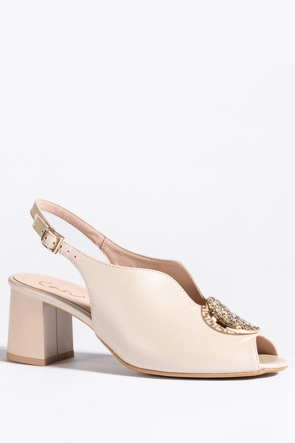 Beżowe sandały skórzane damskie z perłową powłoką na szerokim klocku ze złotą ozdobą PRODUKT POLSKI Casu 3567-O