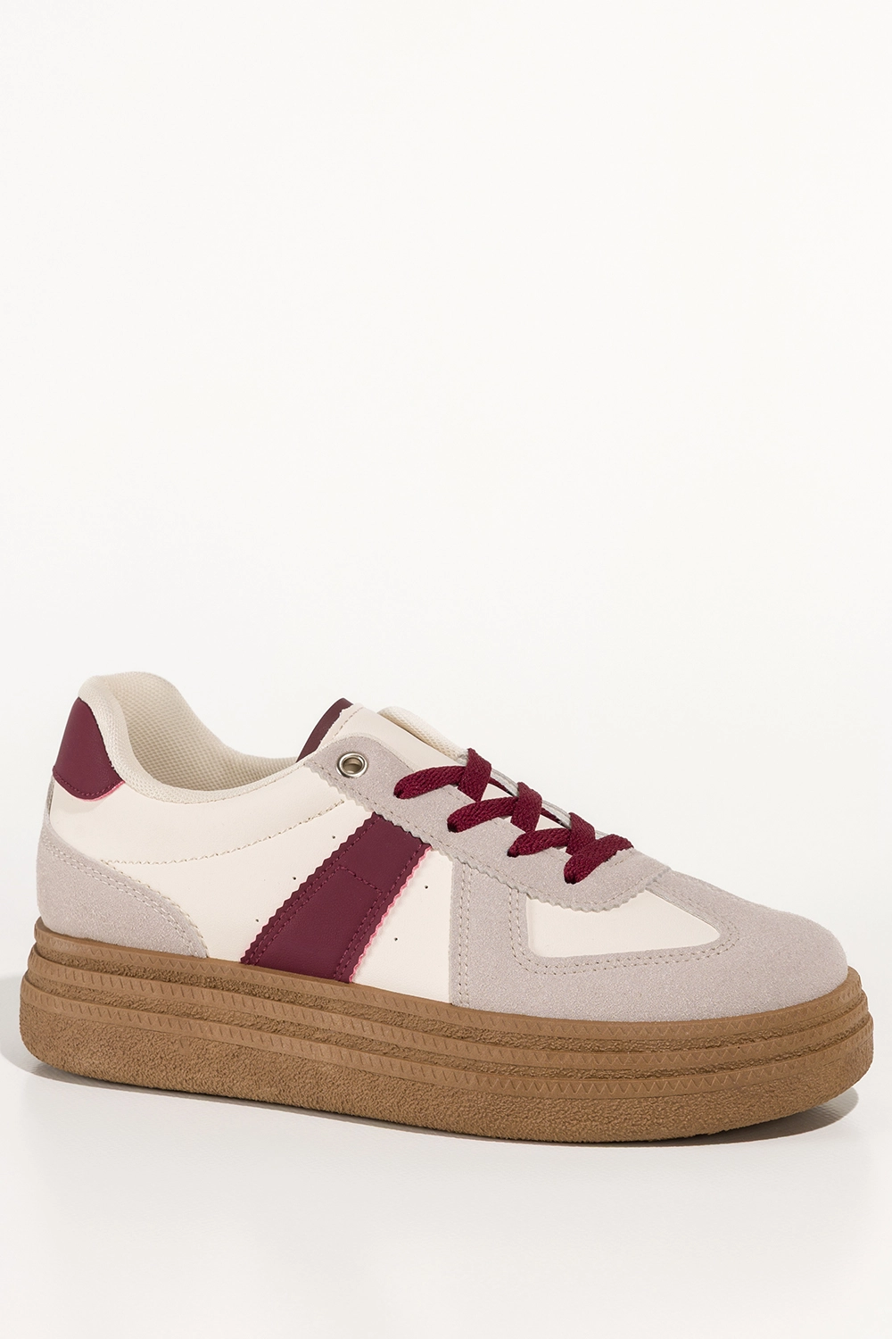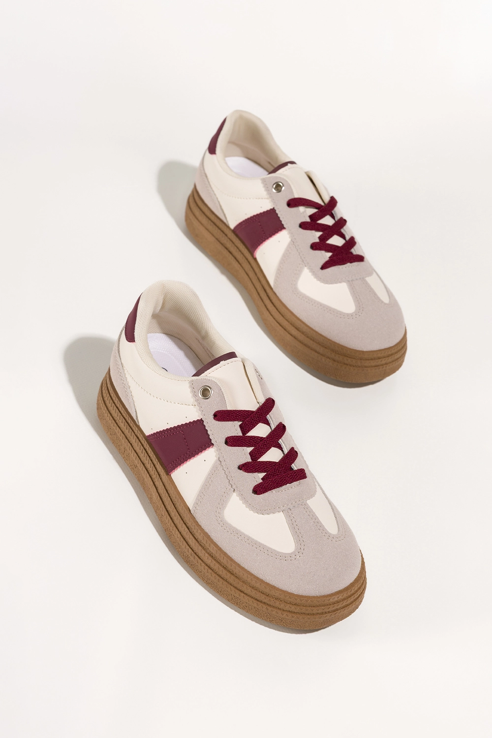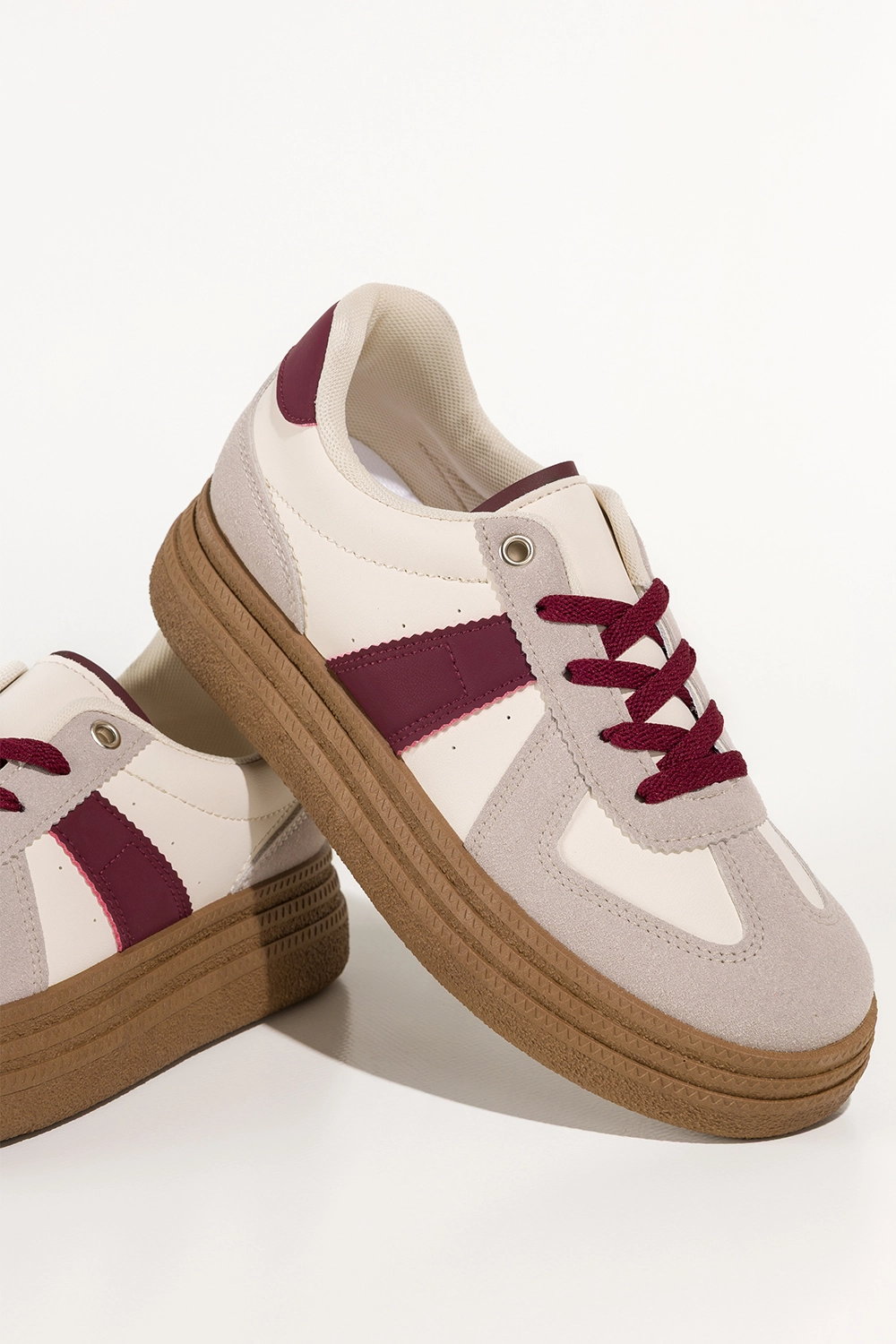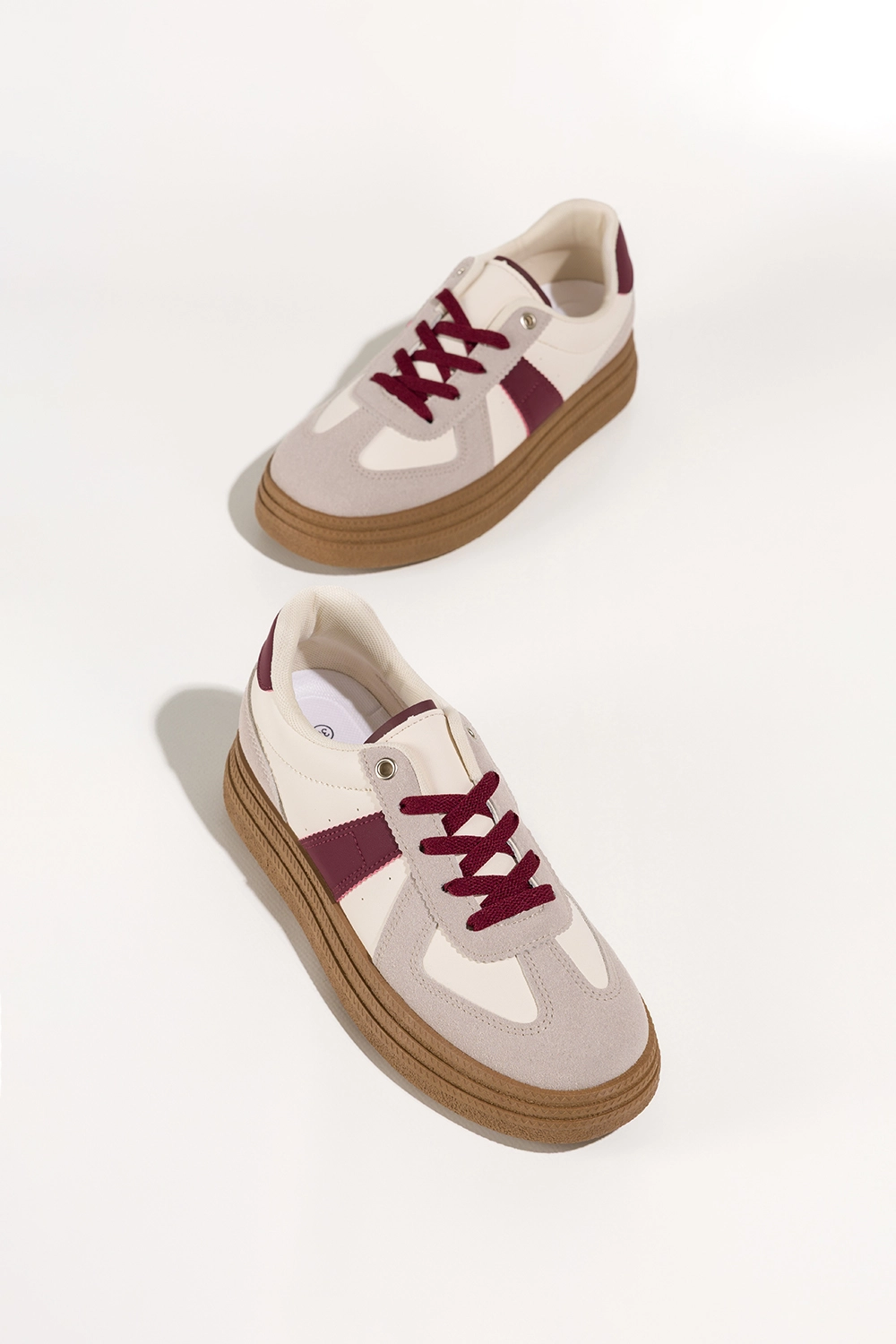 Funkcjonalność i cechy wyróżniające ten model czynią go obowiązkowym elementem garderoby każdej kobiety, która ceni modę w wydaniu komfortowym. Sneakersy zostały zaprojektowane z myślą o aktywnym stylu życia – są lekkie, elastyczne i oddychające. Bordowe sznurówki umożliwiają indywidualne dopasowanie do tęgości stopy, a usztywniony zapiętek stabilizuje ją podczas ruchu. Beżowa platforma nie tylko podkreśla nowoczesny charakter obuwia, ale również chroni przed chłodem i wilgocią. Wnętrze buta zostało starannie wykończone materiałem tekstylnym, który nie powoduje otarć i pozwala na całodniowe użytkowanie bez uczucia dyskomfortu. Ten model to połączenie nowoczesnej mody z codzienną praktycznością.