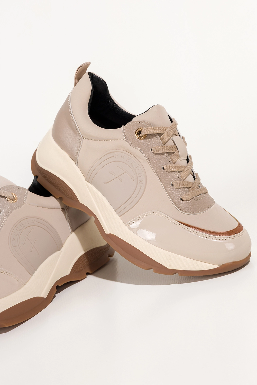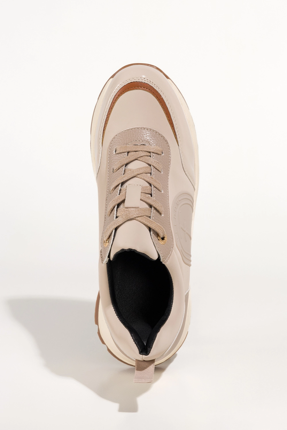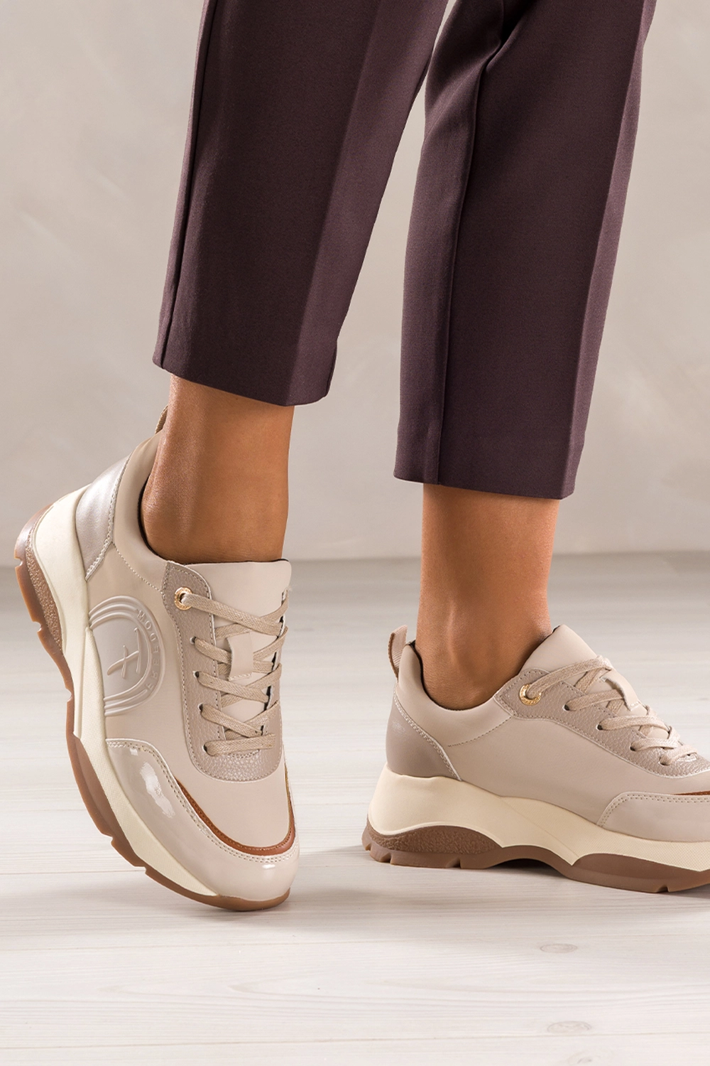 Beżowe sneakersy damskie buty sportowe na koturnie ze żłobieniami brązowe wstawki sznurowane Carla 4982