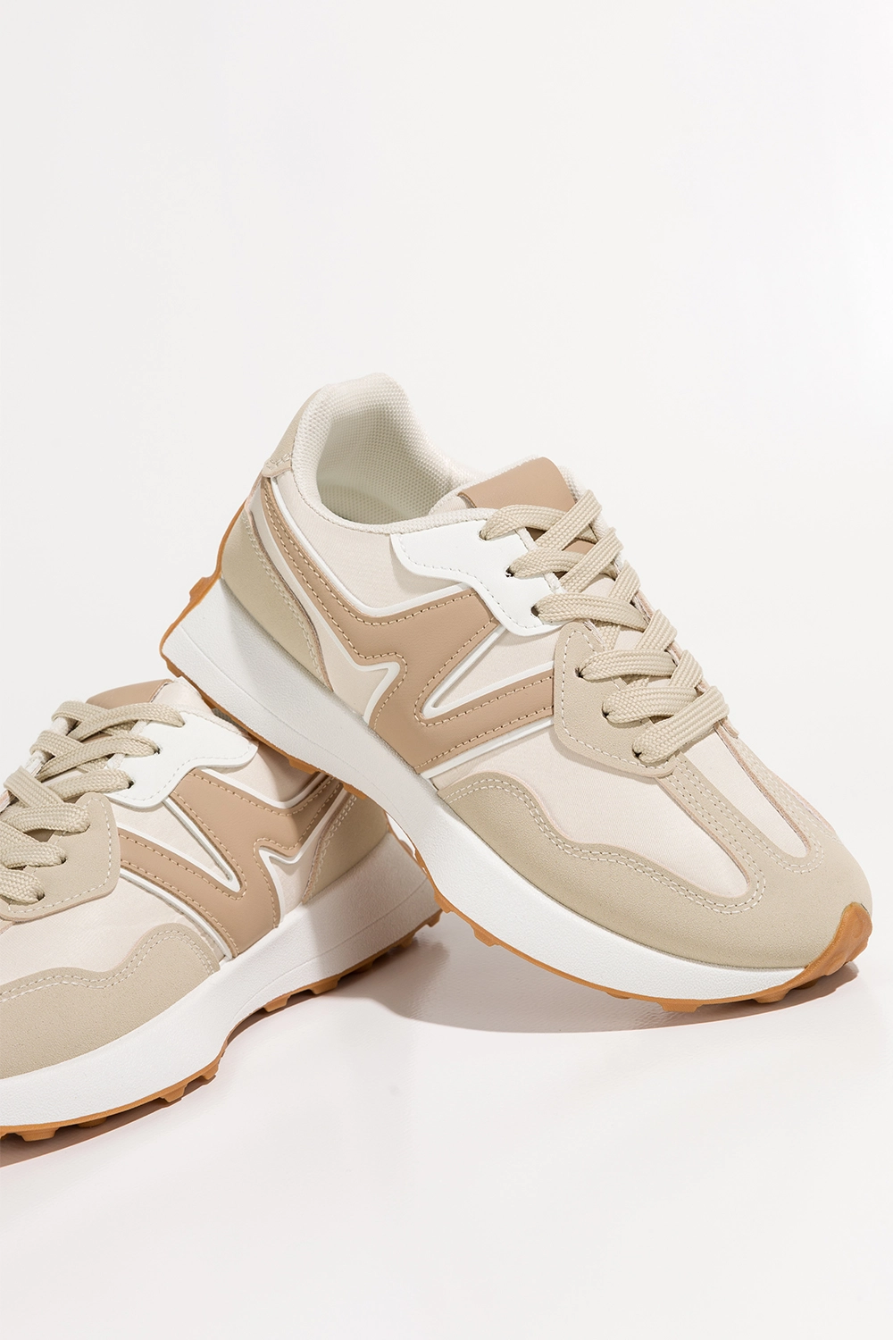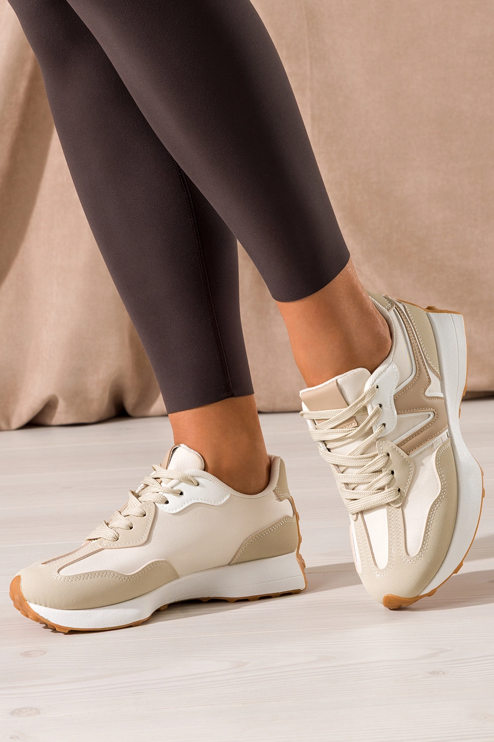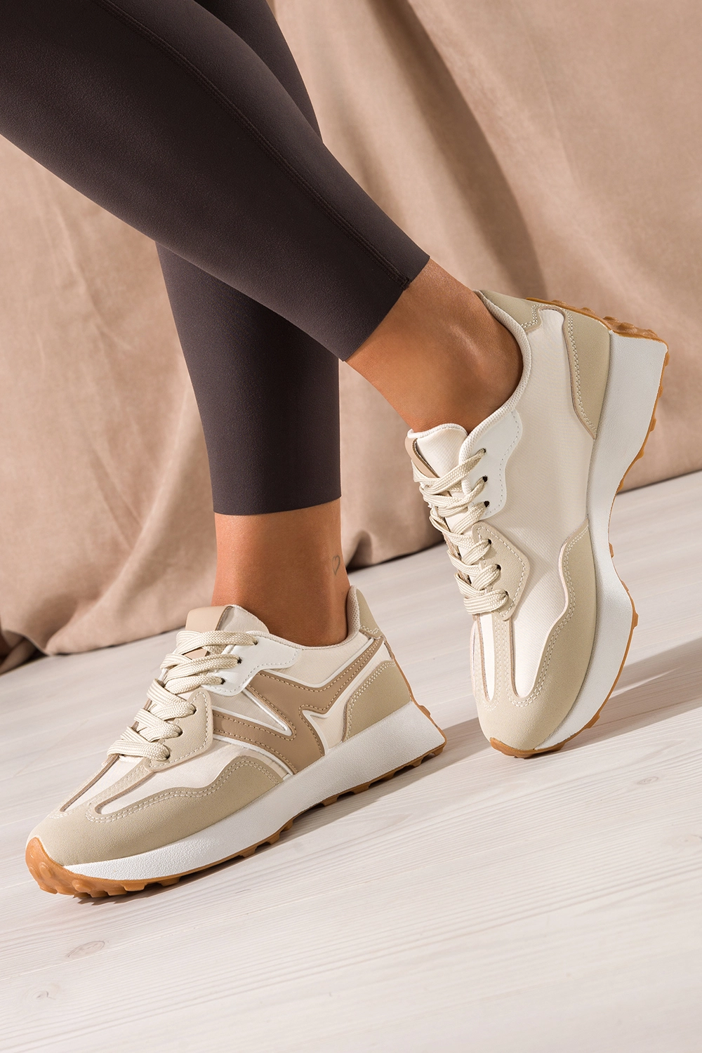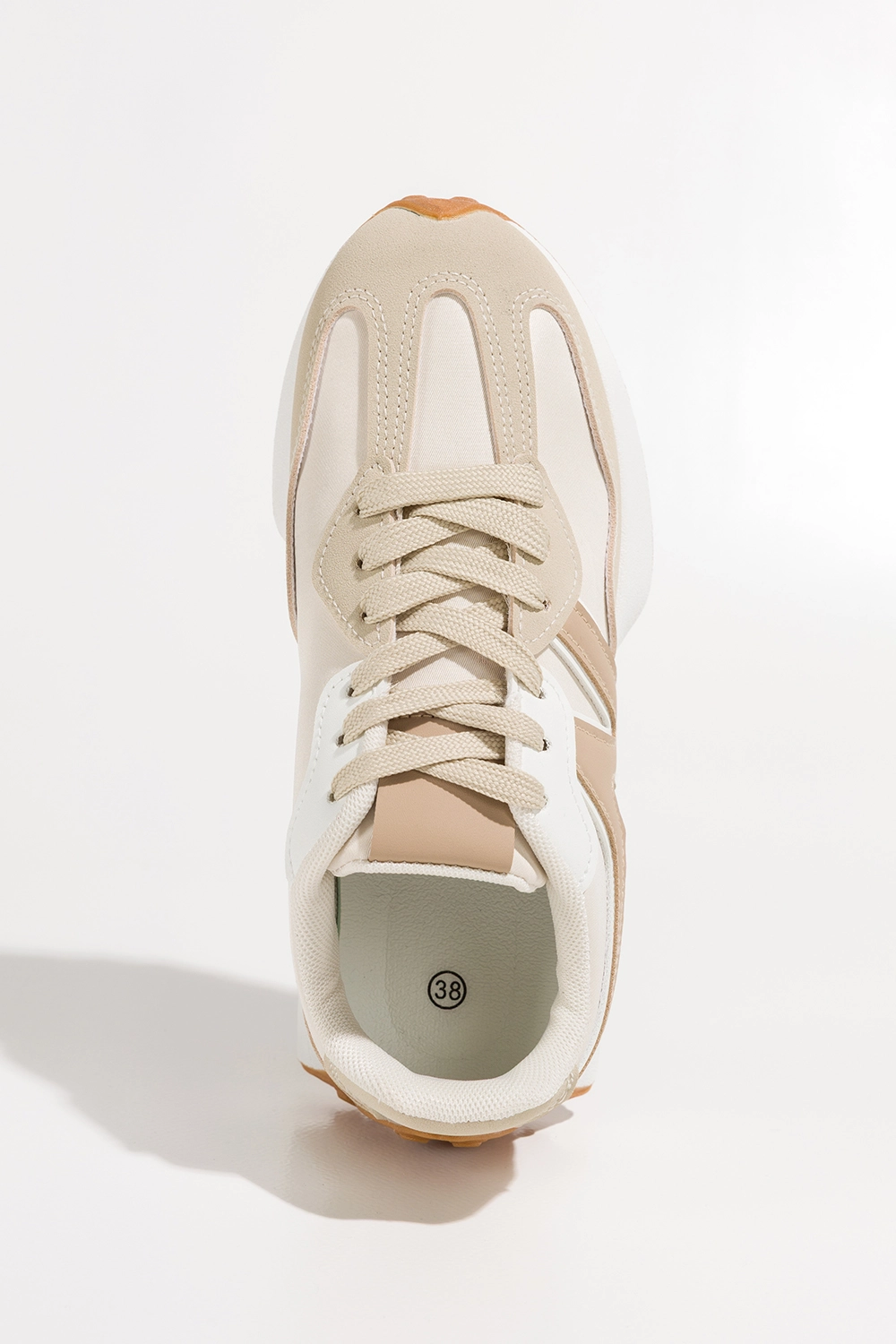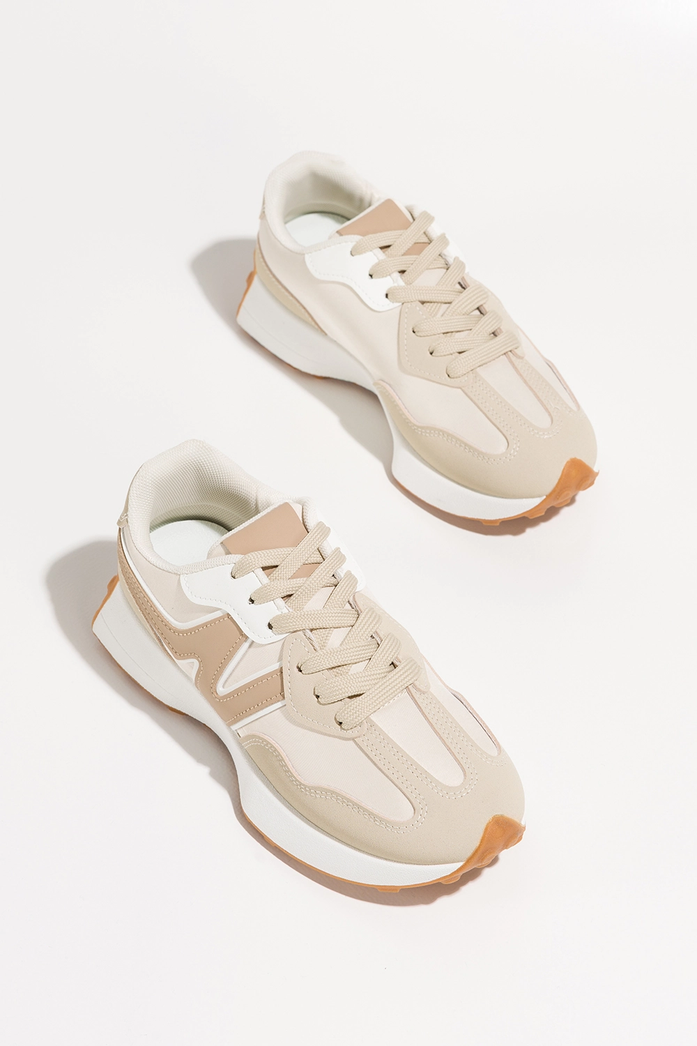 Beżowe sneakersy damskie na białej platformie ciemnobeżowe wstawki sznurowane Casu LA295