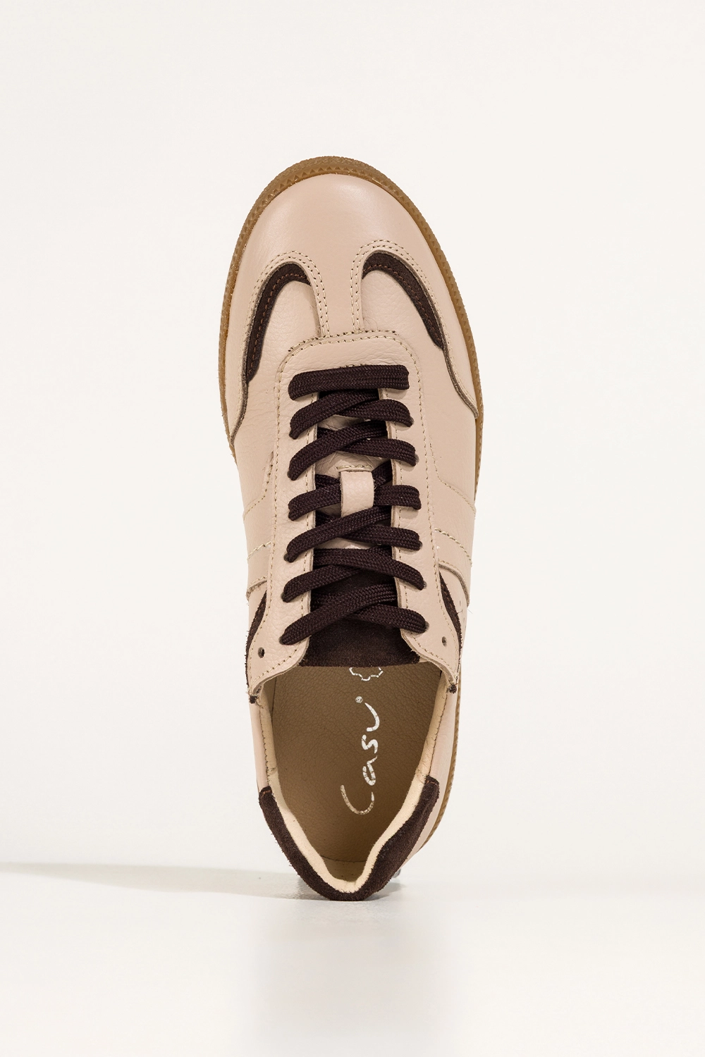 Beżowe sneakersy skórzane damskie buty sportowe na elastycznej podeszwie czekoladowe wstawki sznurowane PRODUKT POLSKI Casu model M8714, połączenie luksusowego designu i perfekcyjnego wykonania. Wyprodukowane z wysokogatunkowej skóry naturalnej, zachwycają trwałością, miękkością oraz odpornością na codzienne użytkowanie. Miękka wkładka ze skóry naturalnej gwarantuje doskonały komfort przez cały dzień, a staranne wykończenie sprawia, że każdy krok jest prawdziwą przyjemnością.