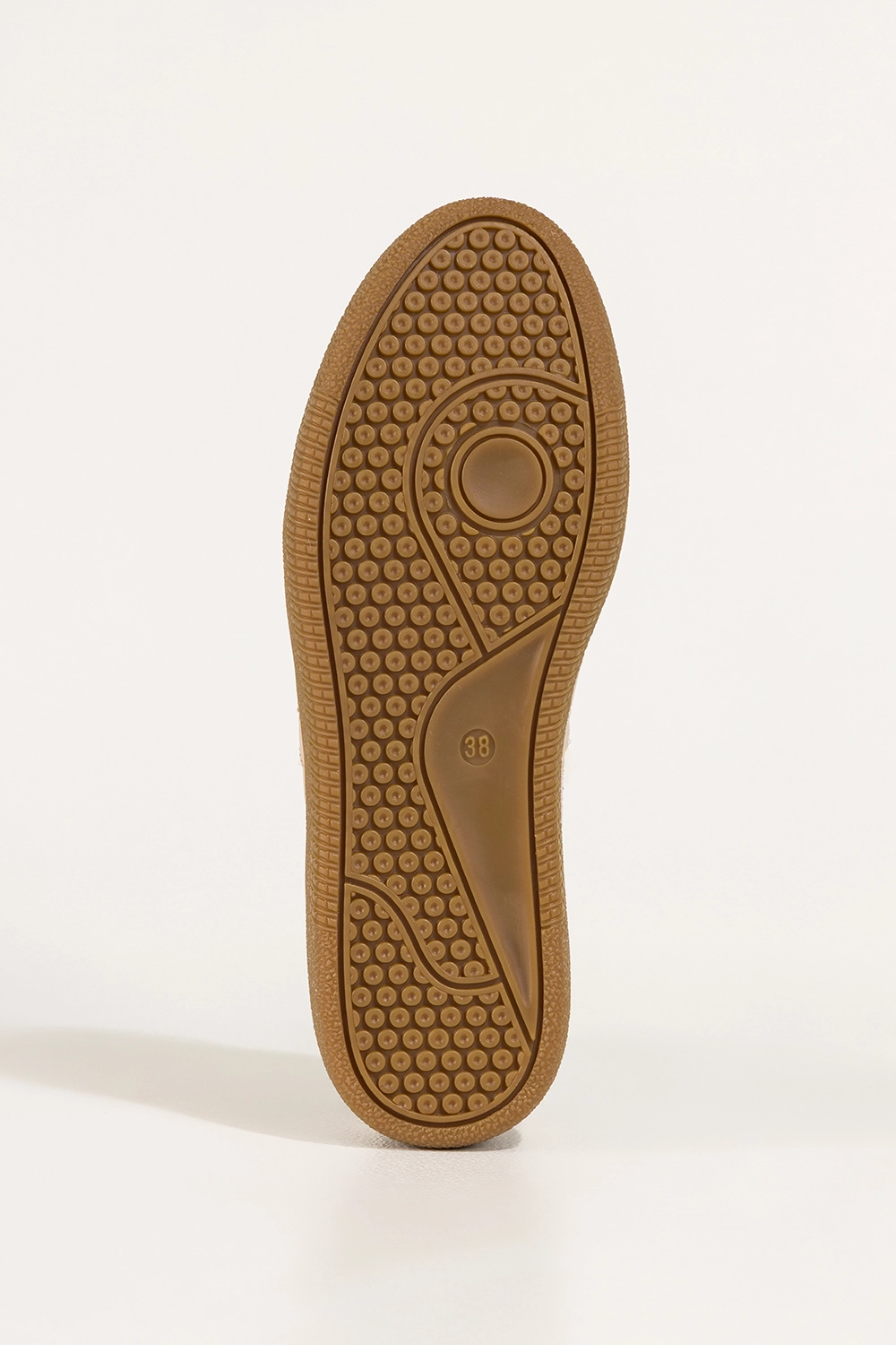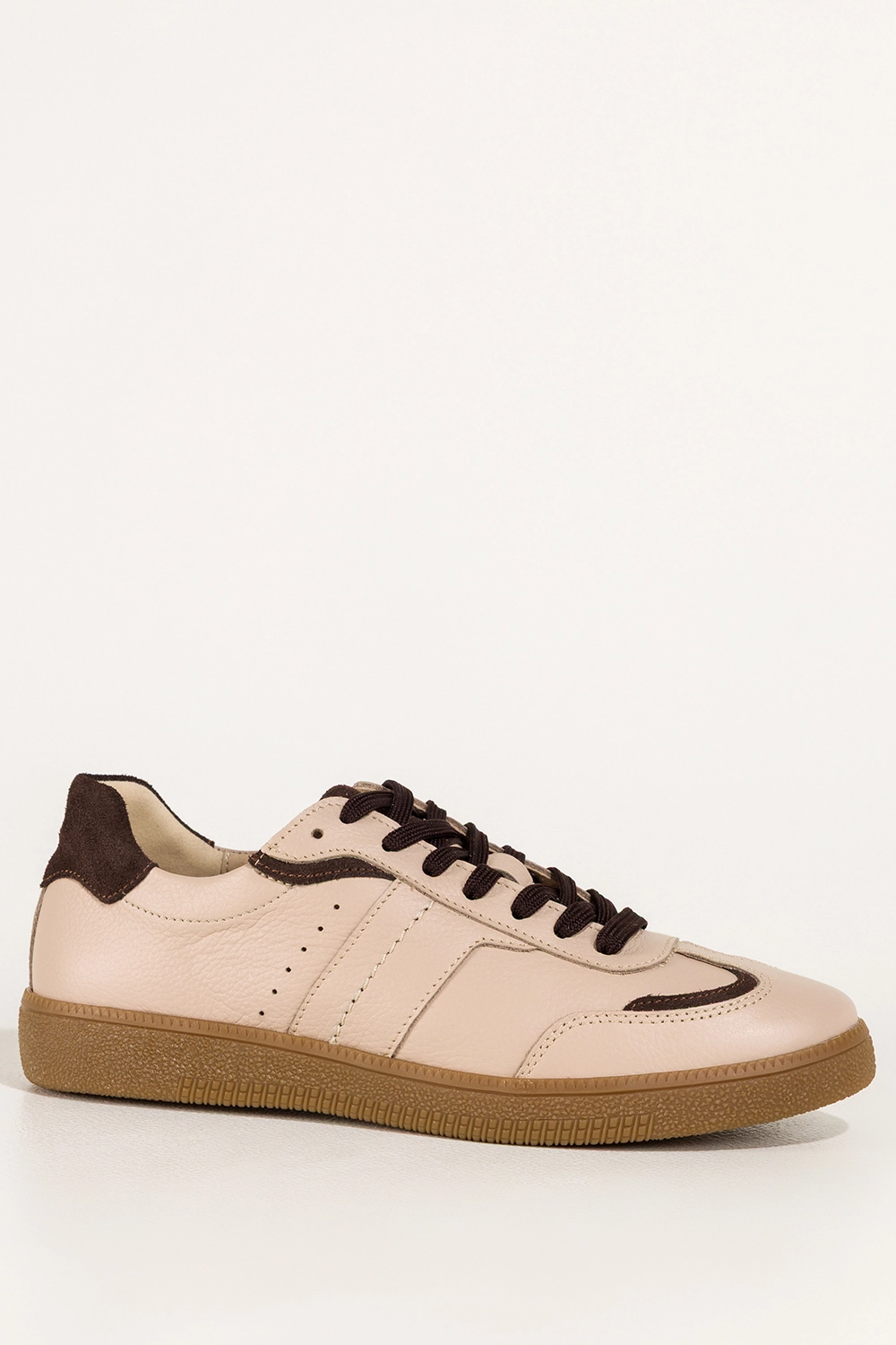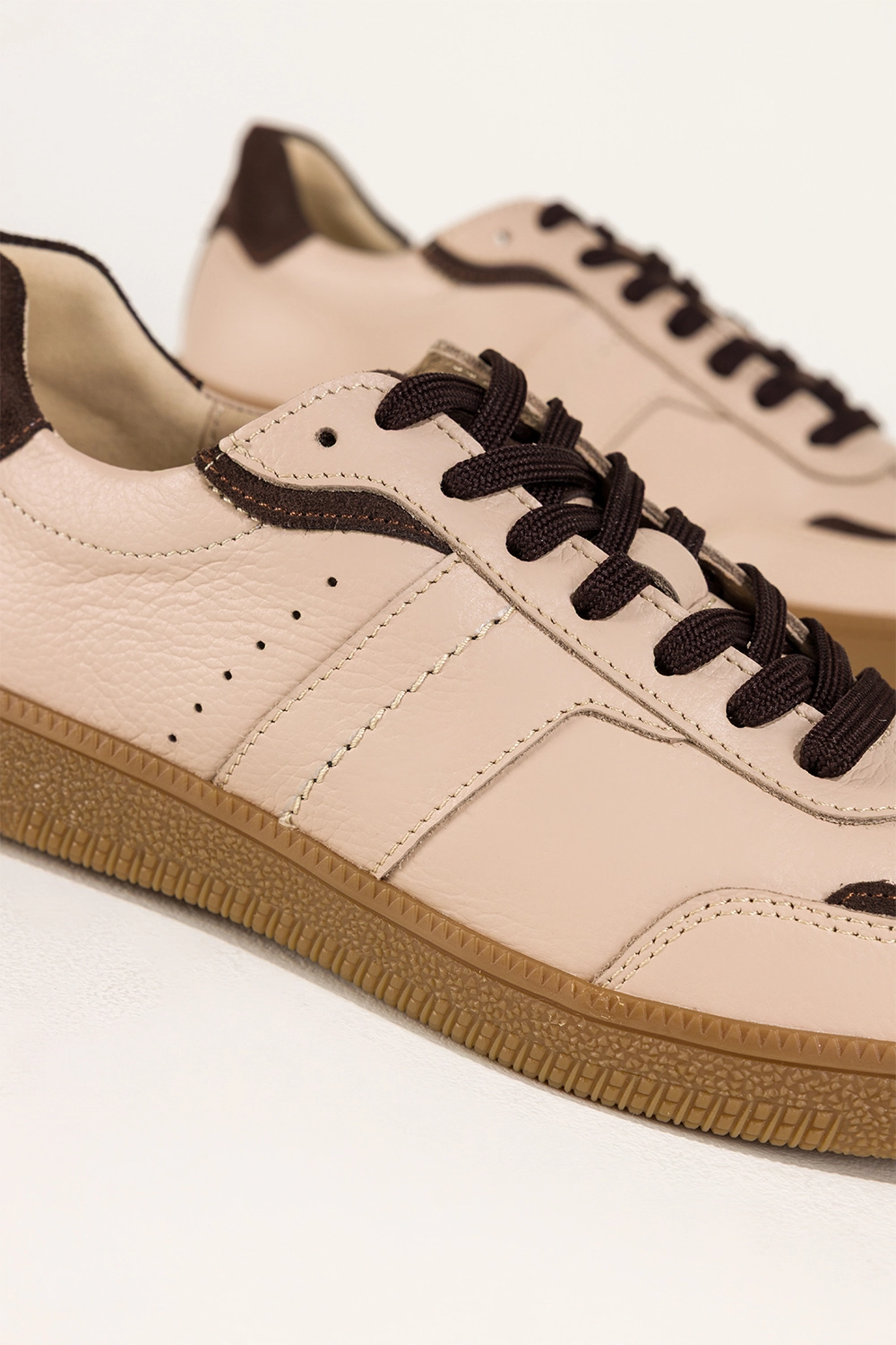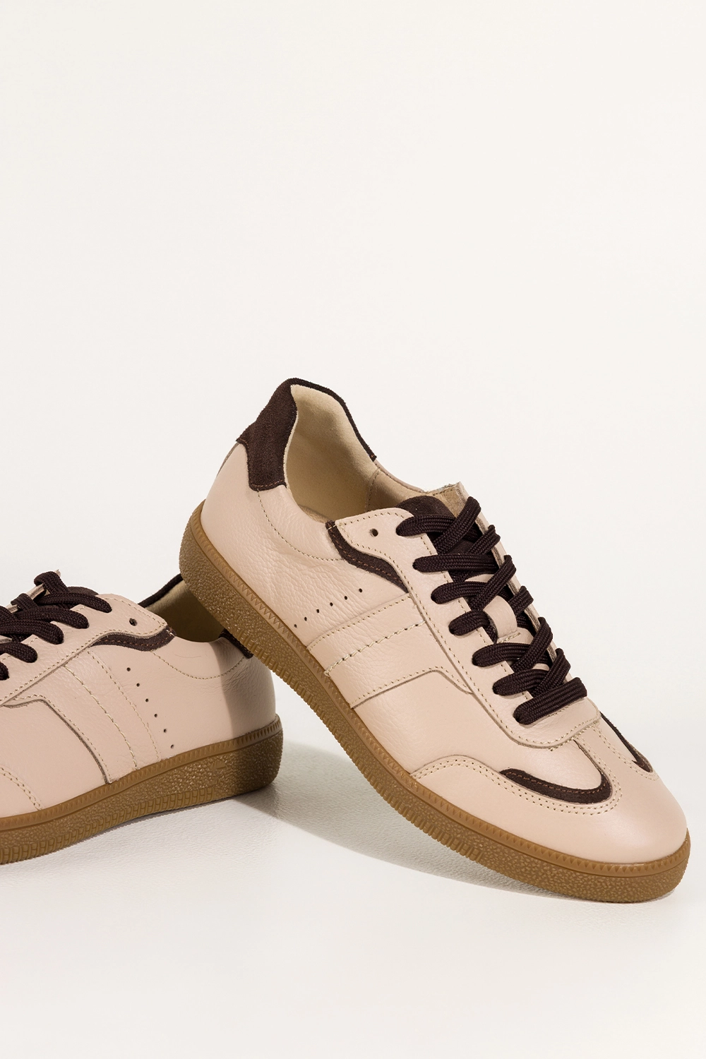Harmonijne zestawienie beżowej cholewki z czekoladowymi wstawkami oraz sznurówkami nadaje butom wyjątkowy charakter. Elastyczna, płaska beżowa podeszwa zapewnia stabilność i lekkość, a zaokrąglony nosek podkreśla kobiecy styl. Uniwersalny design pozwala dopasować sneakersy do wielu stylizacji, od casualowych jeansów po eleganckie sukienki.