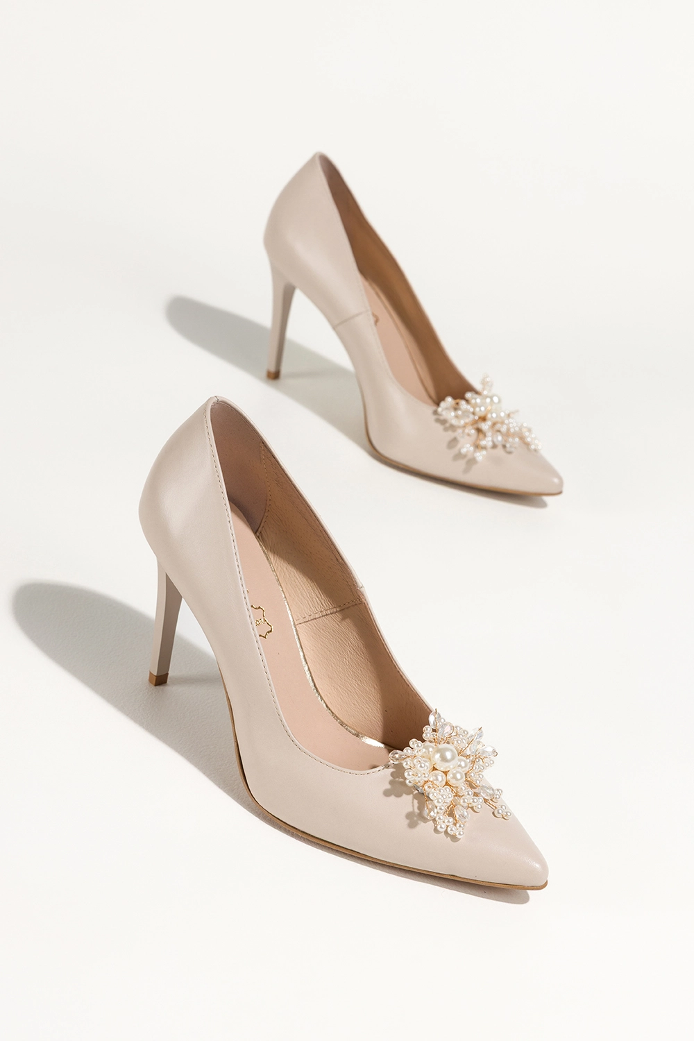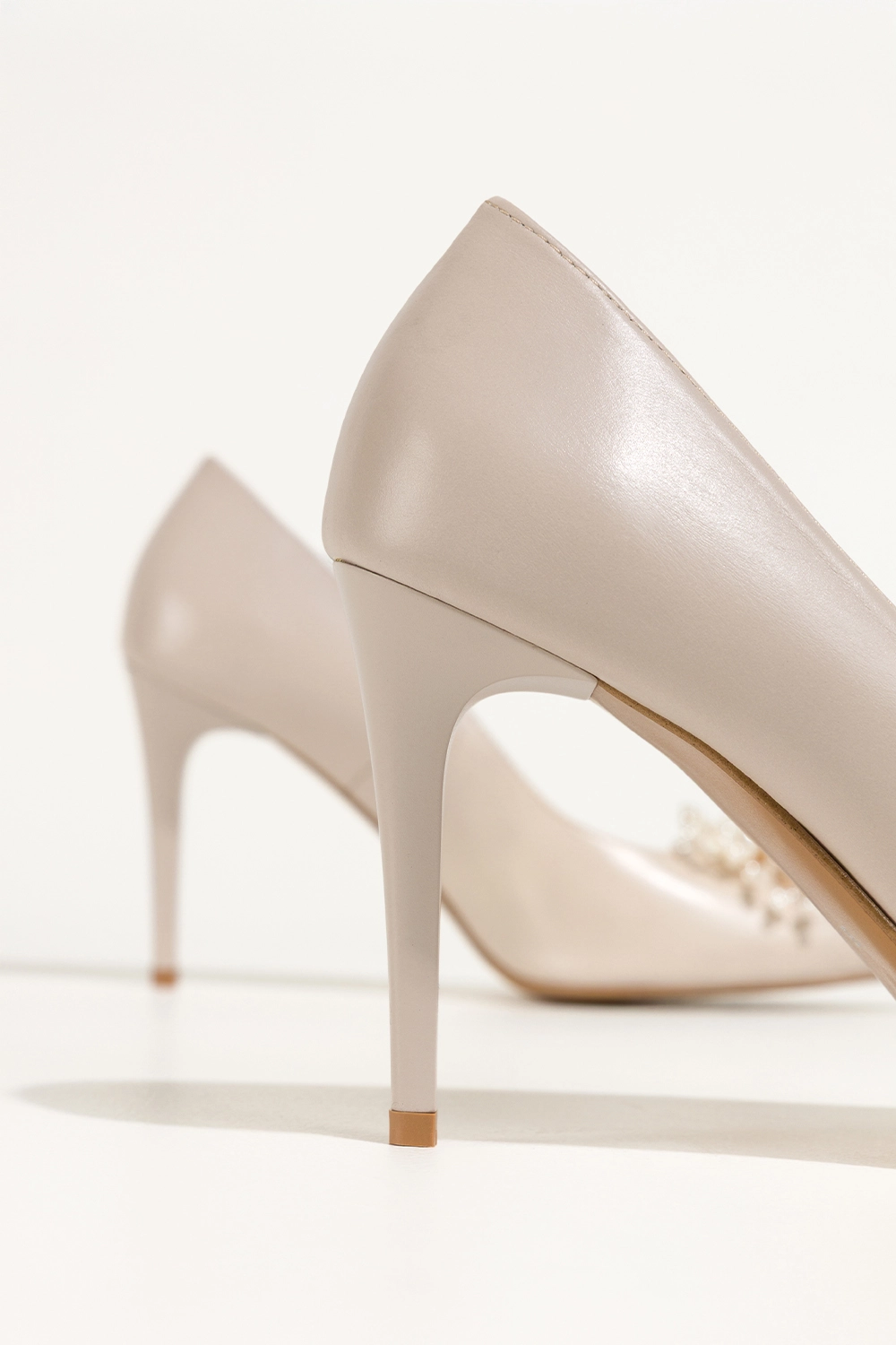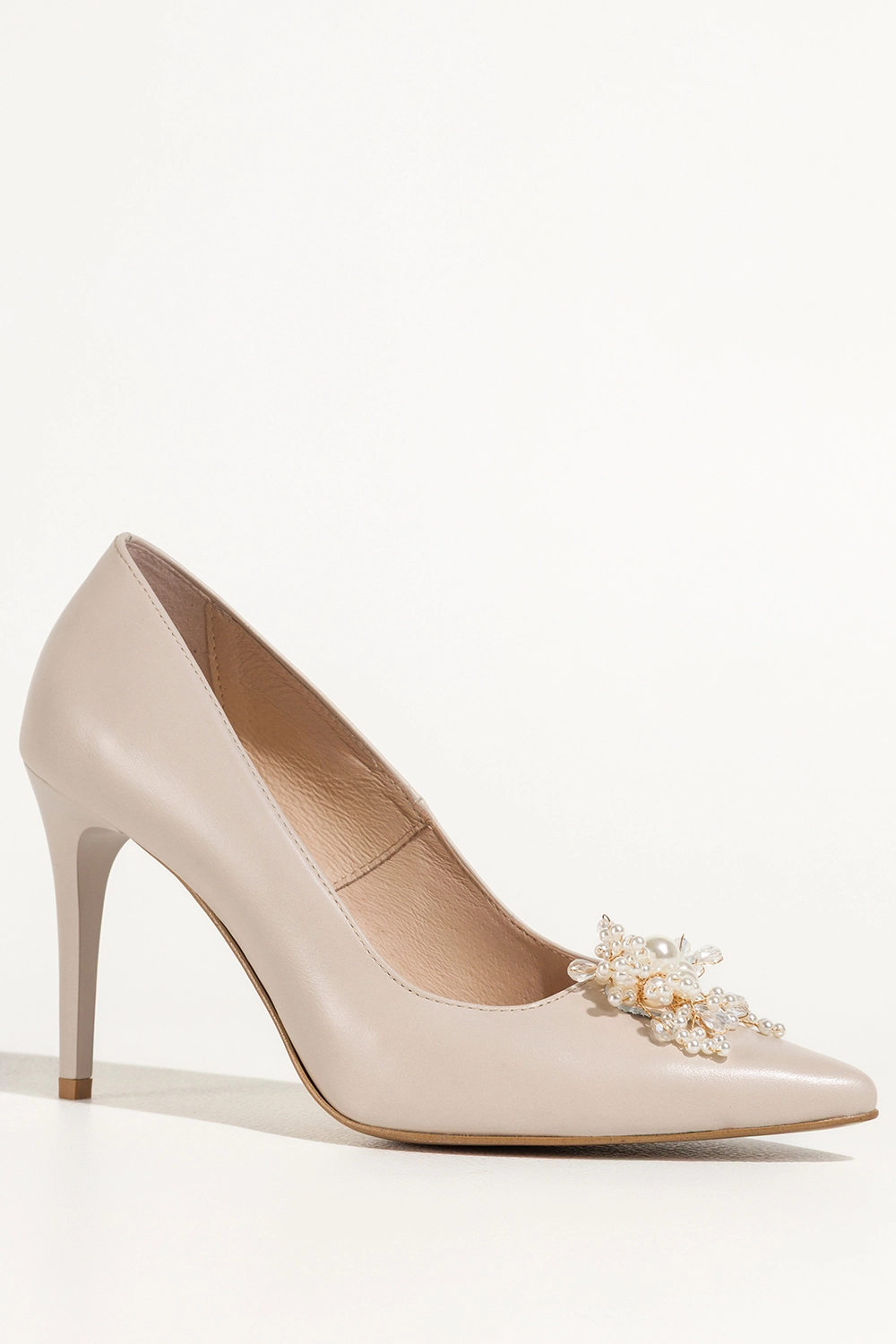 Beżowe szpilki skórzane damskie ozdoba z perełek i koralików PRODUKT POLSKI Casu 6935-Z94
