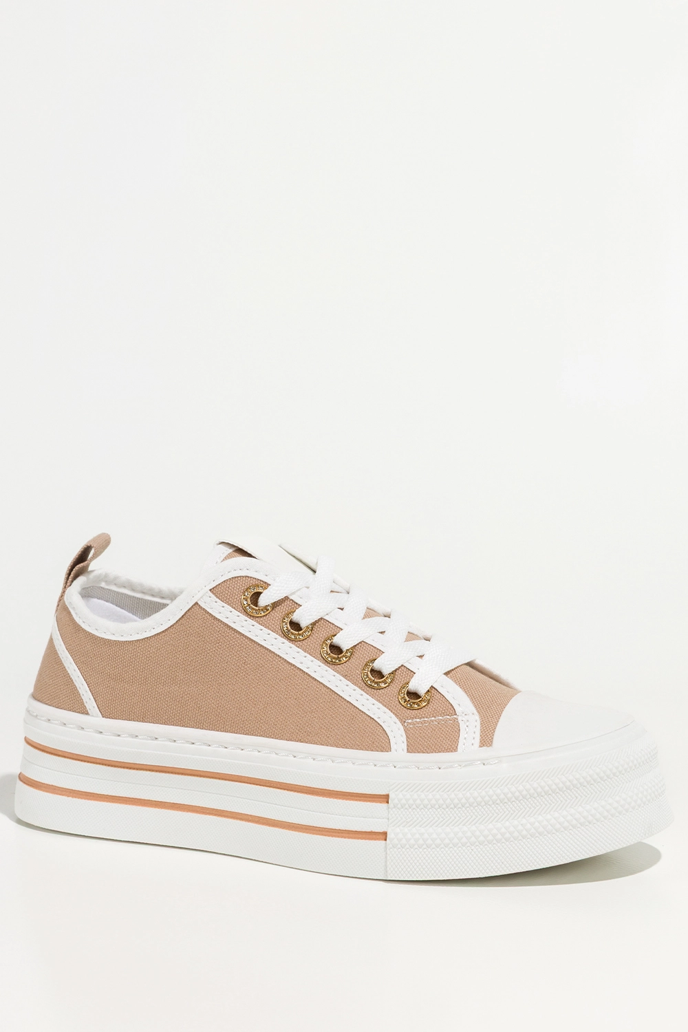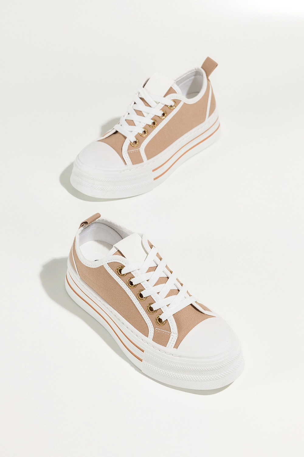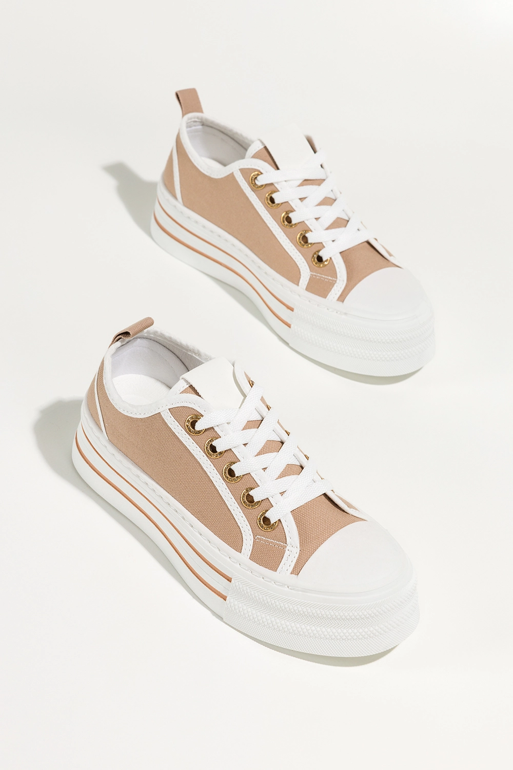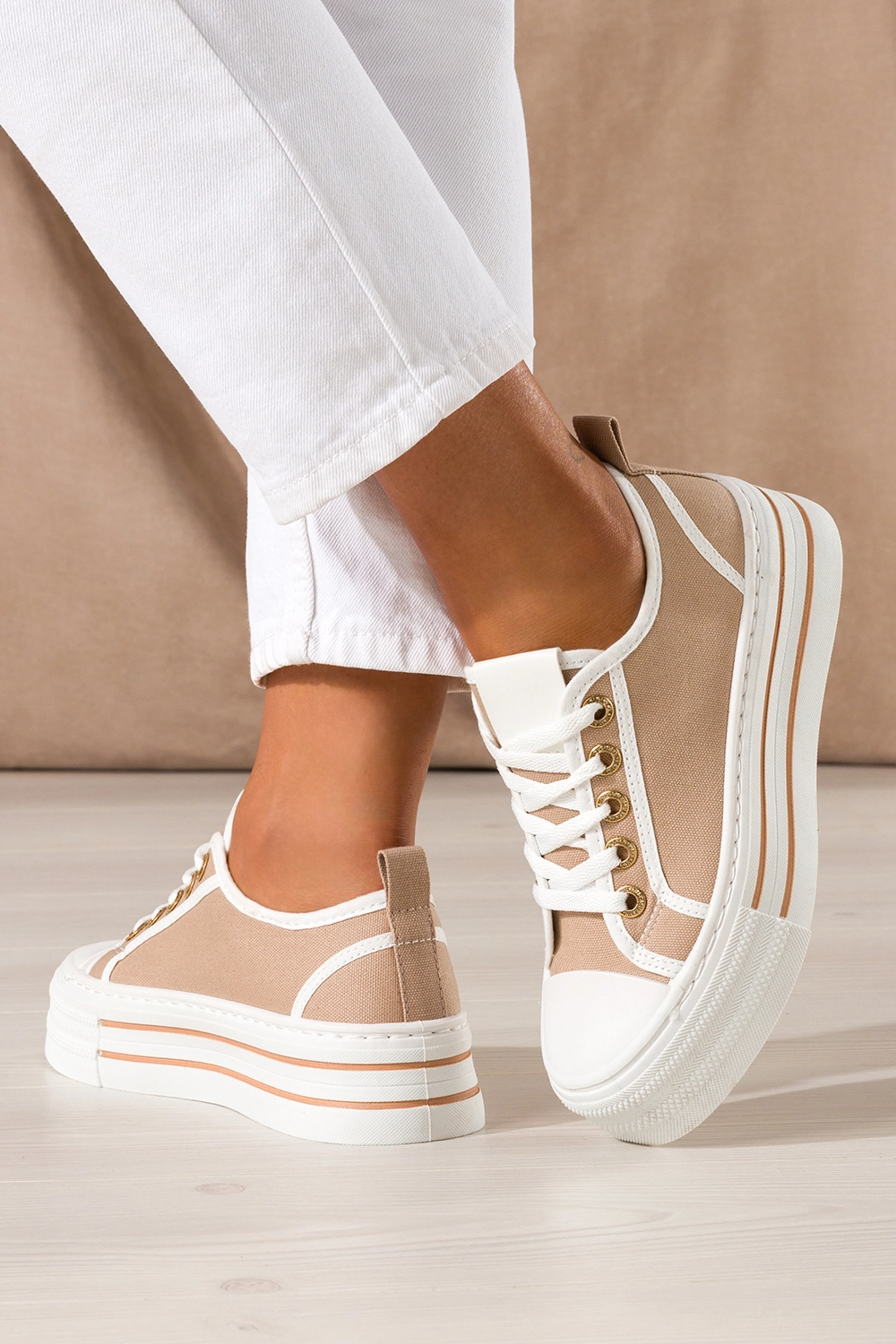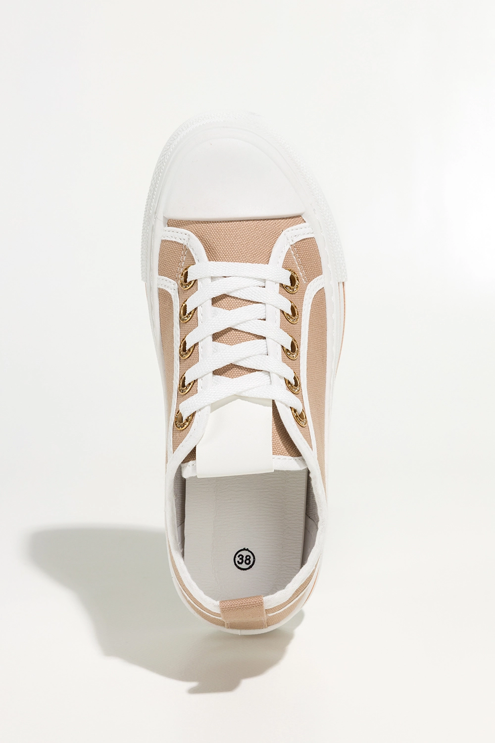 Beżowe trampki damskie sneakersy na platformie ozdobne oczka z cyrkoniami sznurowane Carla 9150