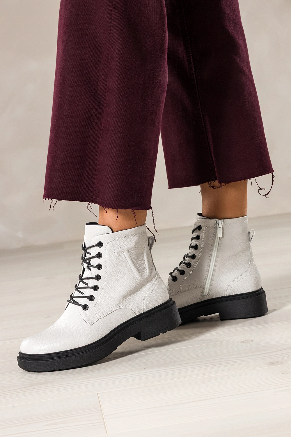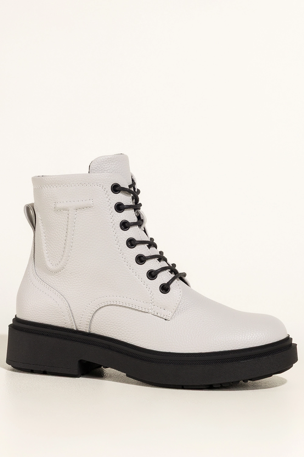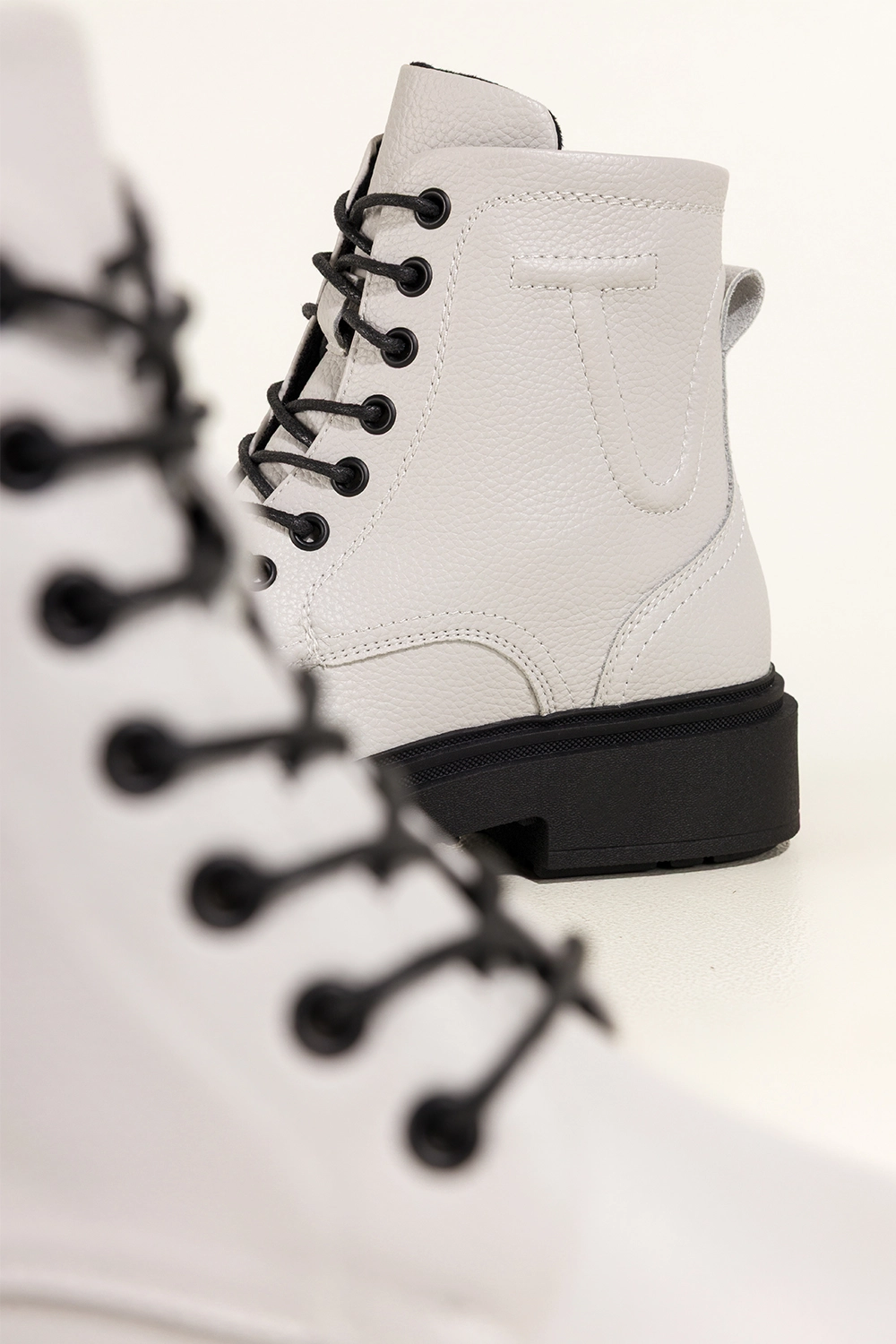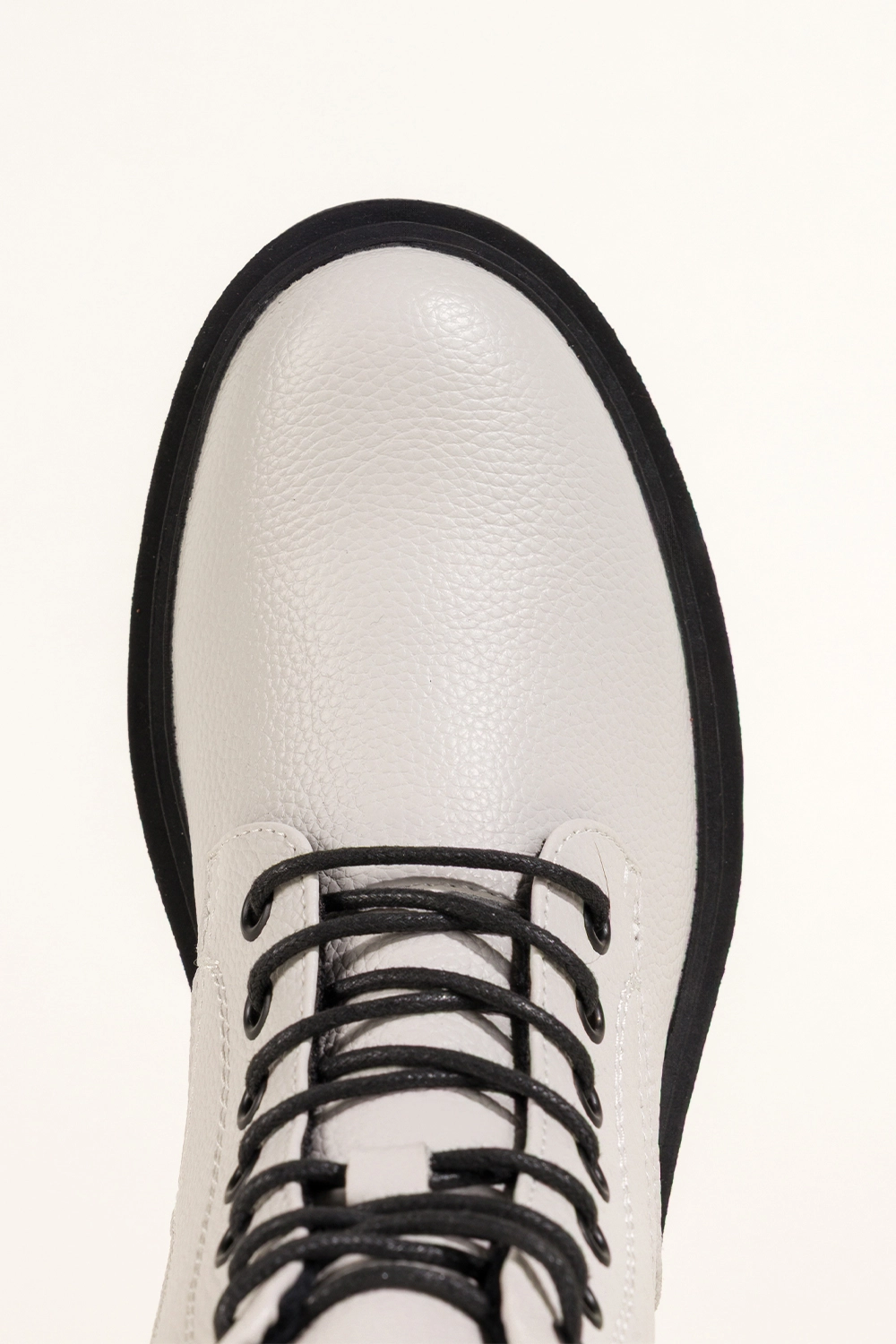 Białe botki skórzane damskie Sergio Leone na czarnej żłobionej platformie ozdobne przeszycia na cholewce sznurowane model YG74751-H, to synonim niezawodnej jakości i ponadczasowego stylu. Wykonane z wysokogatunkowej, naturalnej skóry, zapewniają trwałość i komfort noszenia na najwyższym poziomie. Ich wnętrze ocieplone miękkim kocem obuwniczym otula stopę ciepłem i wygodą nawet w najchłodniejsze dni. Stabilna, czarna platforma ze żłobieniami nie tylko podkreśla charakter butów, ale także zapewnia przyczepność i bezpieczeństwo na różnych nawierzchniach.