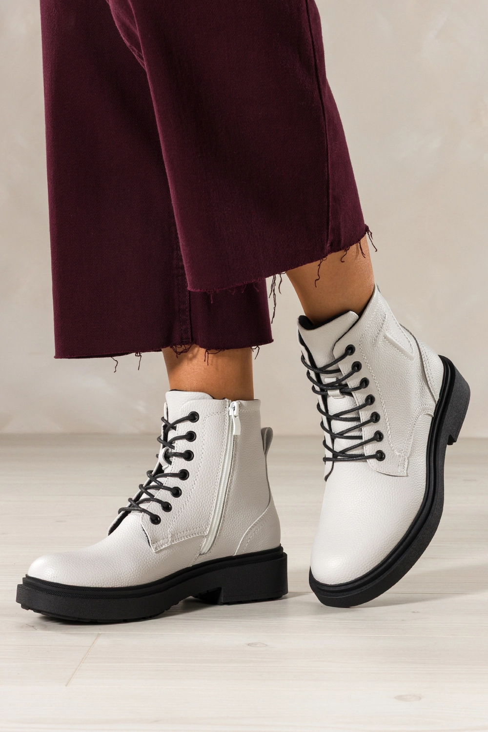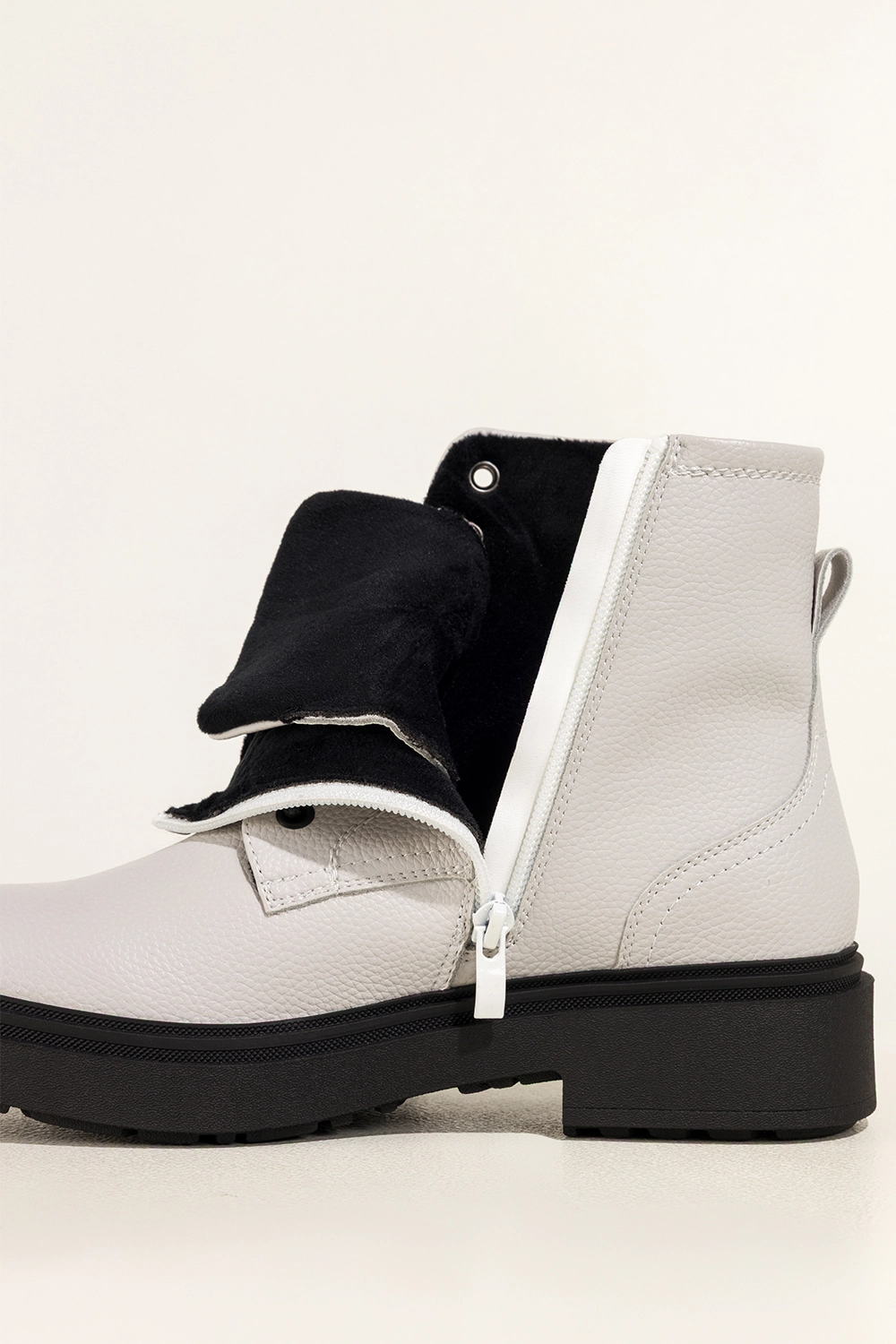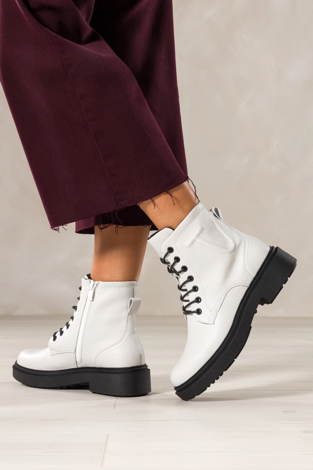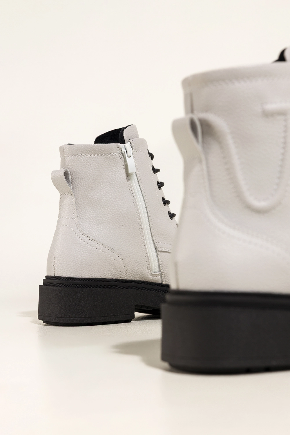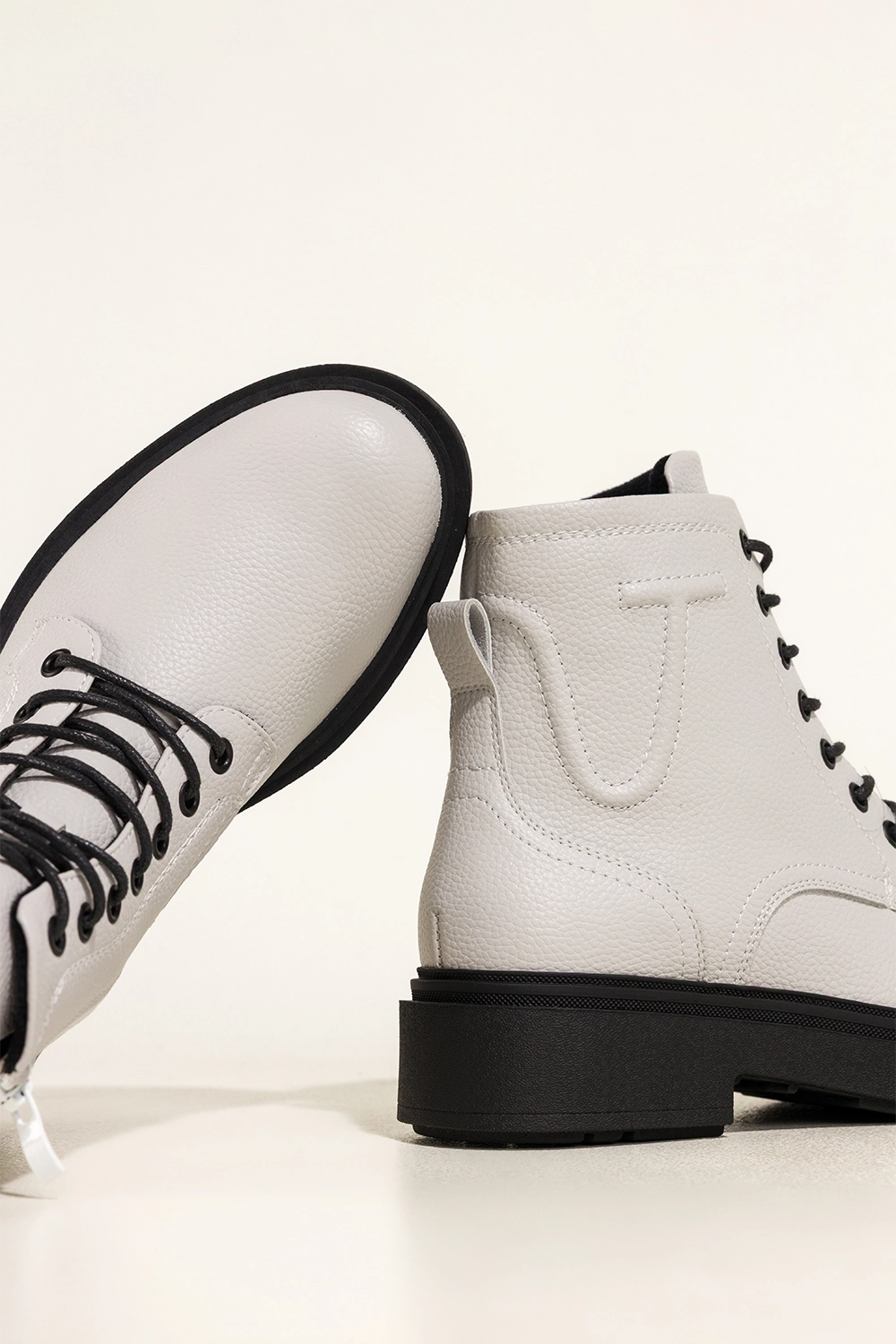 Białe botki skórzane damskie Sergio Leone na czarnej żłobionej platformie ozdobne przeszycia na cholewce sznurowane model YG74751-H, to synonim niezawodnej jakości i ponadczasowego stylu. Wykonane z wysokogatunkowej, naturalnej skóry, zapewniają trwałość i komfort noszenia na najwyższym poziomie. Ich wnętrze ocieplone miękkim kocem obuwniczym otula stopę ciepłem i wygodą nawet w najchłodniejsze dni. Stabilna, czarna platforma ze żłobieniami nie tylko podkreśla charakter butów, ale także zapewnia przyczepność i bezpieczeństwo na różnych nawierzchniach.