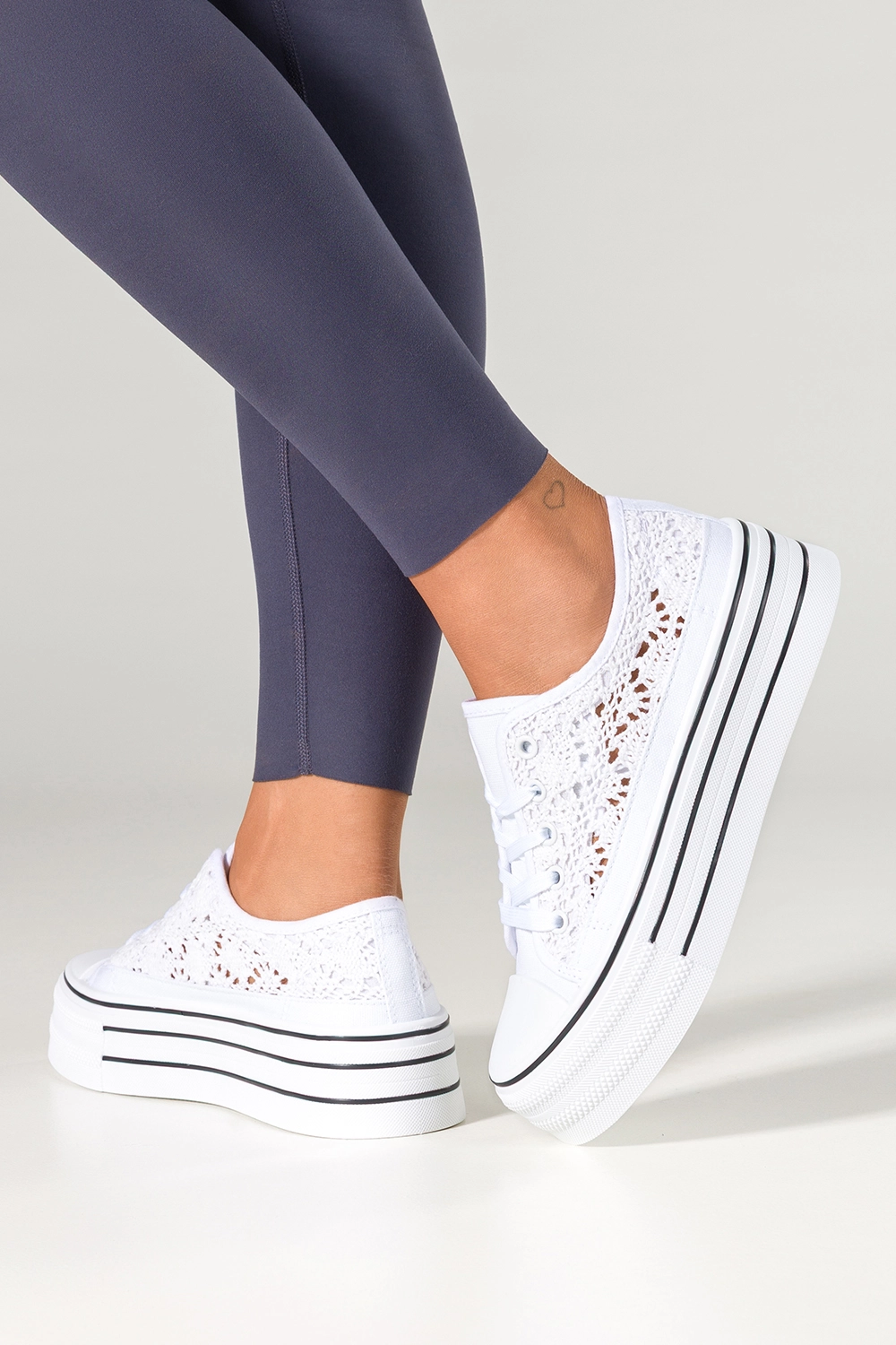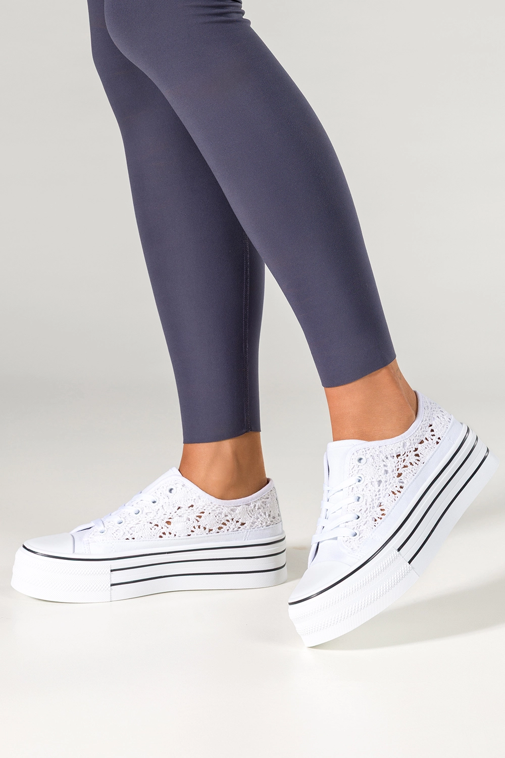 Unikalny design i wyjątkowe detale sprawiają, że trampki wyróżniają się na tle innych modeli dostępnych na rynku. Subtelna koronka nie tylko nadaje im lekkości, ale także podkreśla indywidualny charakter właścicielki. Czarna linia na białej platformie wprowadza nowoczesny kontrast, który nadaje obuwiu modowego sznytu. Zaokrąglony nosek i klasyczne sznurowanie to detale, które gwarantują ponadczasowość tego modelu, a jednocześnie sprawiają, że trampki są łatwe w zakładaniu i dopasowywaniu do stopy. To propozycja dla kobiet, które cenią sobie oryginalność i chcą się wyróżniać, nie rezygnując przy tym z wygody i codziennej funkcjonalności.