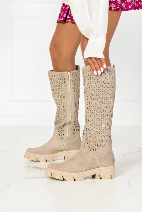 Beżowe kozaki ażurowe na platformie polska skóra Casu 2866 G