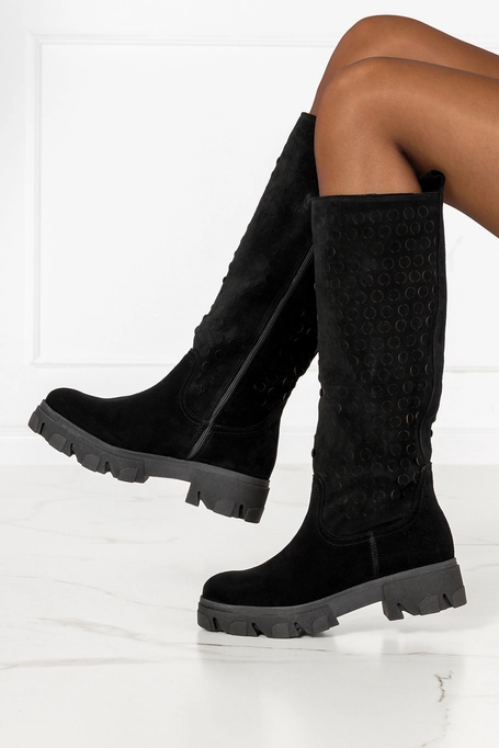 Czarne kozaki ażurowe na platformie polska skóra Casu 2866 G