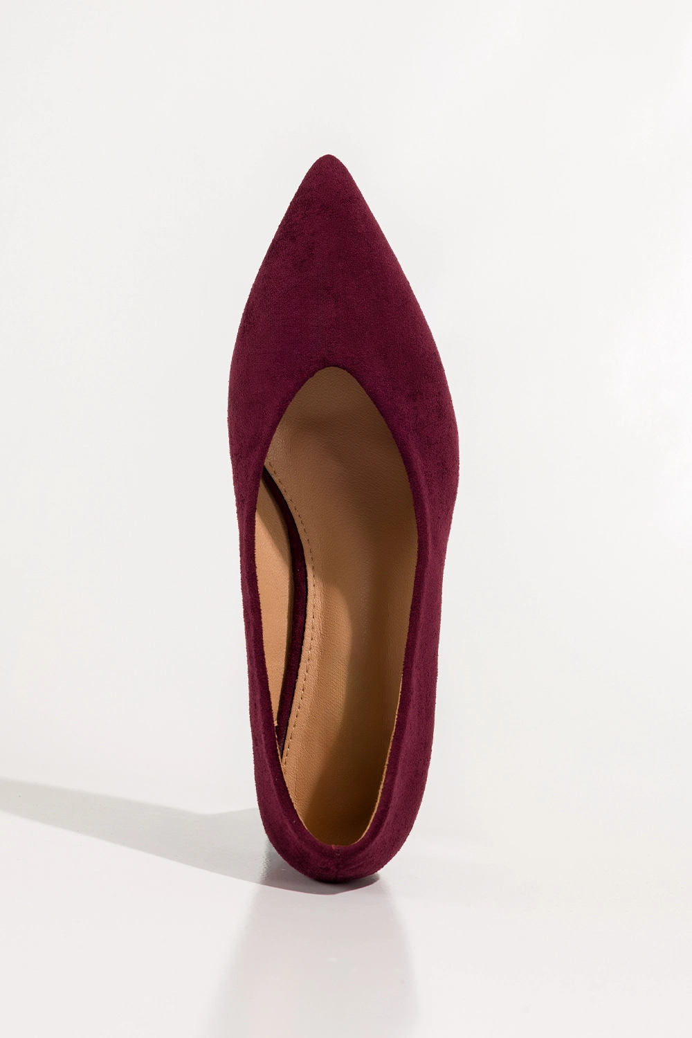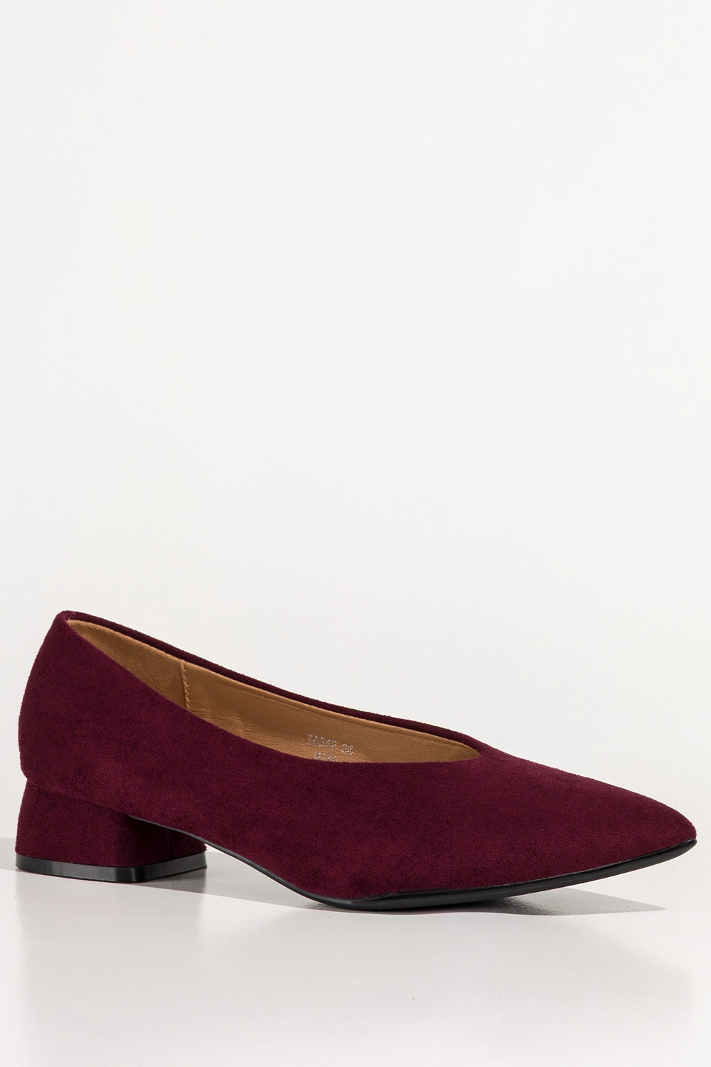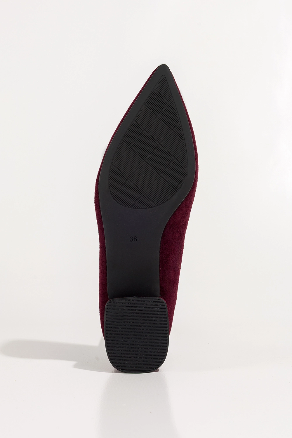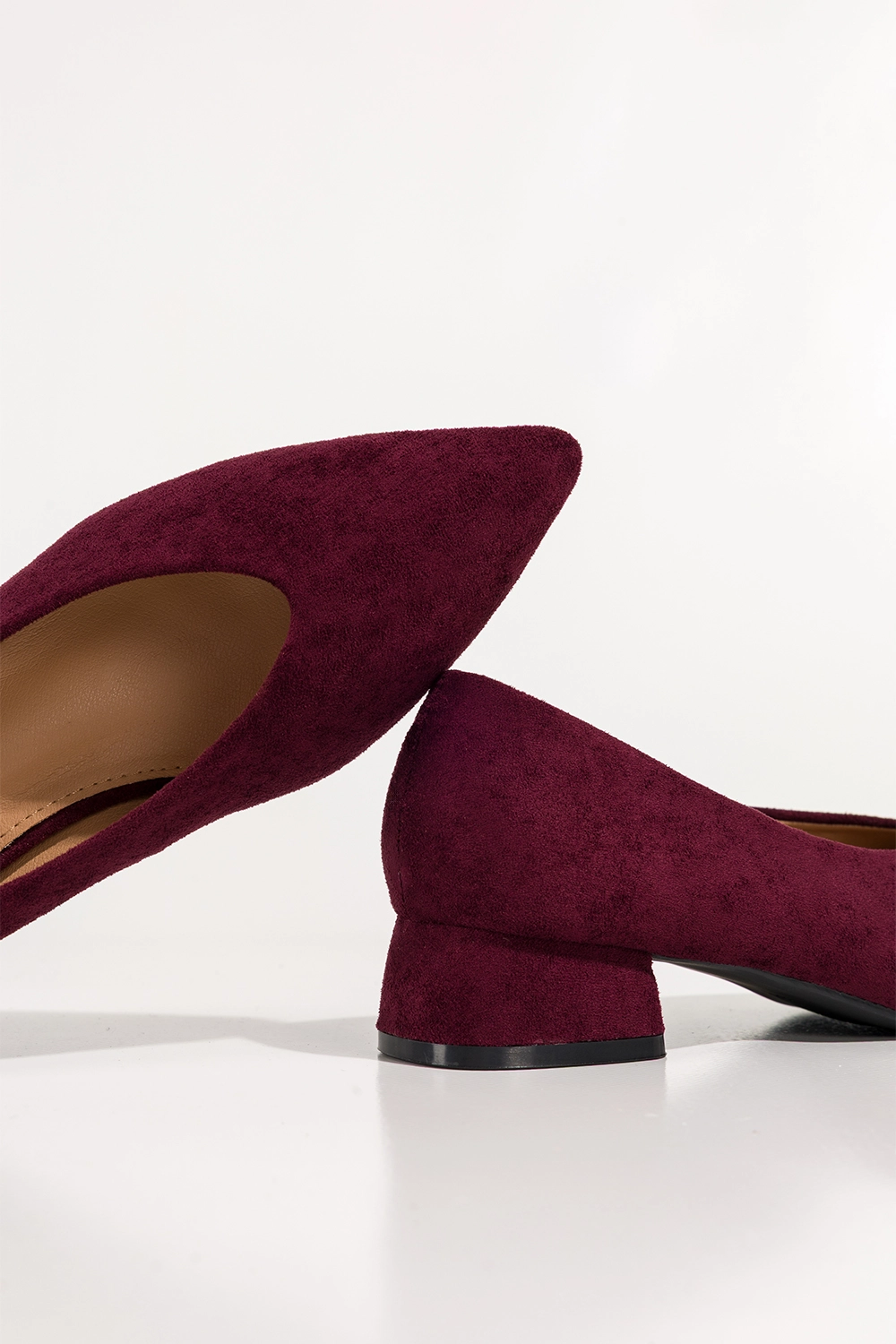 Bordowe baleriny damskie na niskim obcasie wycięcie z przodu Carla model T654P to idealne połączenie klasycznej kobiecej elegancji i nowoczesnego designu. Wykonane z miękkiej, wysokogatunkowej zamszowej skóry ekologicznej, gwarantują nie tylko zniewalający wygląd, ale i pełen komfort noszenia przez cały dzień. Szlachetny odcień bordowy przyciąga spojrzenia i nadaje stylizacji wyjątkowego charakteru. Delikatne wycięcie z przodu podkreśla linię stopy, dodając całości subtelnej zmysłowości. Wsuwana konstrukcja sprawia, że baleriny są nie tylko stylowe, ale również niezwykle praktyczne i wygodne w codziennym użytkowaniu.