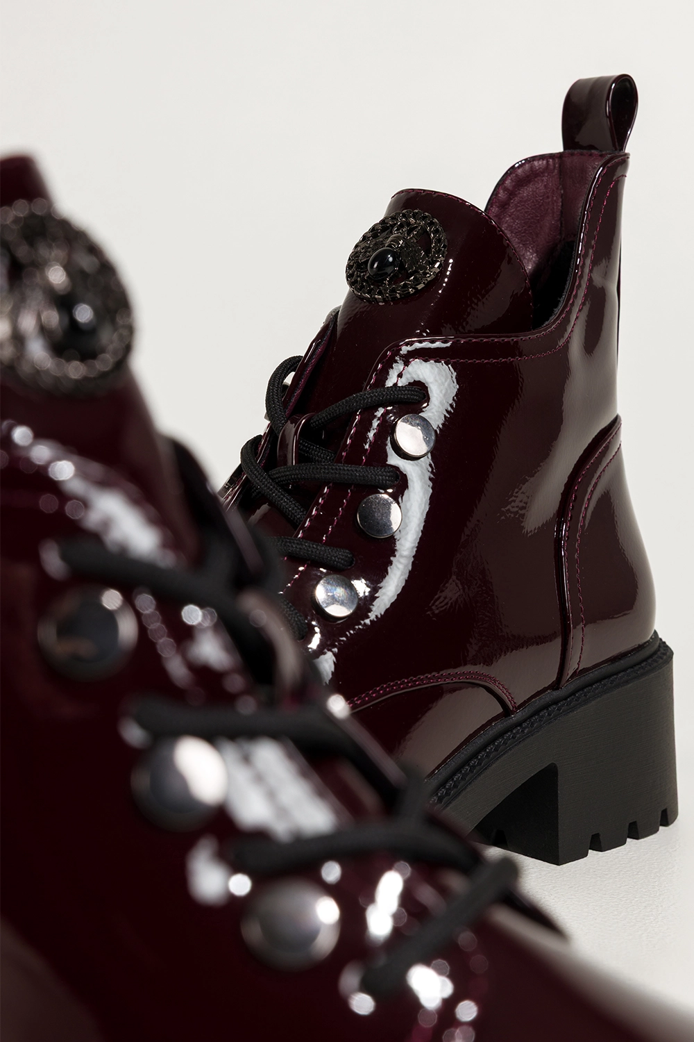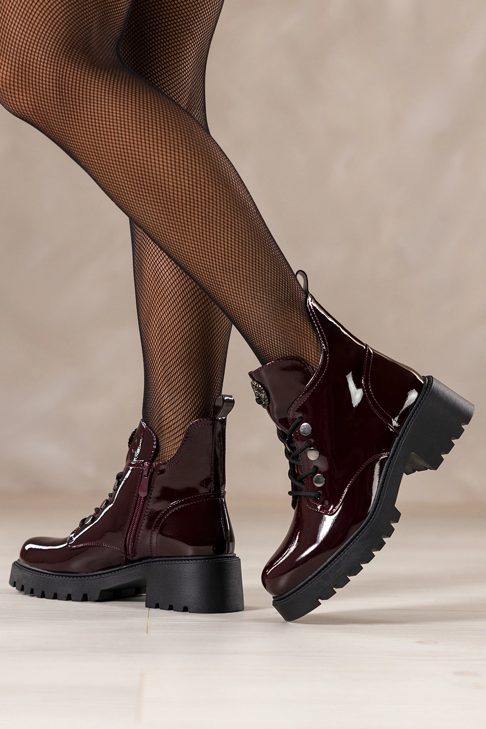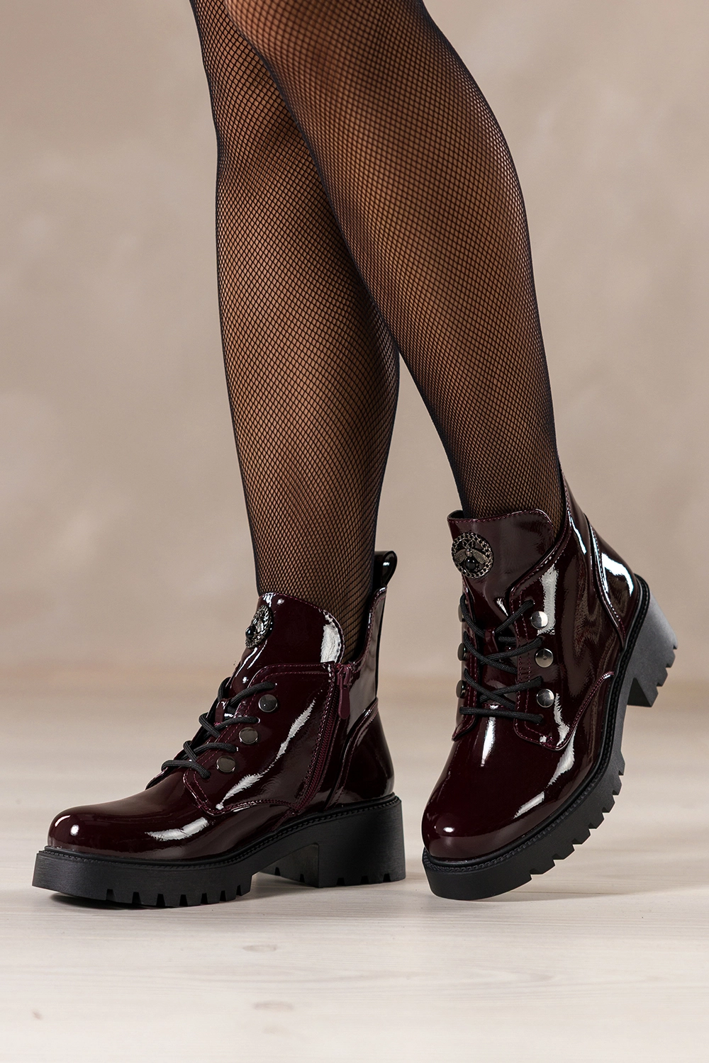 Bordowe botki damskie lakierowane na bieżnikowanej platformie ozdobny owad na języku sznurowane Casu NW2399-6