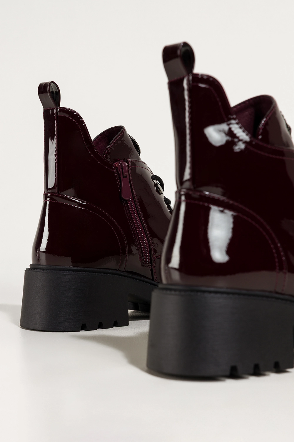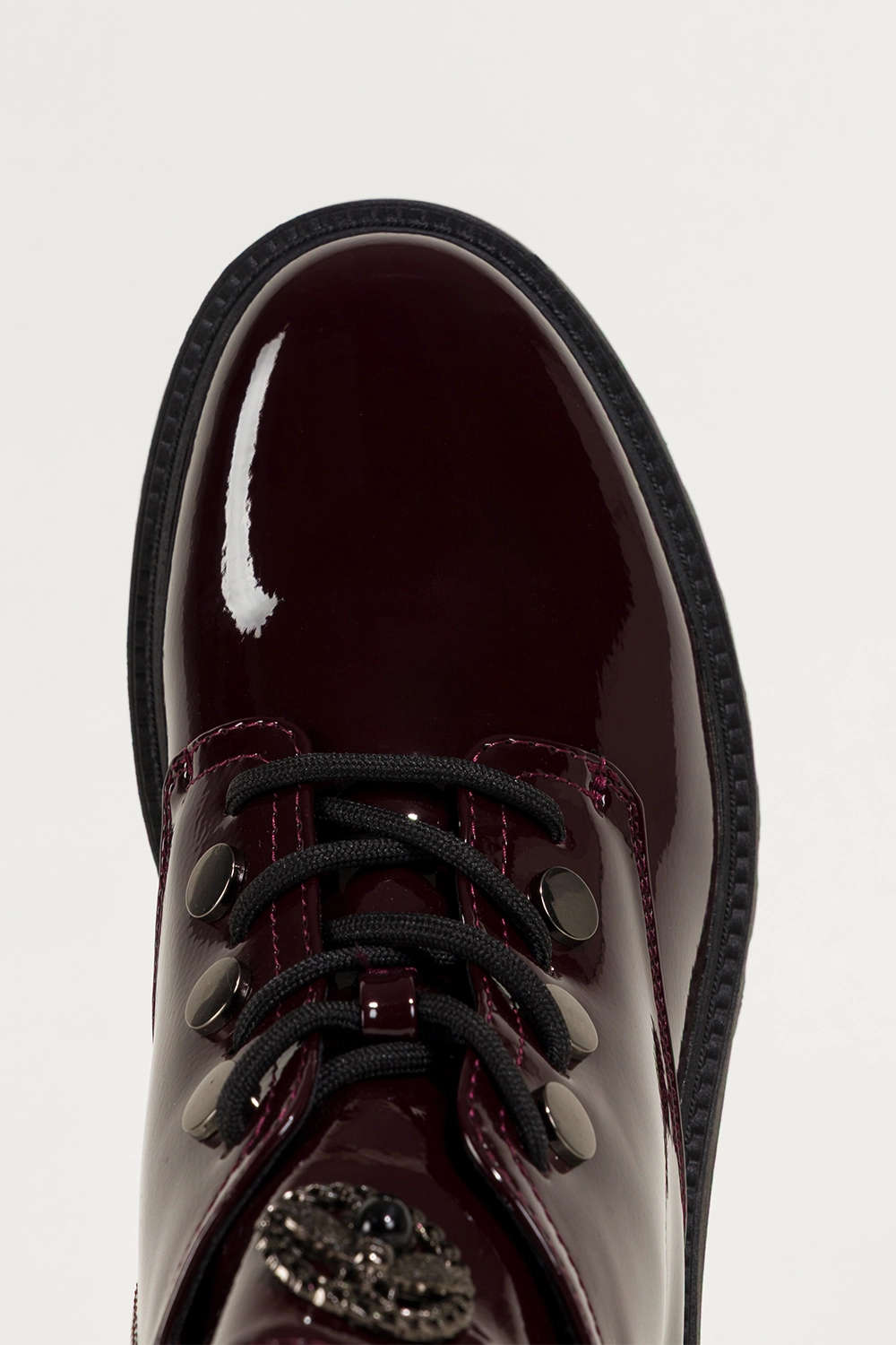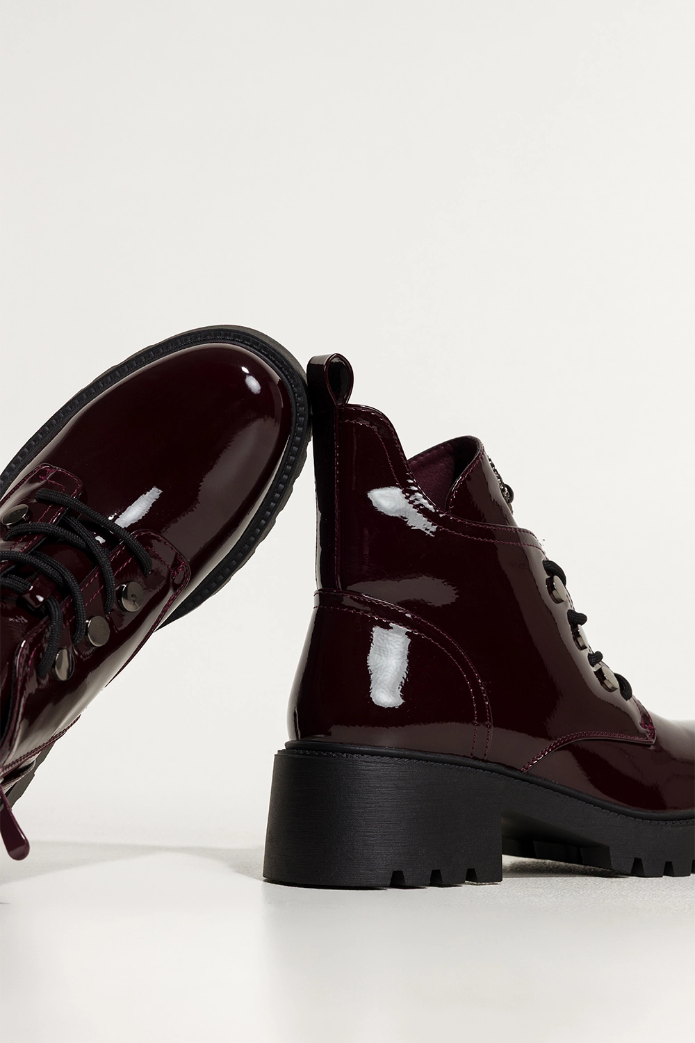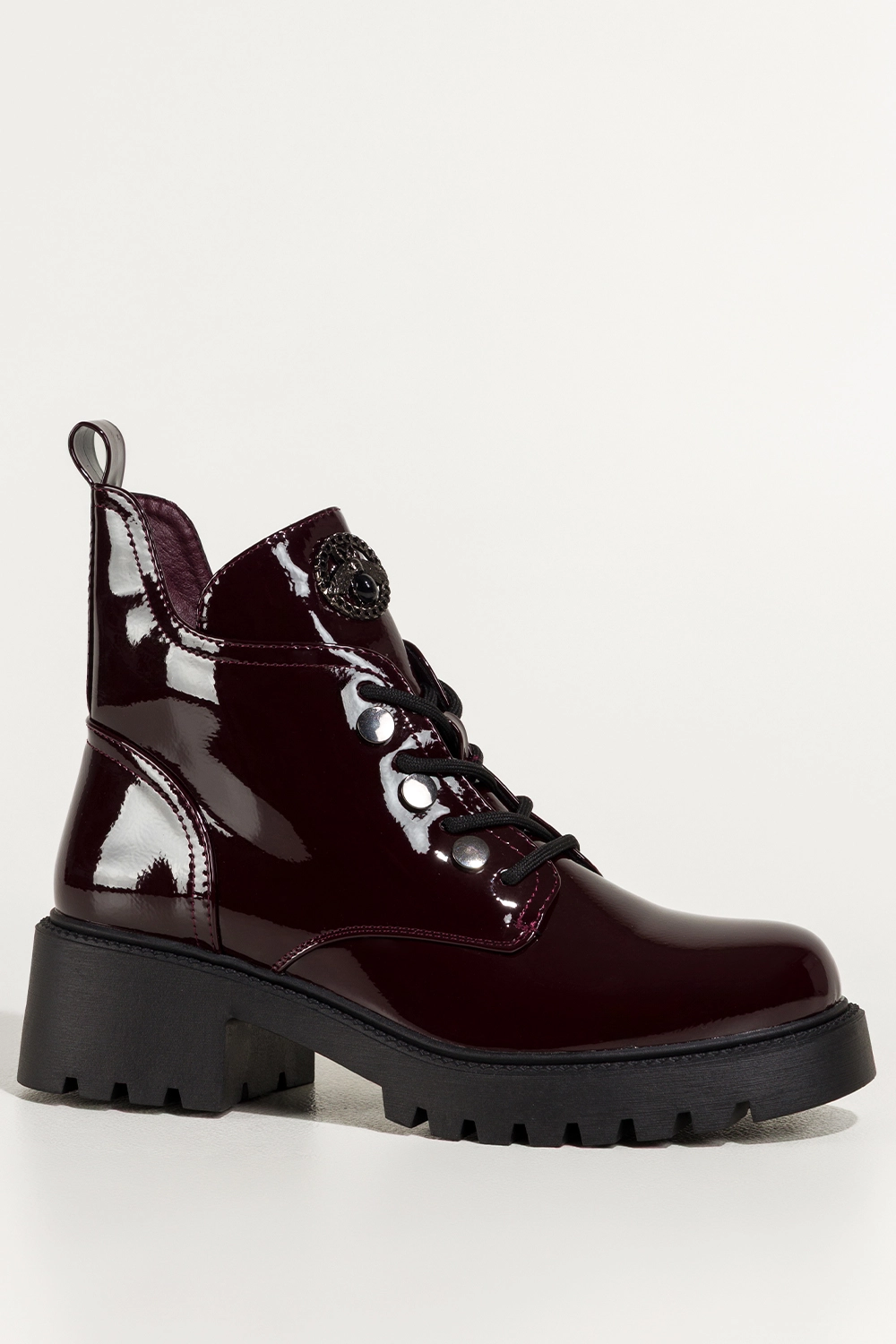 Bordowe botki damskie lakierowane na bieżnikowanej platformie ozdobny owad na języku sznurowane Casu NW2399-6