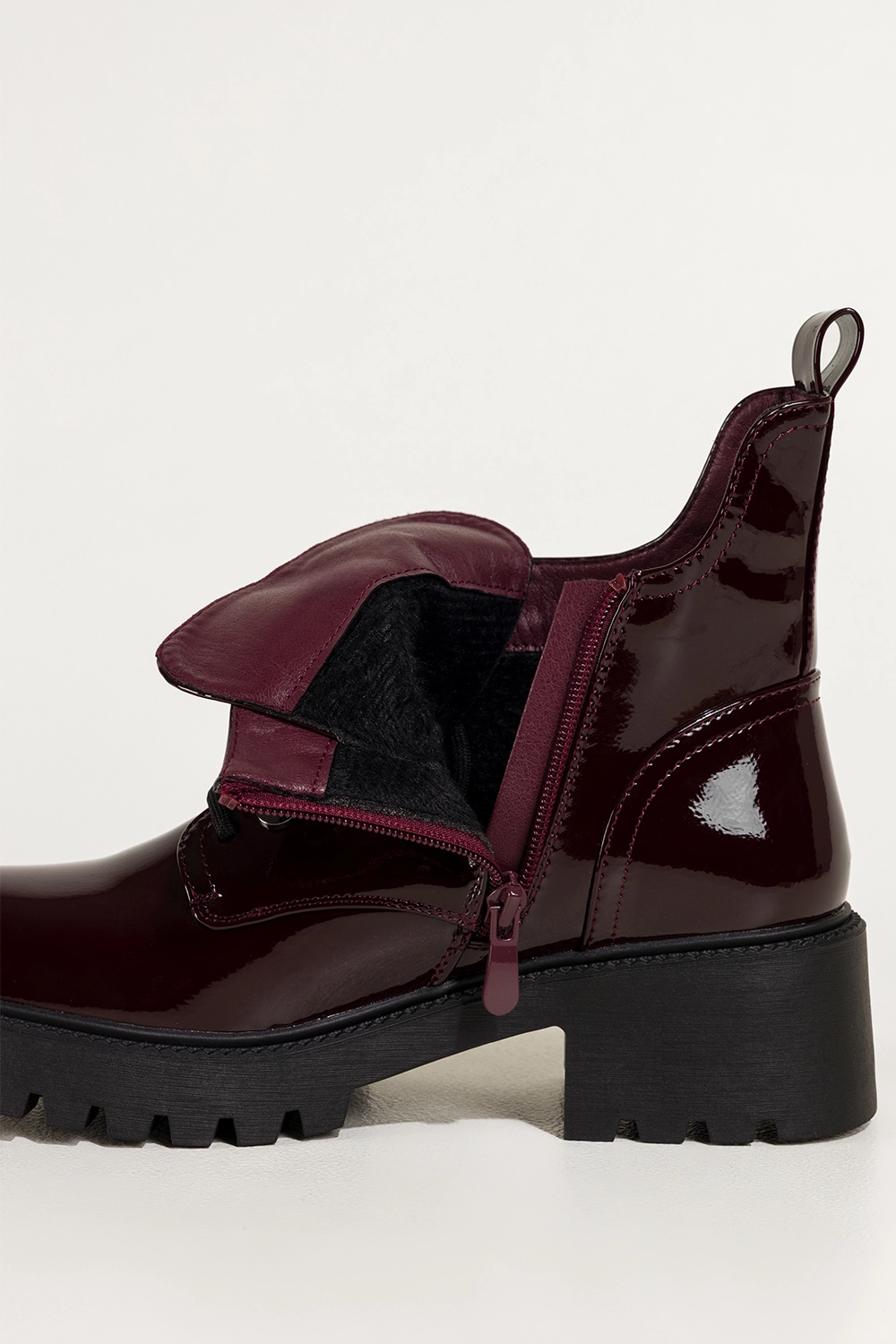 Bordowe botki damskie lakierowane na bieżnikowanej platformie ozdobny owad na języku sznurowane Casu model NW2399-6. Wykonane z wysokogatunkowej lakierowanej skóry ekologicznej, zachwycają głębokim połyskiem i odpornością na wilgoć. Wnętrze botków wyściełane jest miękkim futerkiem, które zapewnia przyjemne ciepło nawet w najchłodniejsze dni. Solidna konstrukcja i dbałość o detale gwarantują trwałość i wygodę przez.