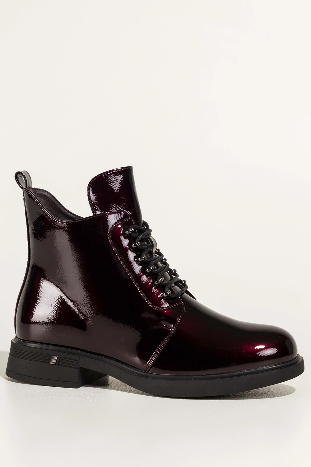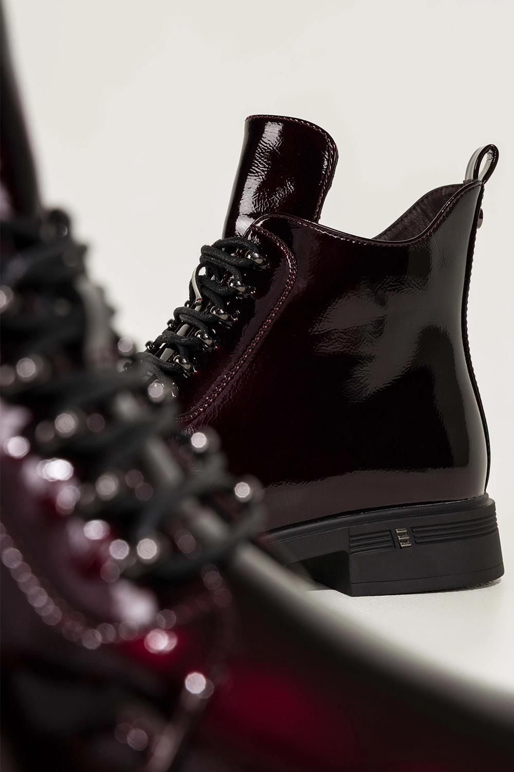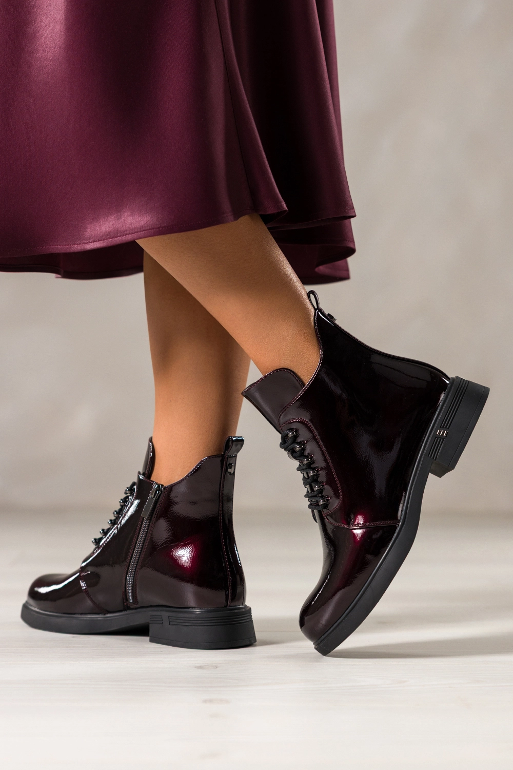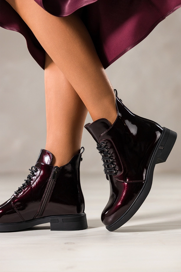 Bordowe botki damskie lakierowane na niskim klocku wycięta cholewka sznurowane Casu model CB338-7. Wykonane z wysokogatunkowej lakierowanej skóry ekologicznej, przyciągają wzrok głębokim, intensywnym kolorem i efektownym połyskiem. Ich wnętrze ocieplone jest miękkim kocem obuwniczym, który gwarantuje ciepło w chłodniejsze dni.