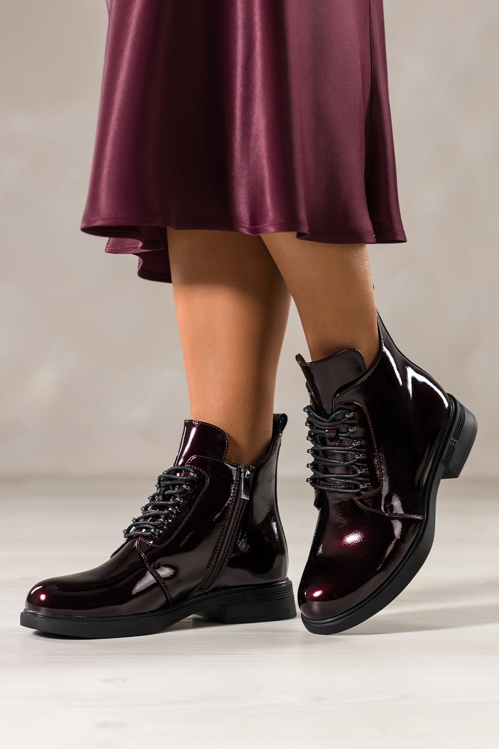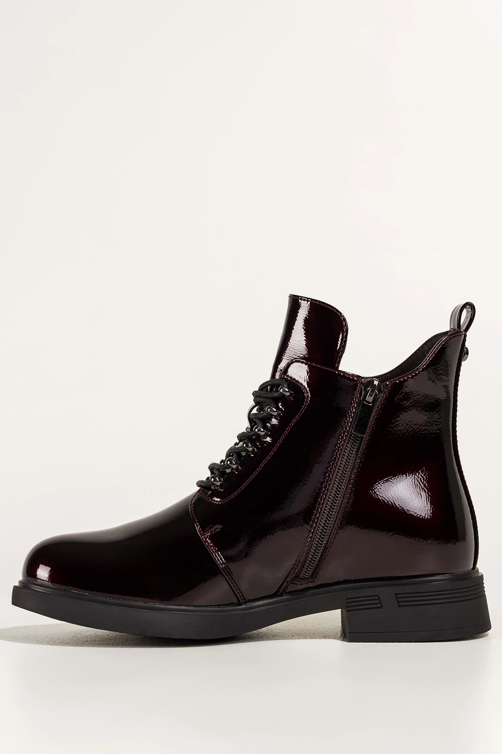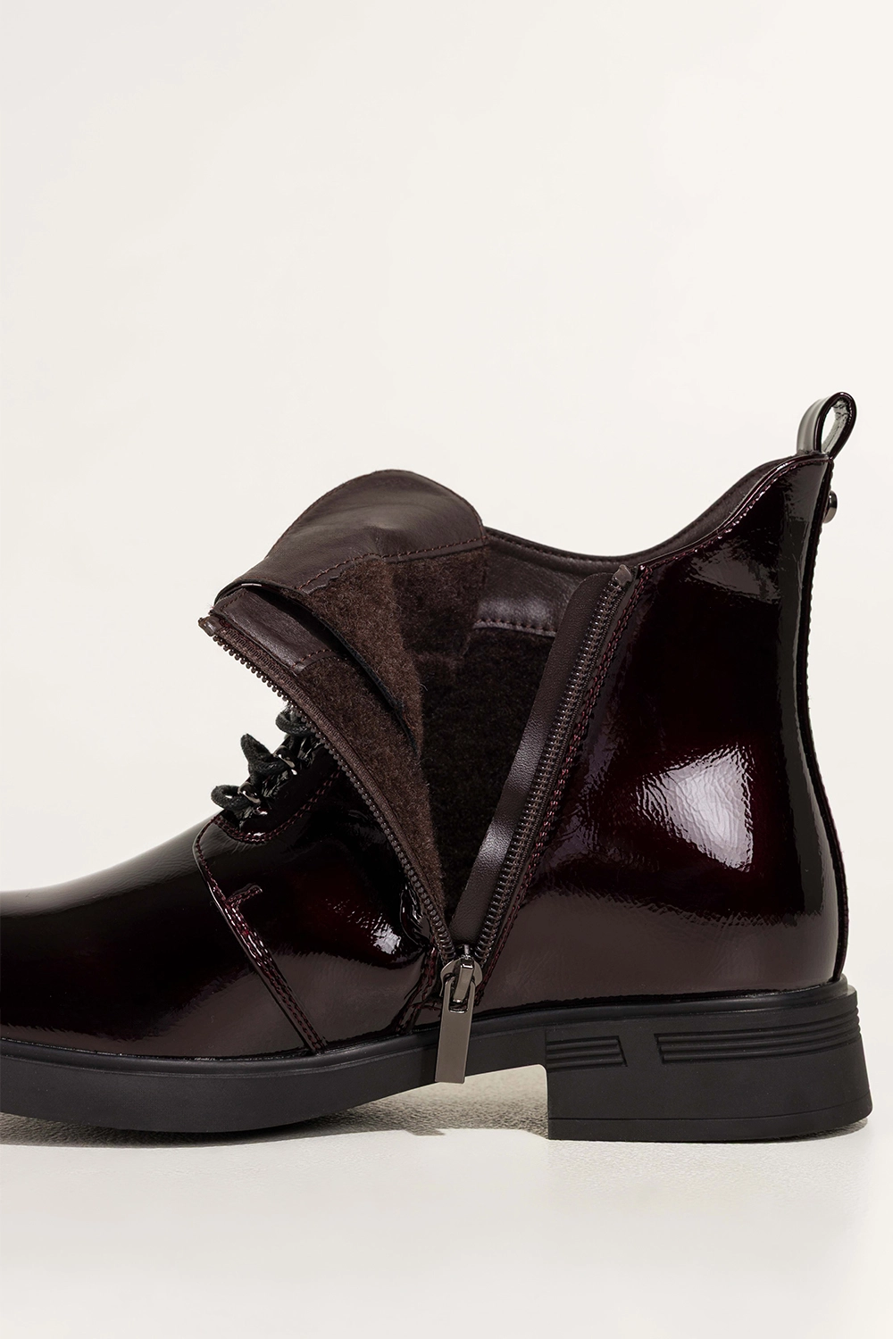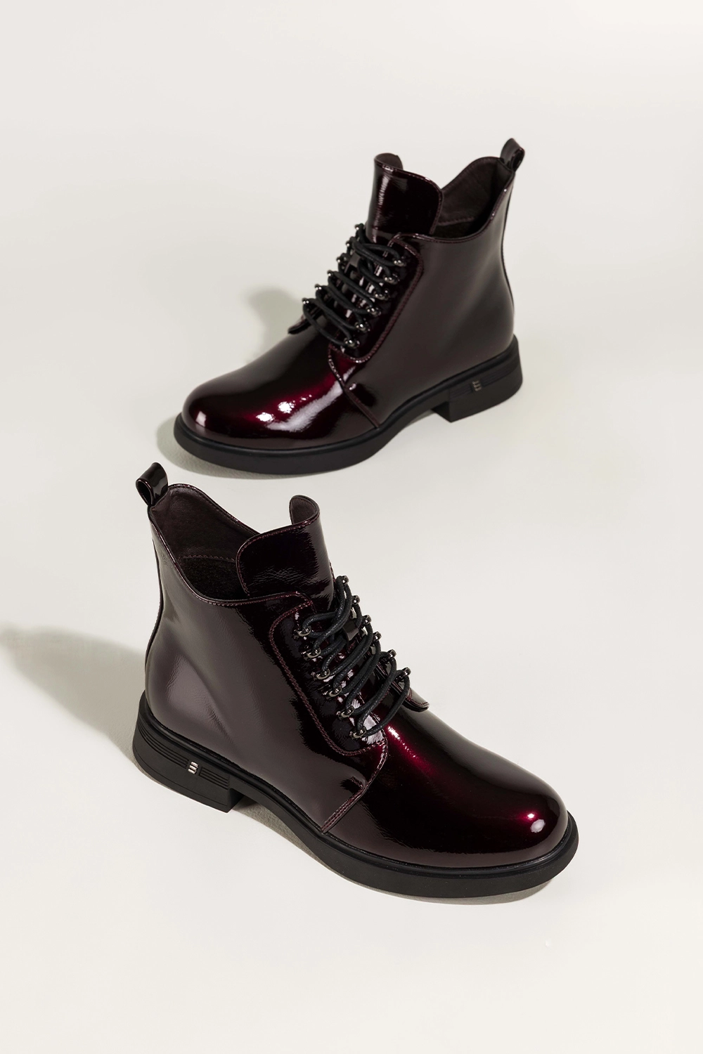 Bordowe botki damskie lakierowane na niskim klocku wycięta cholewka sznurowane Casu model CB338-7. Wykonane z wysokogatunkowej lakierowanej skóry ekologicznej, przyciągają wzrok głębokim, intensywnym kolorem i efektownym połyskiem. Ich wnętrze ocieplone jest miękkim kocem obuwniczym, który gwarantuje ciepło w chłodniejsze dni.