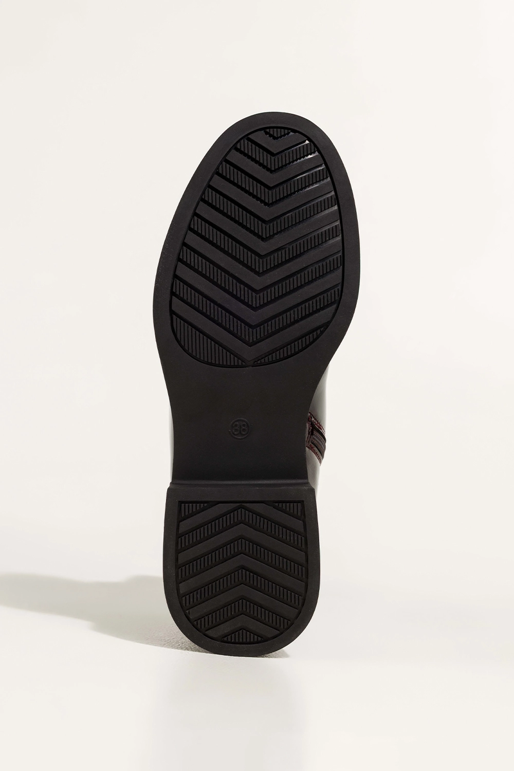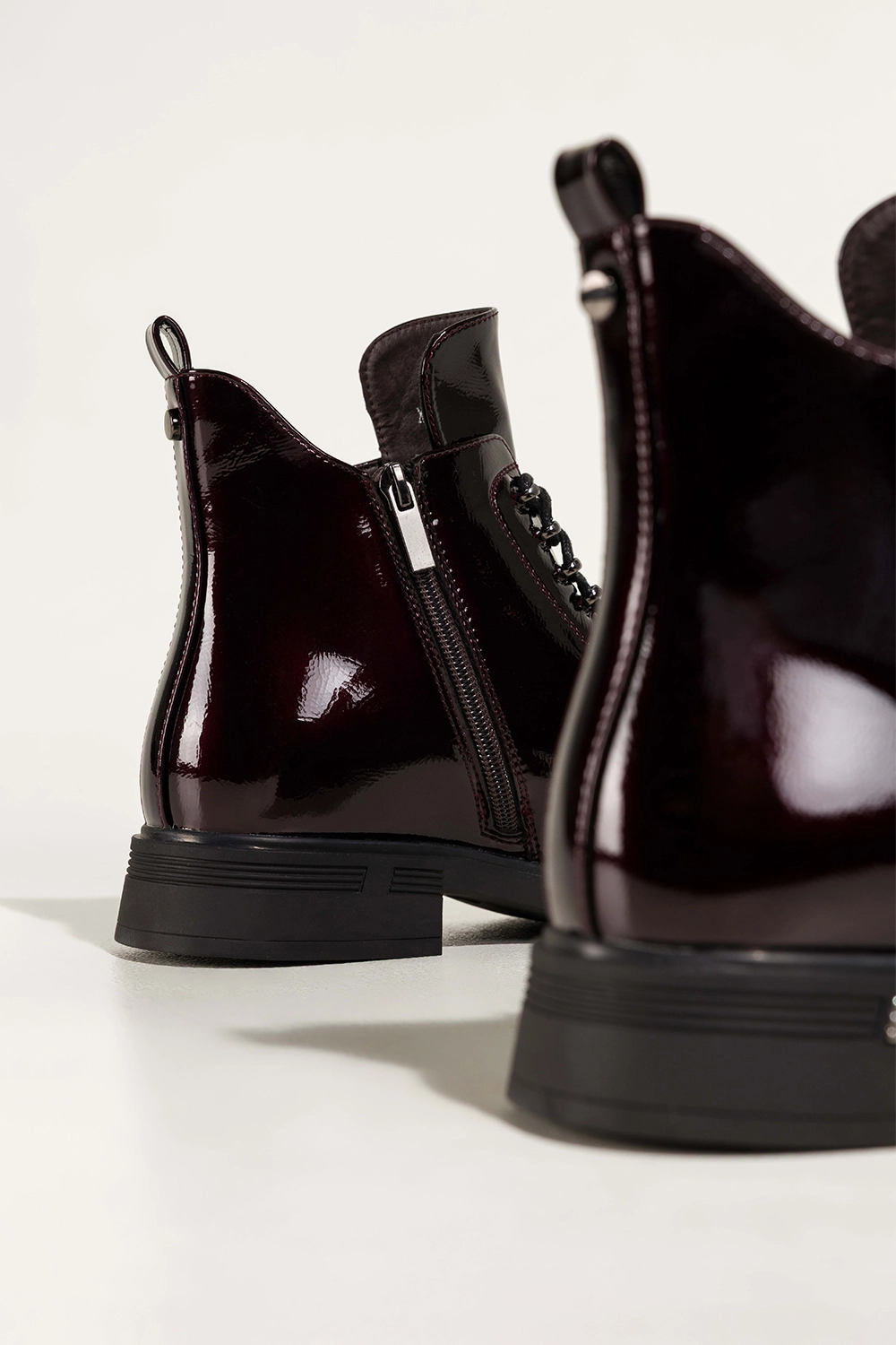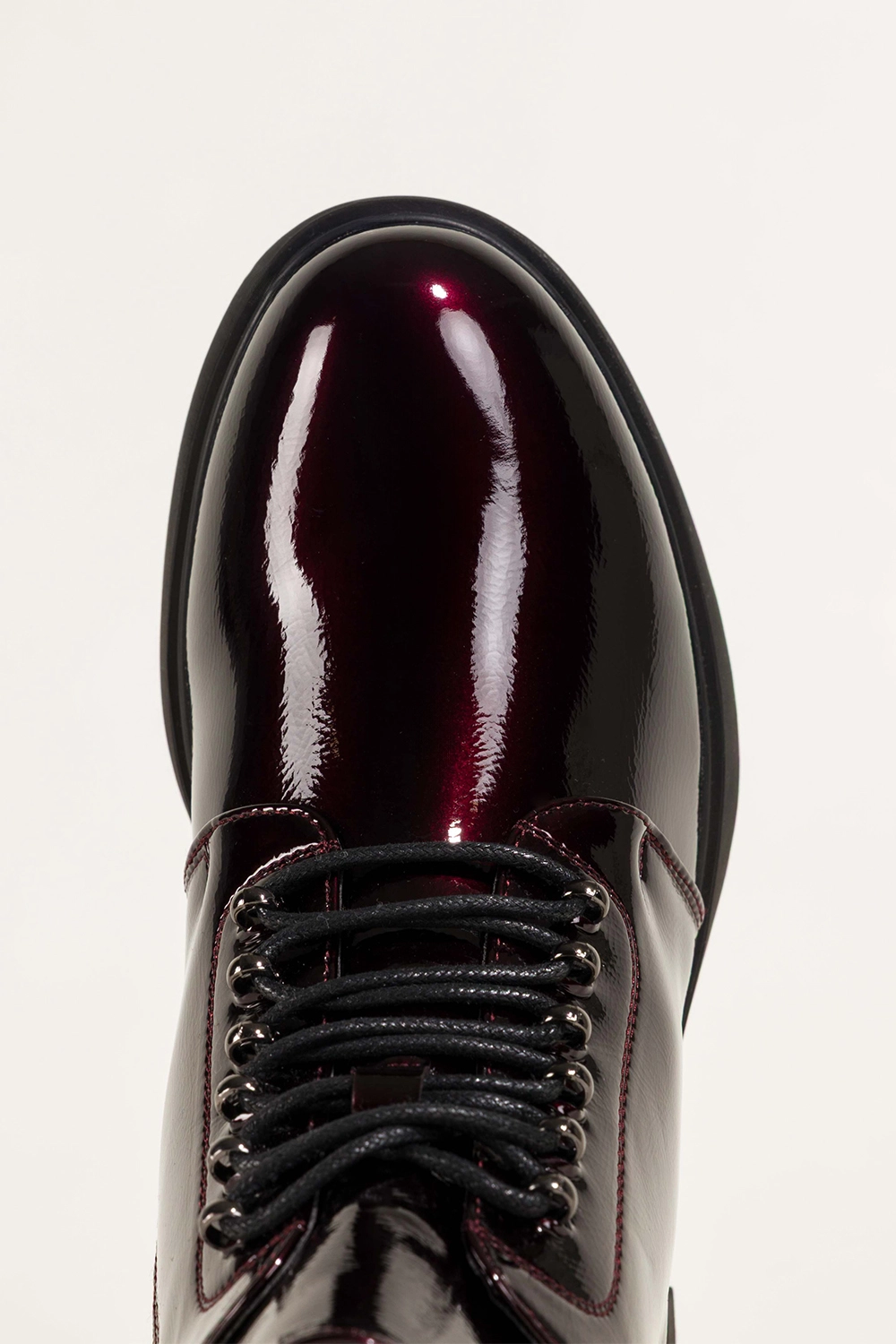Bordowe botki damskie lakierowane na niskim klocku wycięta cholewka sznurowane Casu model CB338-7. Wykonane z wysokogatunkowej lakierowanej skóry ekologicznej, przyciągają wzrok głębokim, intensywnym kolorem i efektownym połyskiem. Ich wnętrze ocieplone jest miękkim kocem obuwniczym, który gwarantuje ciepło w chłodniejsze dni.