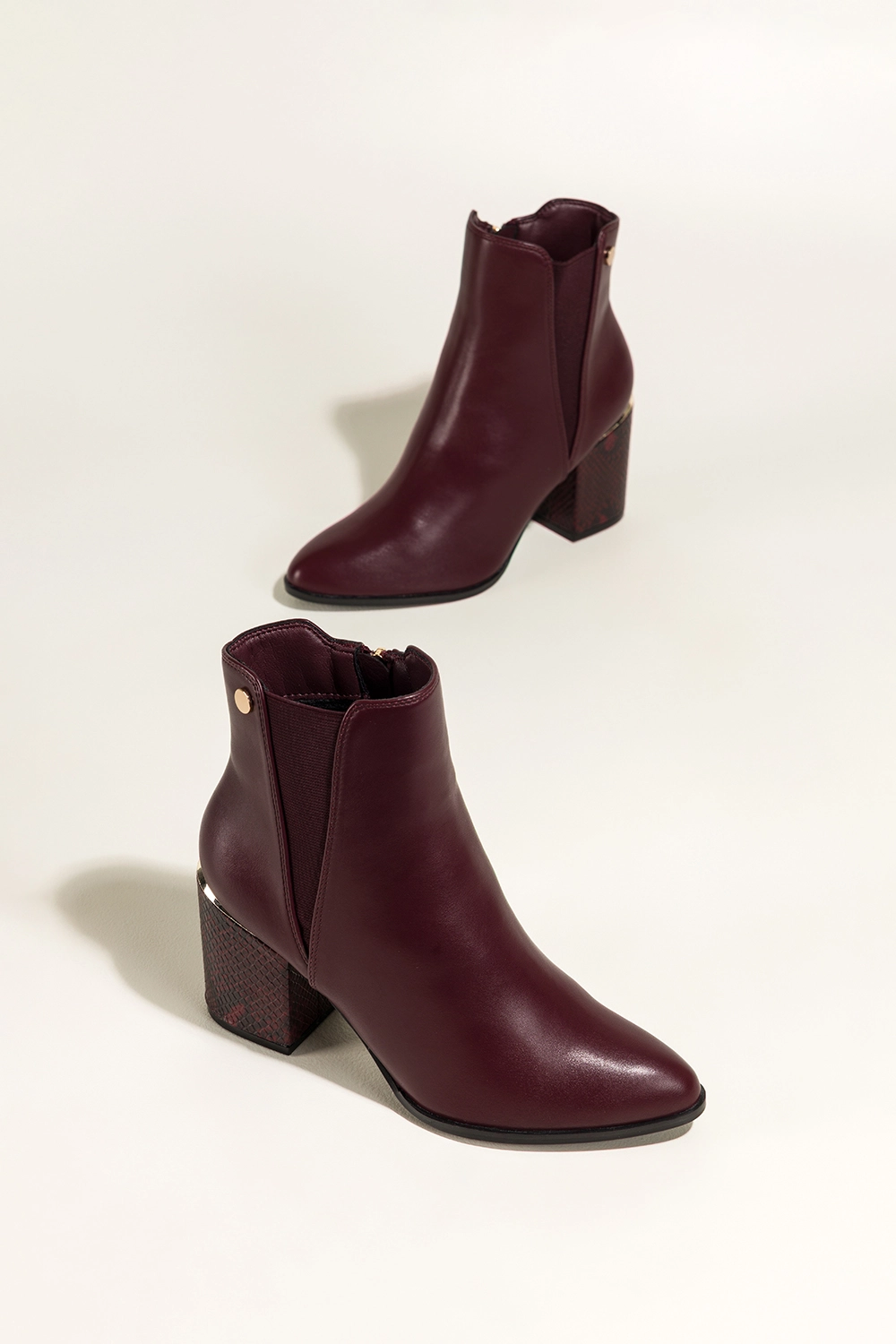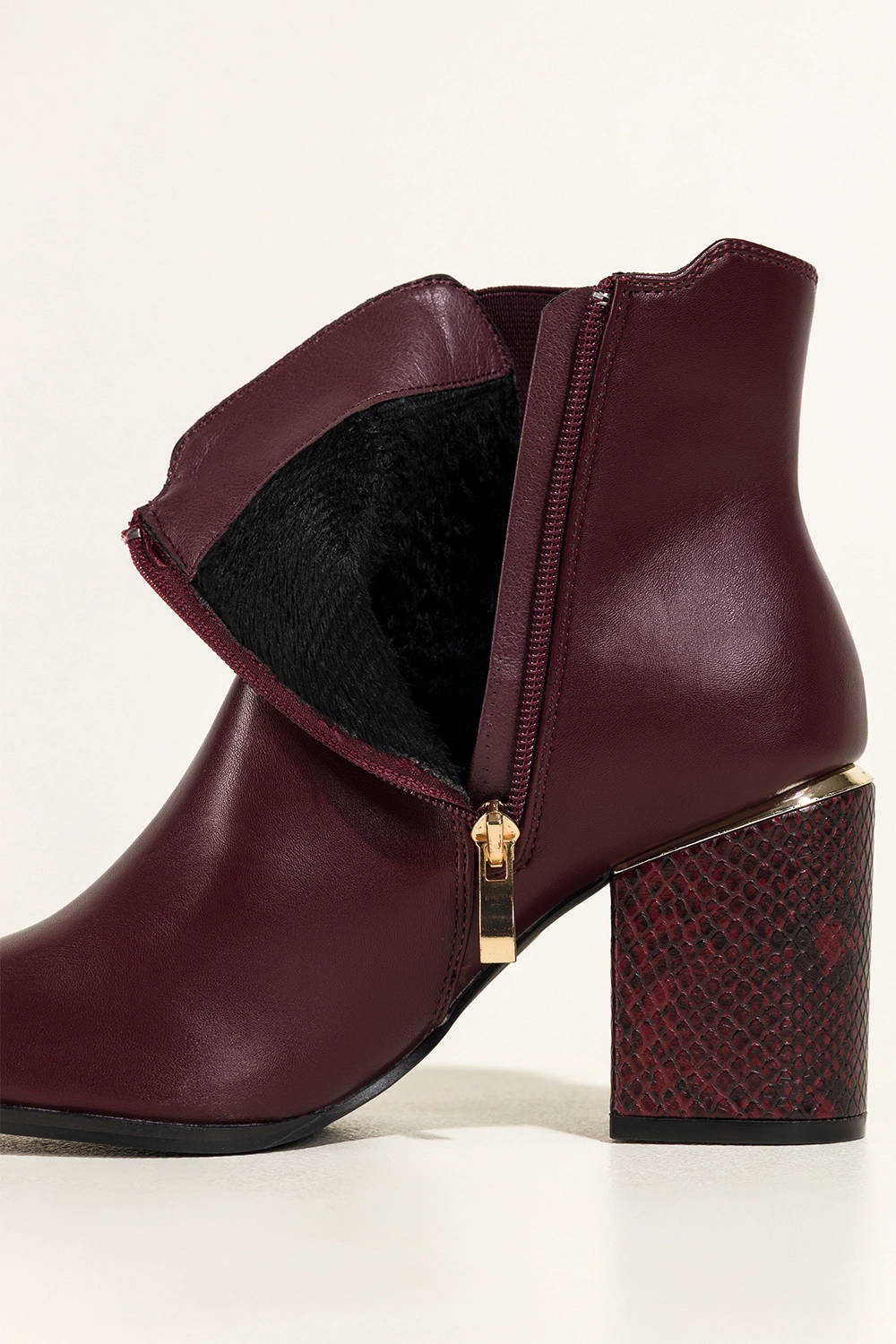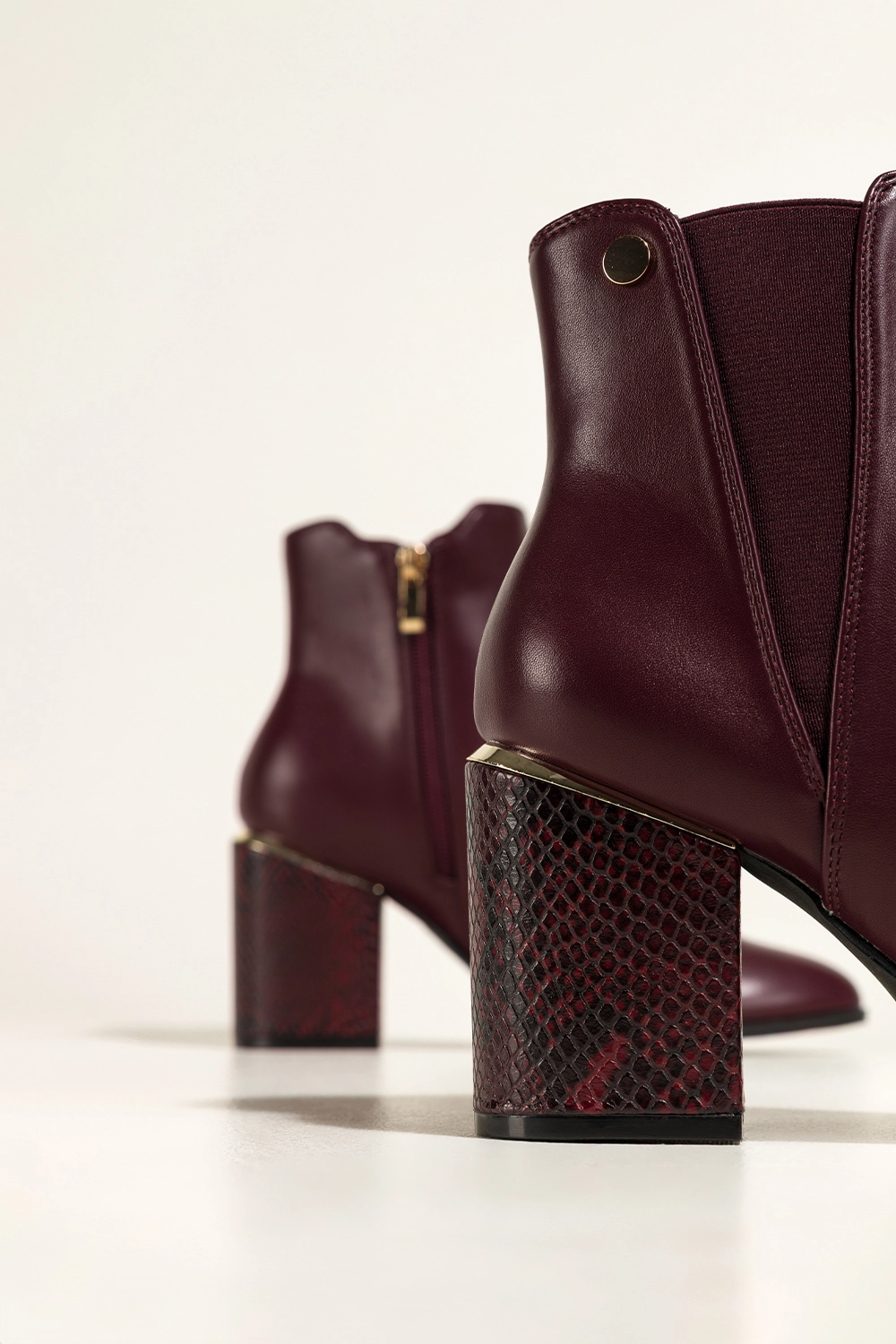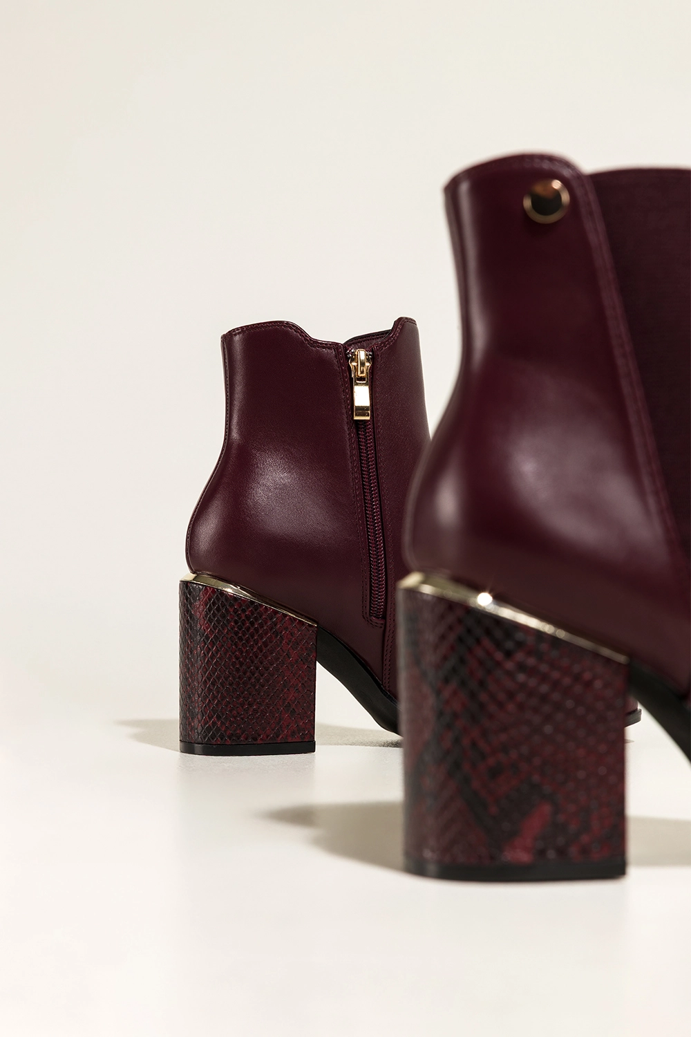 Złote detale oraz szeroki obcas typu słupek pokryty ekologiczną skórą z wężowym wzorem to elementy, które nadają tym botkom niepowtarzalny charakter. Elegancka, głęboka bordowa barwa doskonale komponuje się z klasycznymi i nowoczesnymi stylizacjami. Botki świetnie prezentują się zarówno z dopasowanymi spodniami, jak i sukienkami midi, tworząc efektowne zestawienia na wieczór i na co dzień . Zamek błyskawiczny ułatwia szybkie zakładanie, a dekoracyjne złote kółeczko dodaje subtelnego luksusu.