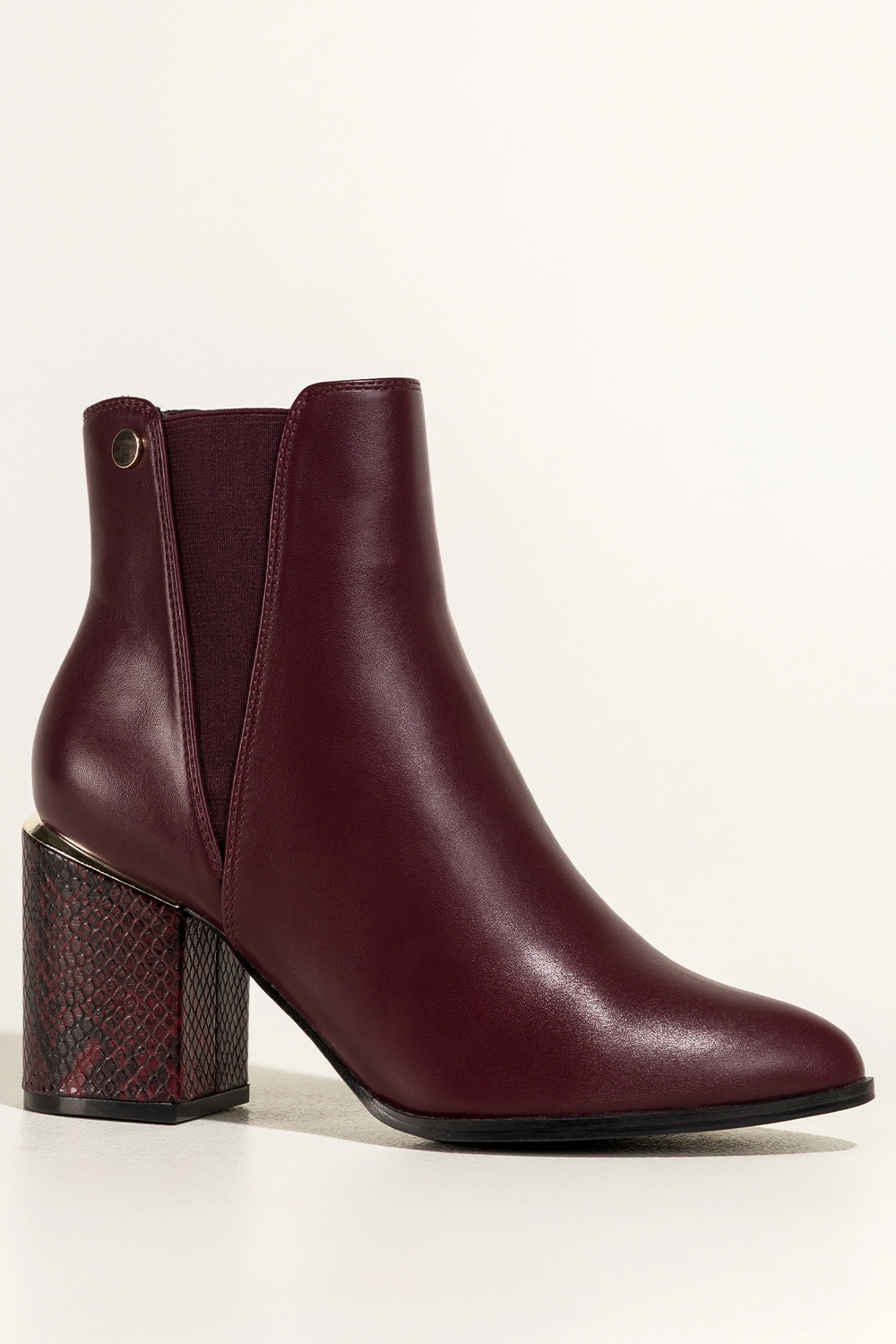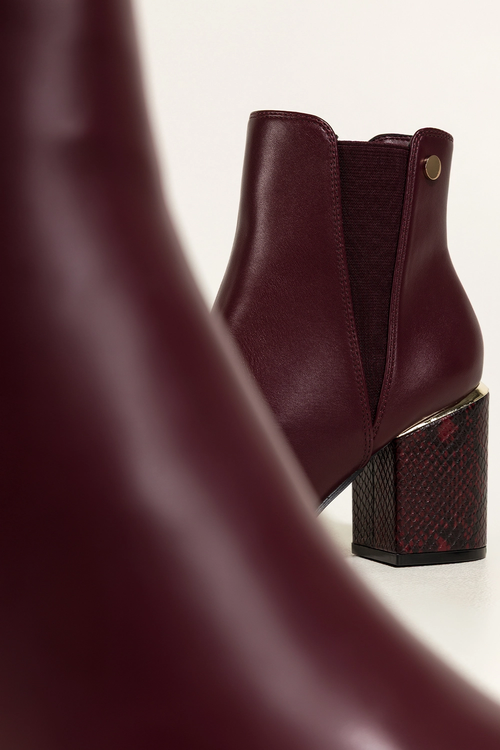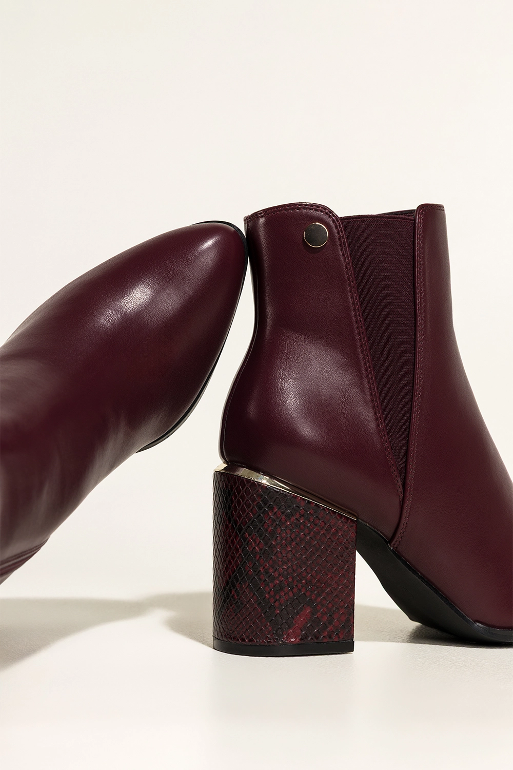 Złote detale oraz szeroki obcas typu słupek pokryty ekologiczną skórą z wężowym wzorem to elementy, które nadają tym botkom niepowtarzalny charakter. Elegancka, głęboka bordowa barwa doskonale komponuje się z klasycznymi i nowoczesnymi stylizacjami. Botki świetnie prezentują się zarówno z dopasowanymi spodniami, jak i sukienkami midi, tworząc efektowne zestawienia na wieczór i na co dzień . Zamek błyskawiczny ułatwia szybkie zakładanie, a dekoracyjne złote kółeczko dodaje subtelnego luksusu.