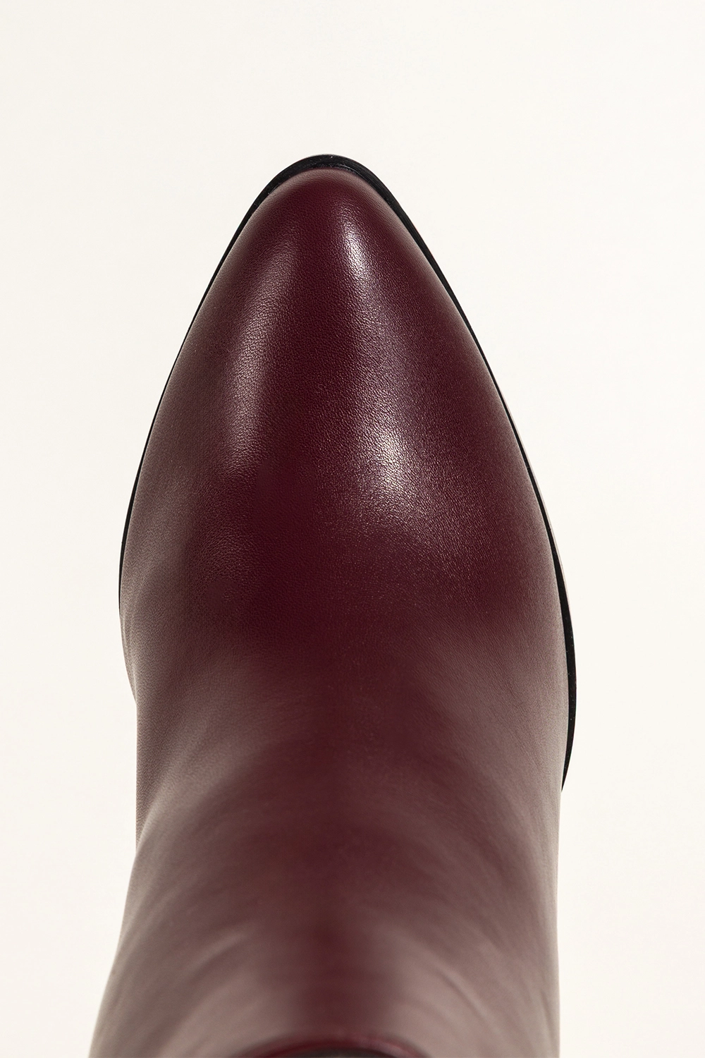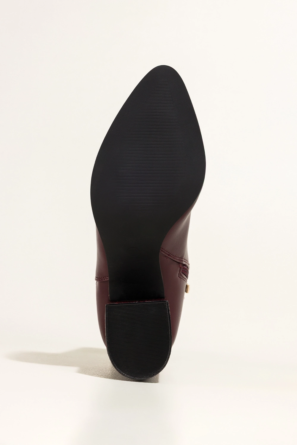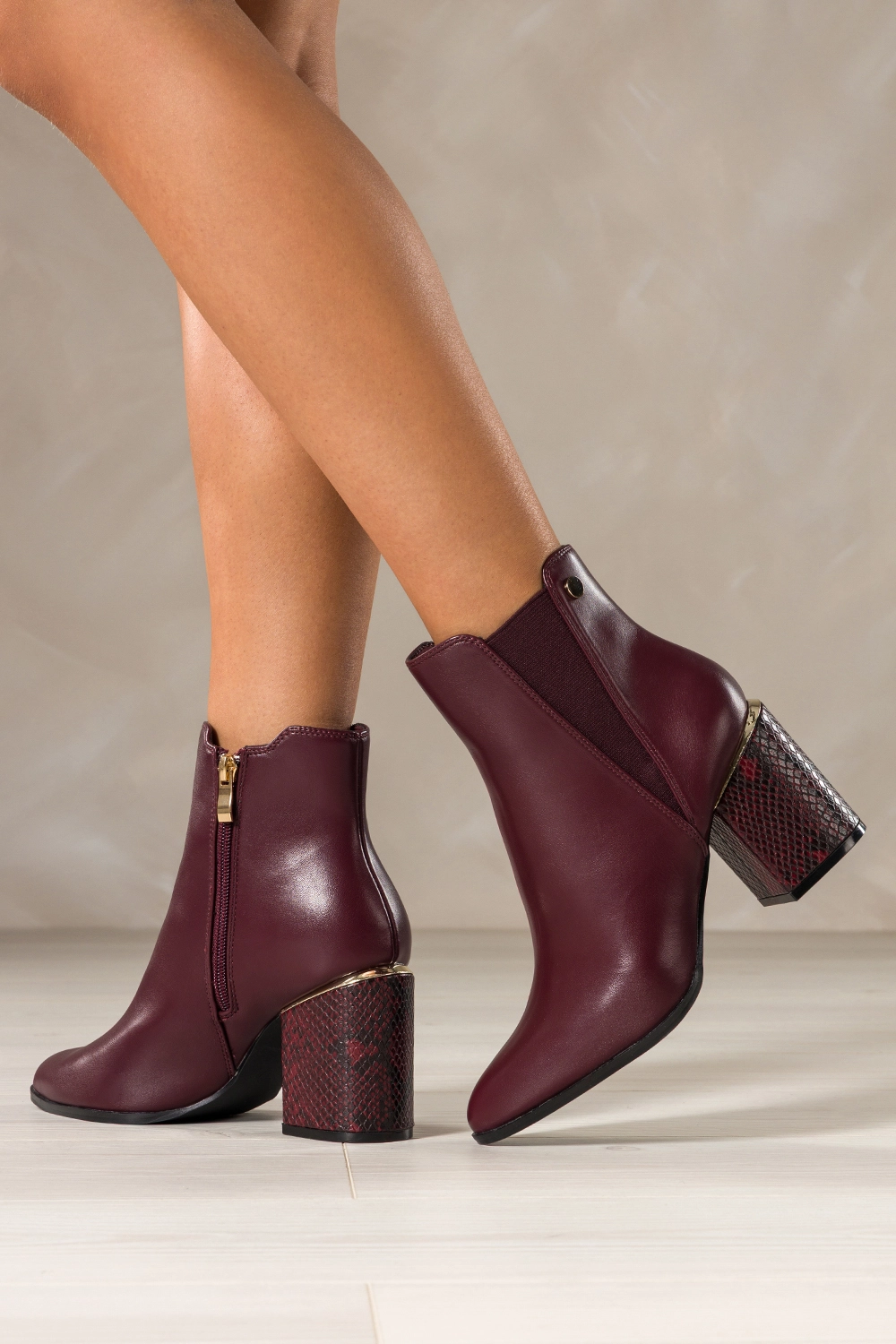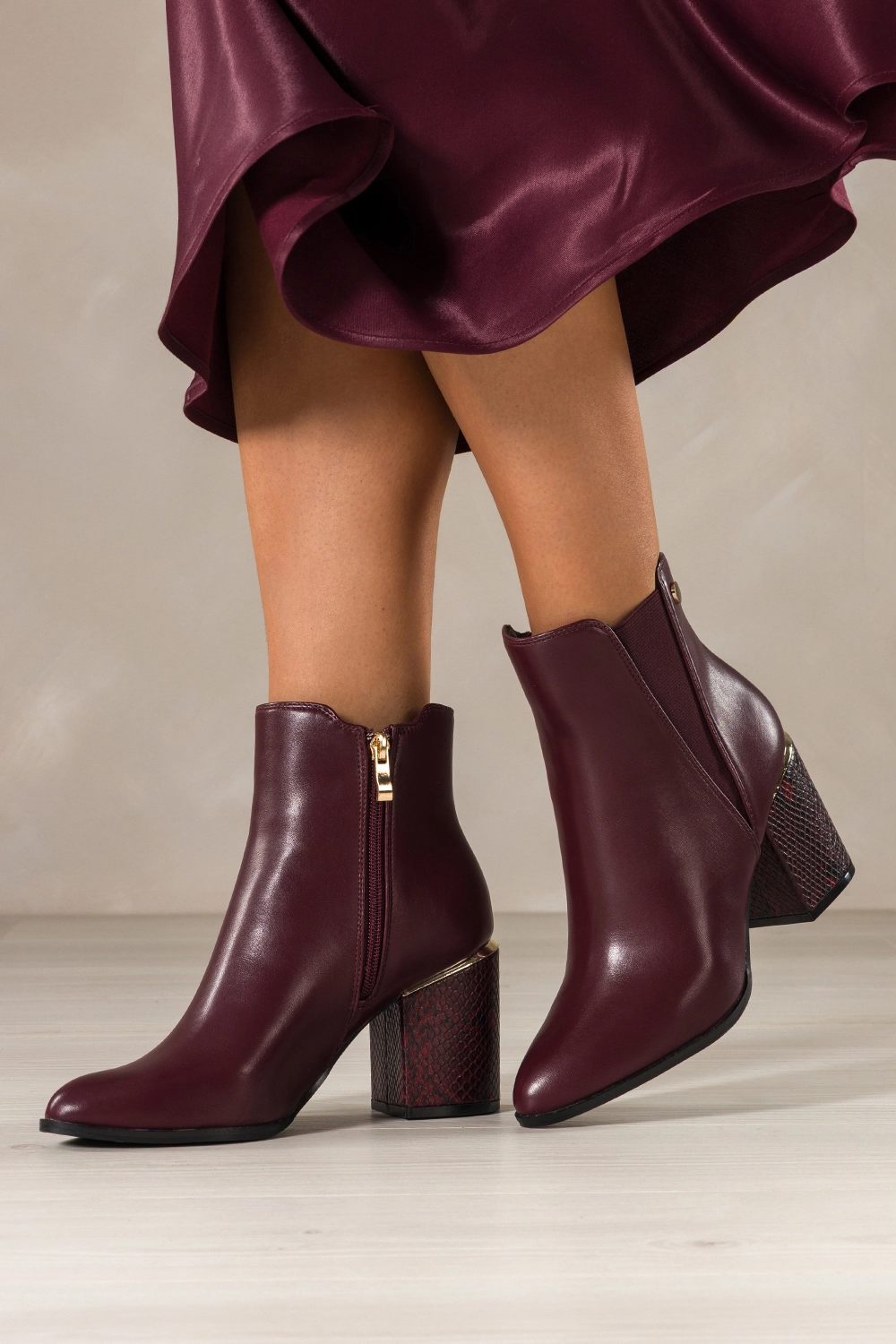 Złote detale oraz szeroki obcas typu słupek pokryty ekologiczną skórą z wężowym wzorem to elementy, które nadają tym botkom niepowtarzalny charakter. Elegancka, głęboka bordowa barwa doskonale komponuje się z klasycznymi i nowoczesnymi stylizacjami. Botki świetnie prezentują się zarówno z dopasowanymi spodniami, jak i sukienkami midi, tworząc efektowne zestawienia na wieczór i na co dzień . Zamek błyskawiczny ułatwia szybkie zakładanie, a dekoracyjne złote kółeczko dodaje subtelnego luksusu.