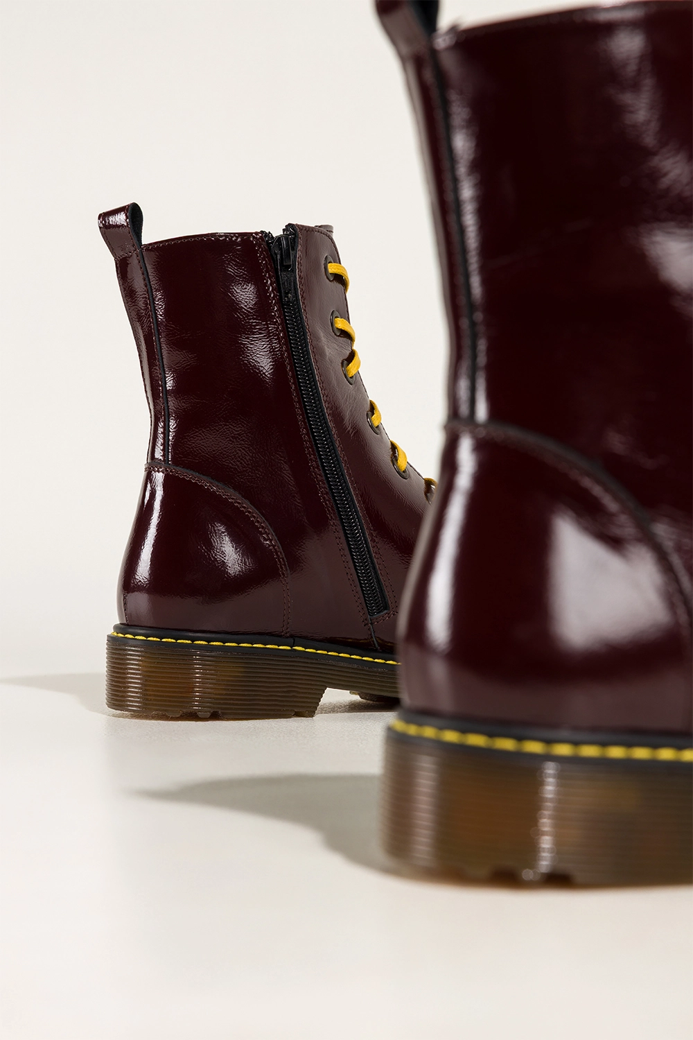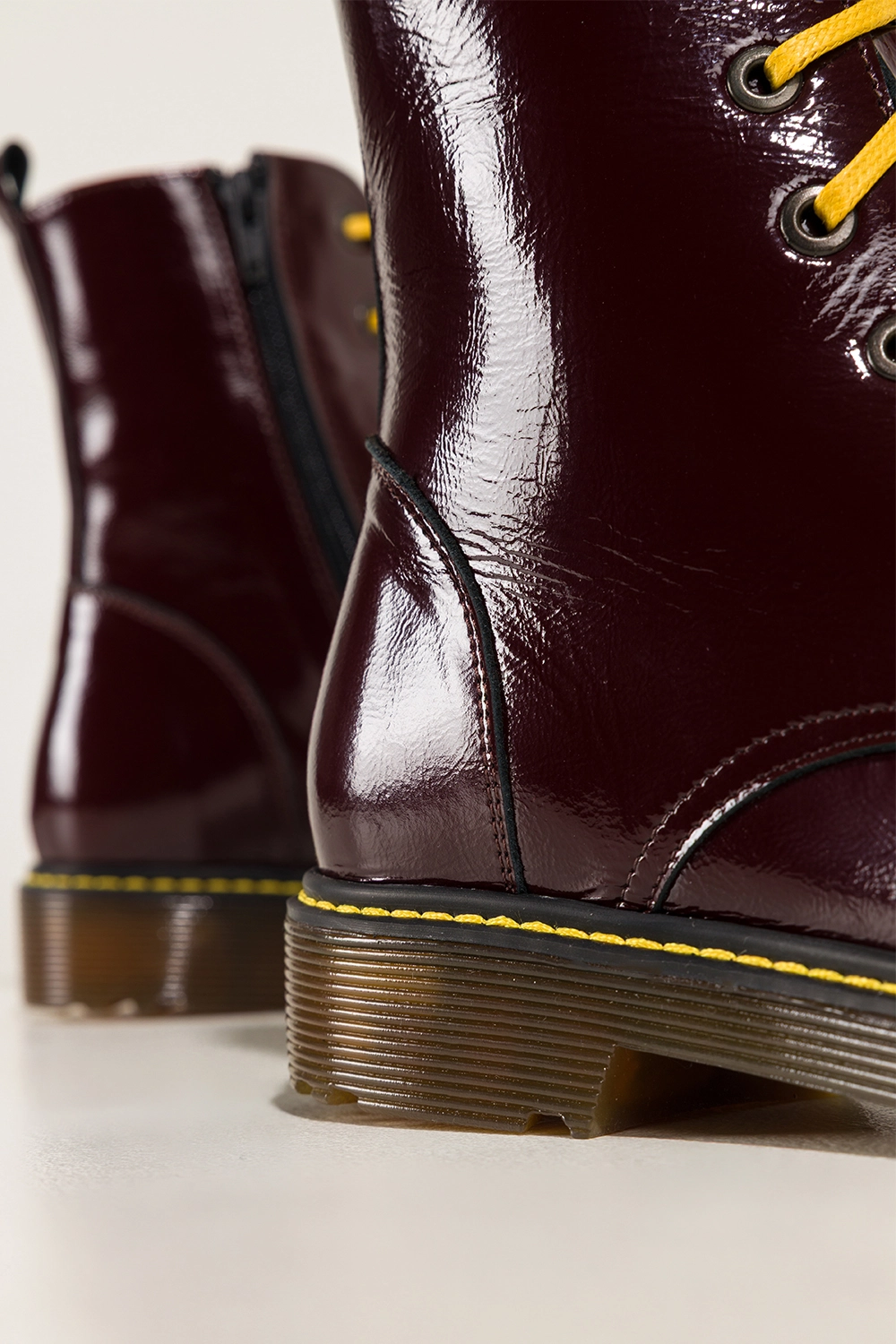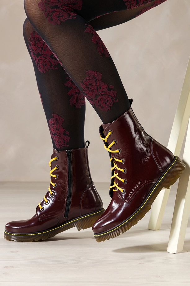 Bordowe botki skórzane damskie lakierowane glany na bieżnikowanej podeszwie z przeszyciami sznurowane PRODUKT POLSKI Casu model 7293-ELTZ, połączenie solidnego rzemiosła z nowoczesnym designem. Wykonane z wysokogatunkowej, lakierowanej skóry naturalnej gwarantują trwałość, odporność na uszkodzenia i niezwykły połysk, który przyciąga wzrok. Ich wnętrze wyściełane miękką, skórzaną wkładką zapewnia komfort noszenia przez cały dzień, a zaokrąglony nosek dodaje im subtelnego, kobiecego charakteru.