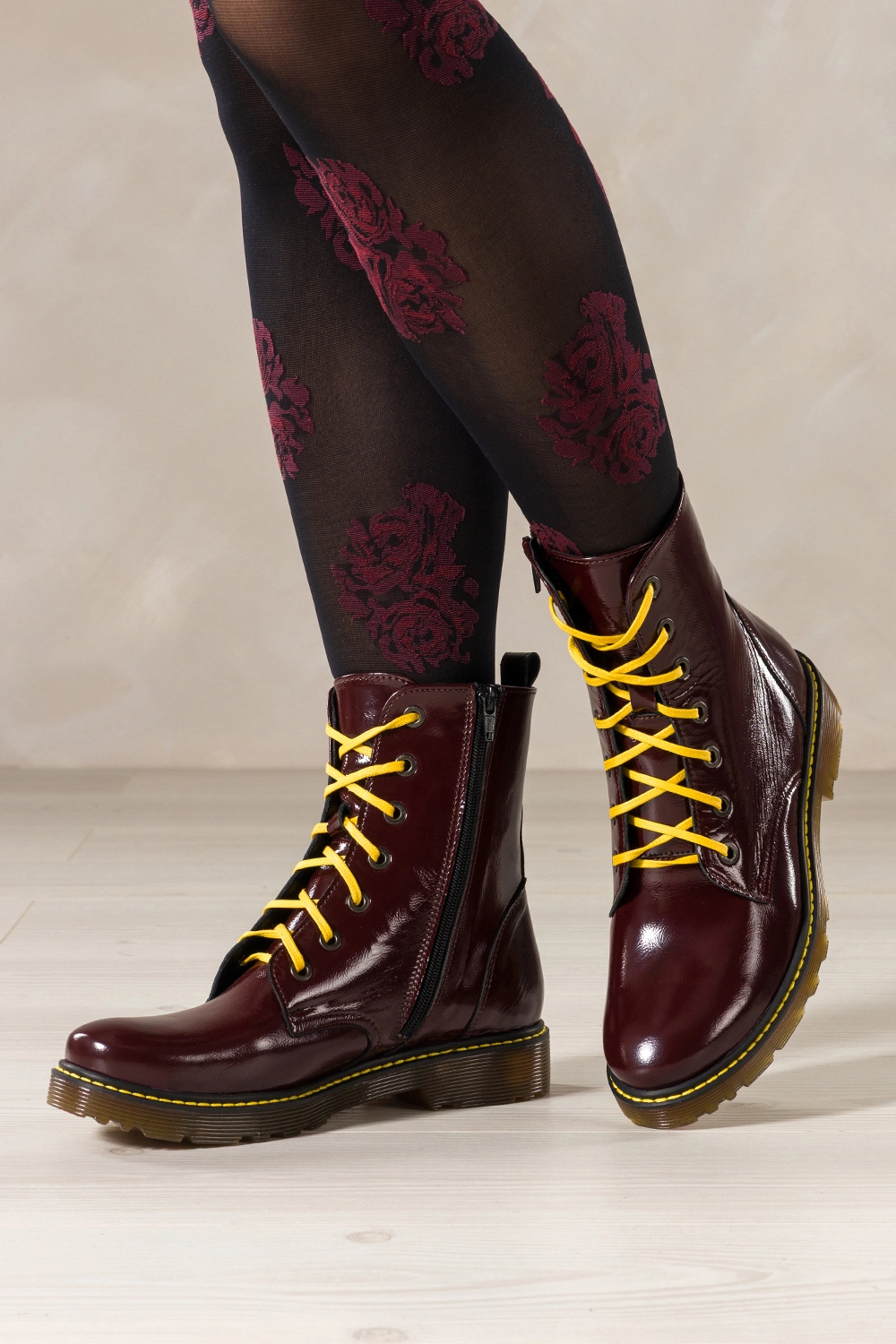 To idealny wybór dla kobiet, które chcą wyrazić swoją osobowość i wyróżnić się z tłumu. Głęboki, bordowy kolor pięknie komponuje się zarówno z codziennymi jeansami, jak i bardziej eleganckimi stylizacjami. Żółte sznurówki w połączeniu z ozdobnym przeszyciem na bieżnikowanej podeszwie nadają obuwiu niepowtarzalnego charakteru i streetwearowego pazura. Zamek błyskawiczny z boku ułatwia szybkie zakładanie, łącząc funkcjonalność z estetyką.