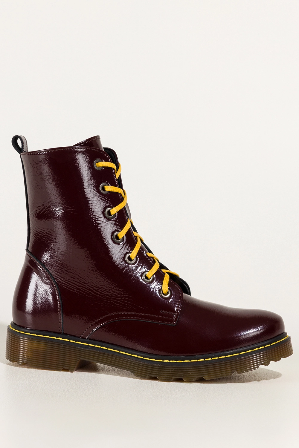 Bordowe botki skórzane damskie lakierowane glany na bieżnikowanej podeszwie z przeszyciami sznurowane PRODUKT POLSKI Casu 7293-ELTZ