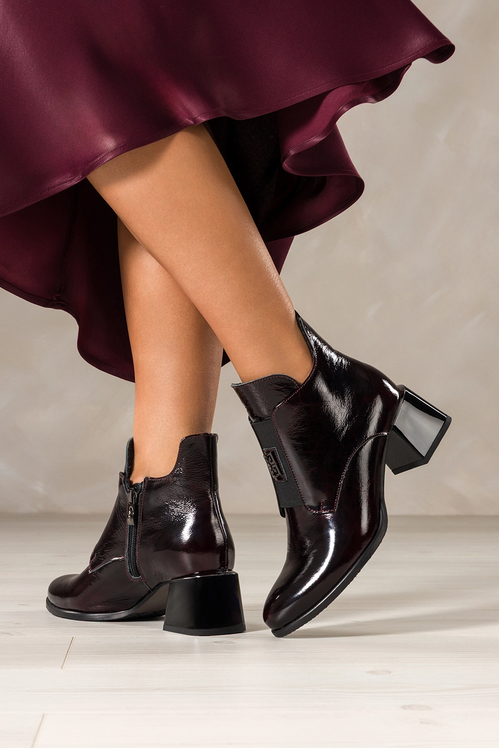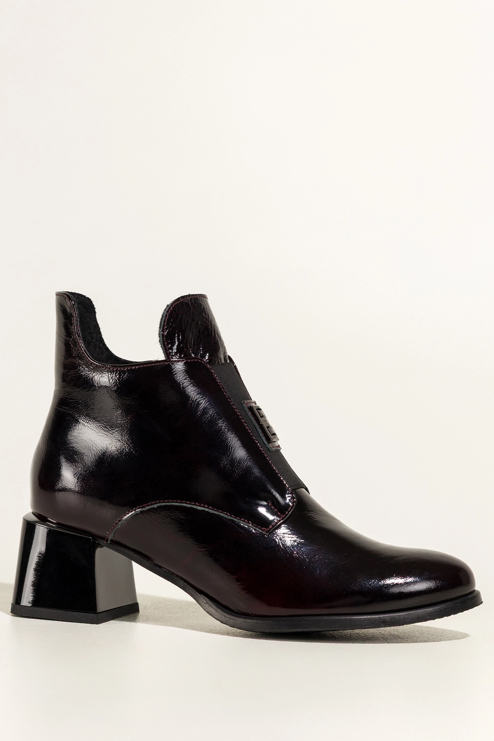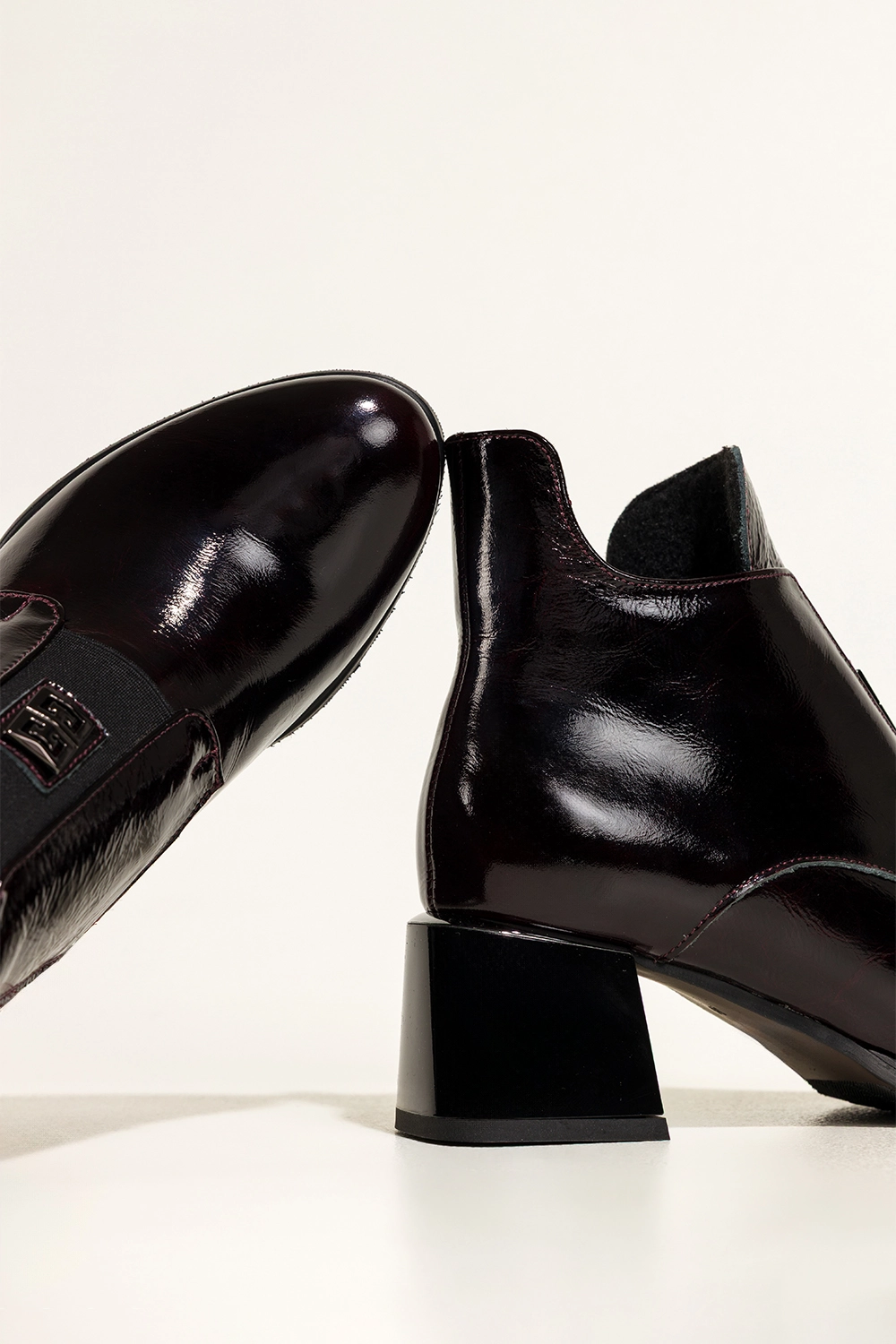 To idealny fason na wiele okazji, od codziennych spacerów, przez spotkania biznesowe, aż po wieczorne wyjścia. Bordowy kolor w lakierowanym wykończeniu przyciąga wzrok i dodaje wyrafinowanego charakteru każdej stylizacji. Obcas typu klocek z elegancką srebrną ozdobą zapewnia stabilność i komfort noszenia, a jednocześnie wyróżnia botki na tle klasycznych modeli. Wycięta cholewka oraz czarna elastyczna guma z efektowną stalową aplikacją nadają całości nowoczesnego, dynamicznego wyrazu.