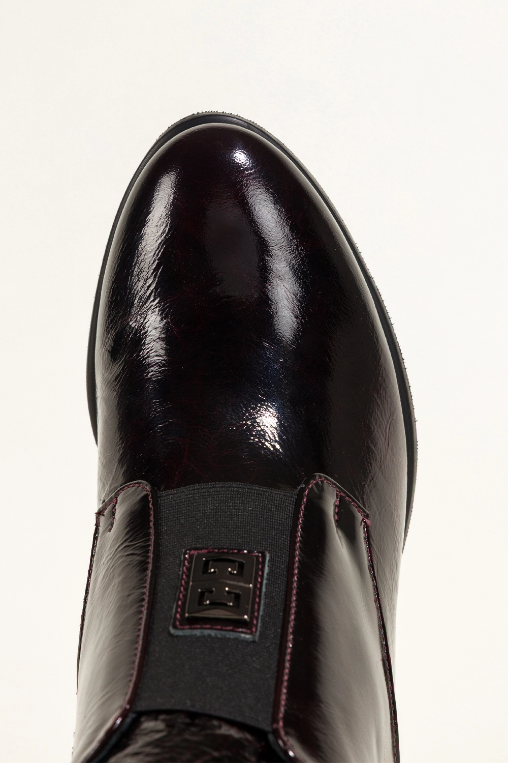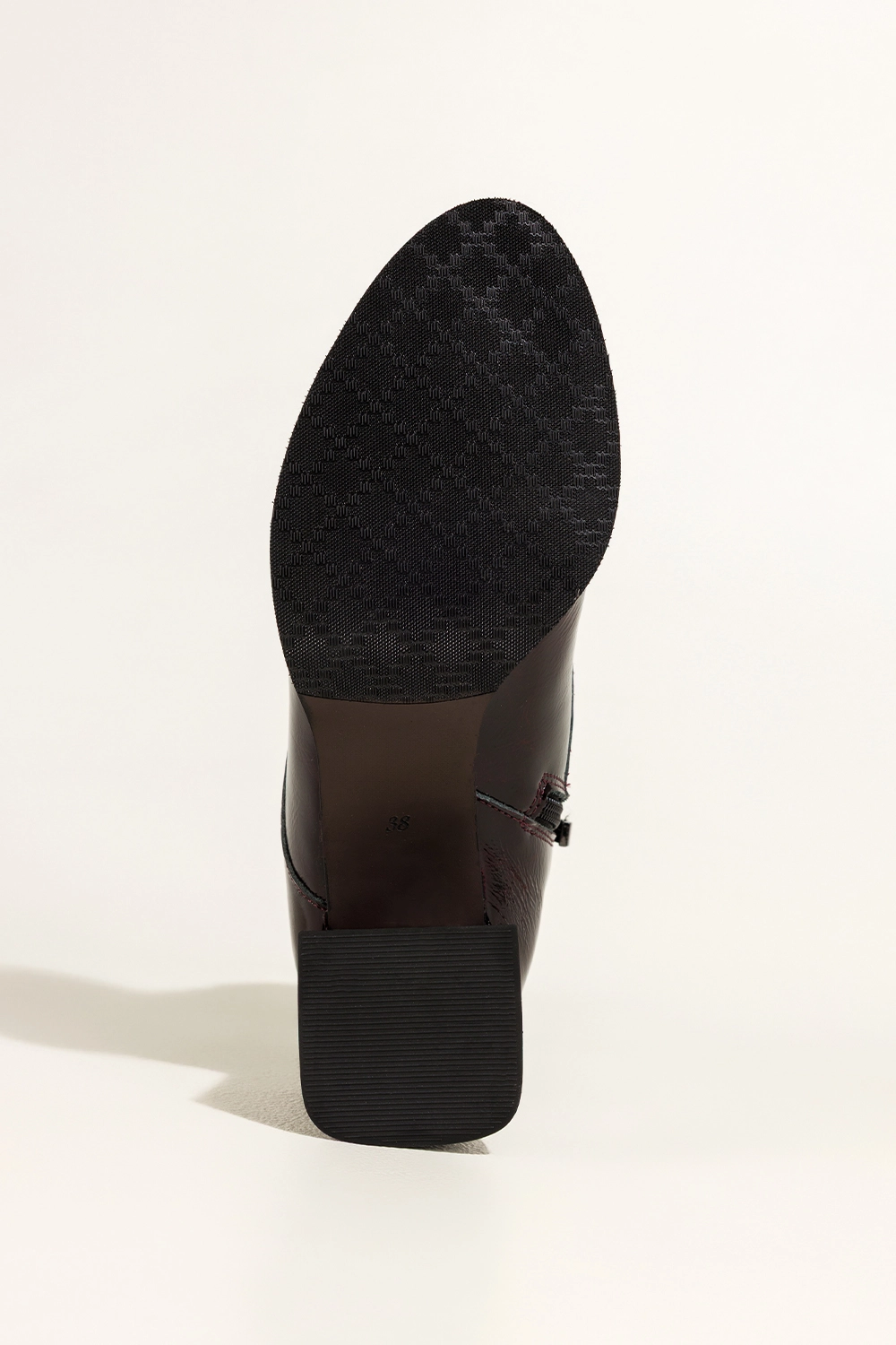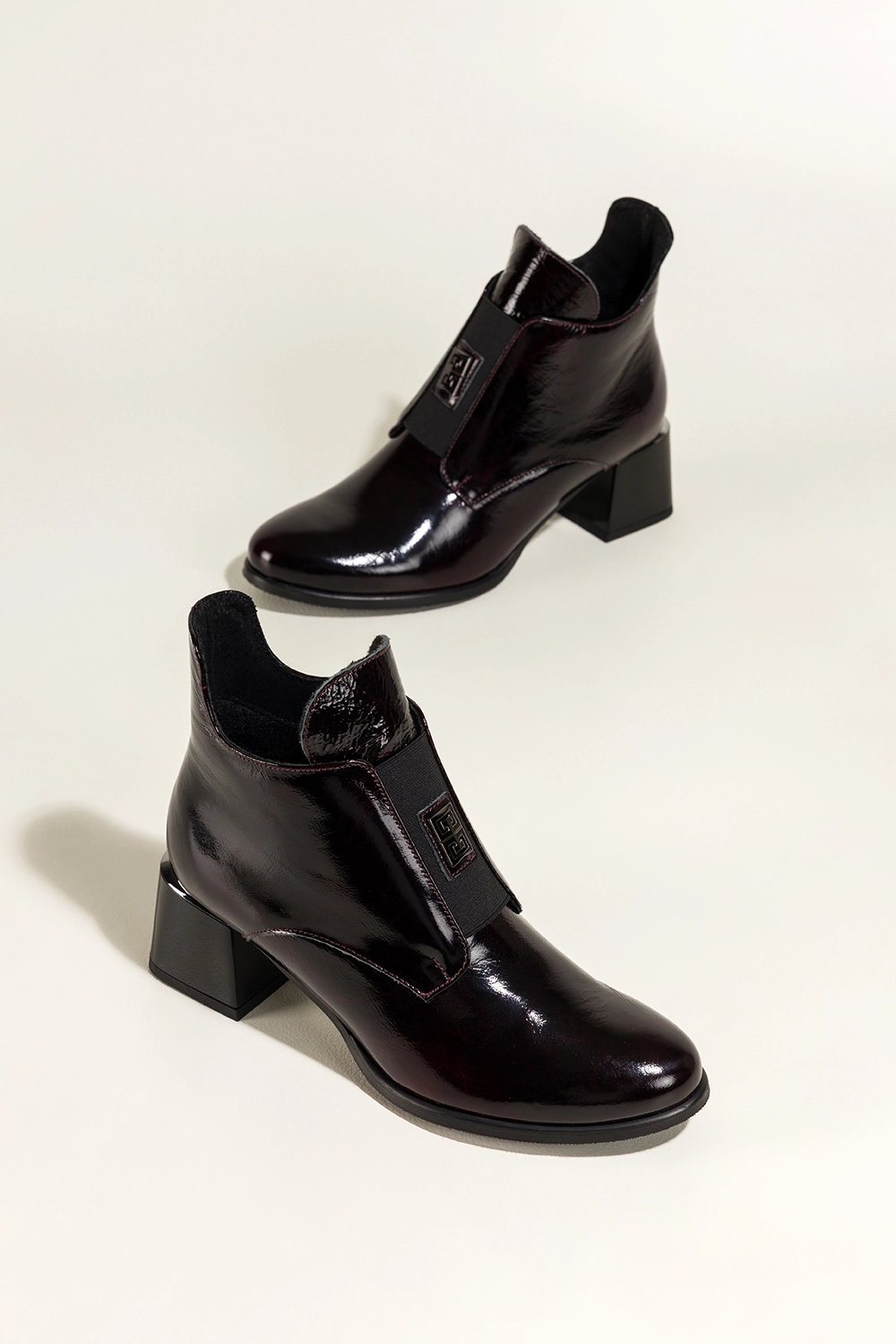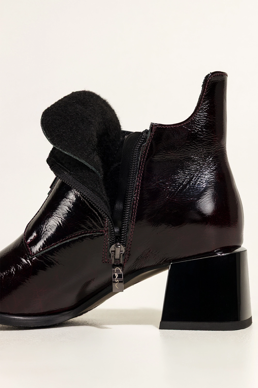 Bordowe botki skórzane damskie lakierowane na ozdobnym klocku wycięta cholewka guma z ozdobą PRODUKT POLSKI Casu model 39439. Wykonane z wysokogatunkowej, połyskującej skóry lakierowanej, zapewniają trwałość oraz spektakularny wygląd w każdej stylizacji. Miękka wkładka materiałowa i ocieplenie kocem obuwniczym gwarantują komfort nawet w chłodne dni. To buty stworzone z myślą o kobietach ceniących jakość premium i lokalną, polską produkcję.